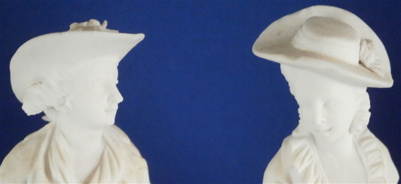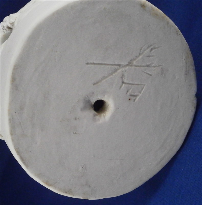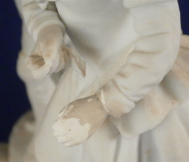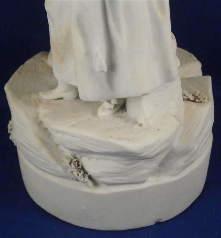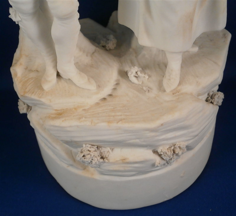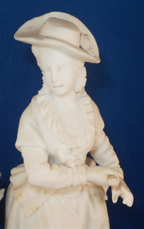 This is a figurine made by La Courtille of France around 1780. The factory was also called Rue de la Fontaine-au-Roi or Locre . The figurine is made of unglazed or biscuit porcelain and is of a couple dressed in their Sunday's best standing on a typical rock base with some greenery and the base rim underneath. The gentleman is wearing a nice hat and is holding a bird in his left hand. The lady is also wearing a nice hat and was likely holding a cane or staff in her hands which is now missing. The piece is marked underneath with their incised crossed torch mark as well as an incised monogram or letter but I am unsure what they are meant to be. The figure displays superbly but has a few minor damages - as I stated earlier there might have been a staff in her hands at some point, her left hand was off and damaged and has been reglued, some damage to bos in their hat, her blouse and the one on her shoe is missing and some minor chips to her hat and the base edge. A bit of staining that could easily be cleaned up but all in all a superb example! The figurine is 7.25 inches tall and the base has a diameter of about 3.5 inches. Please email me for more information or other pictures.