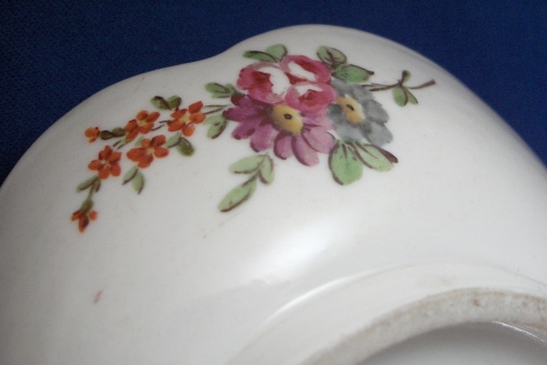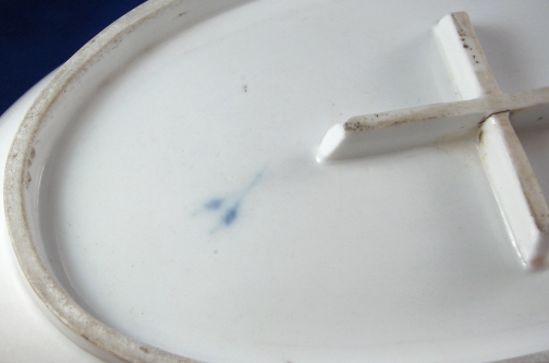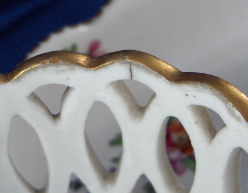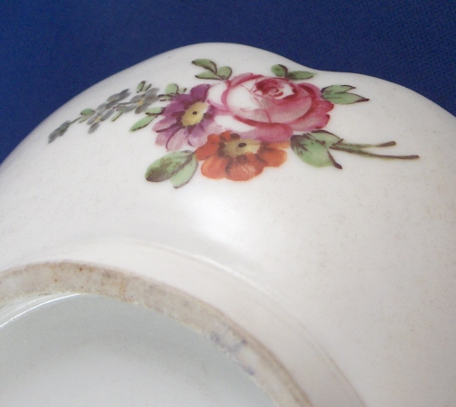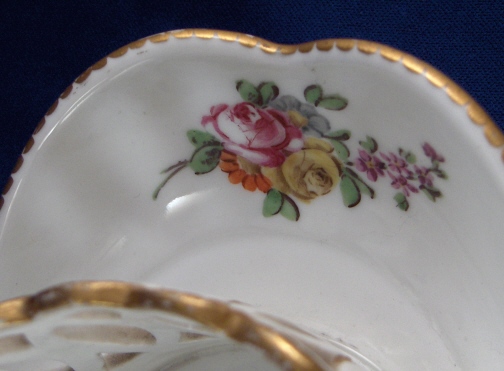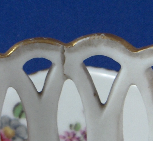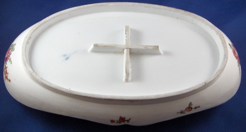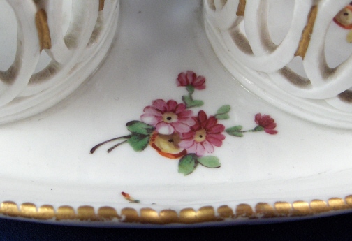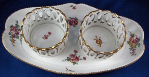 This is a tray that once held an oil and a vinegar container made by La Courtille aka Rue de la Fontaine-au-Roi or Locre in the 18th century. I wish I had the bottles but even this piece alone is very nice and maybe one day I will find the containers or someone might be looking for this tray :) The piece is nicely handpainted with a few floral arrangements inside and on the underside rim as well as some small flowers and a nice gilding. The two inside rims are nicely reticulated. The tray is in great condition with a small firing crack on the rim of one of the inside rims and a small crack on the rim of the other. Very light wear to the gilding. The tray is marked to the undersides with the underglaze blue crossed arrow mark meant to look like the Meissen swords. It is 2.75 inches tall, 10.25 inches long and 5.5 inches deep. Please email me for more information or other pictures.