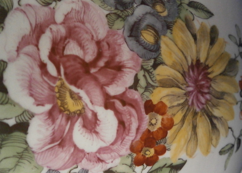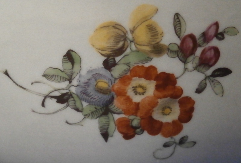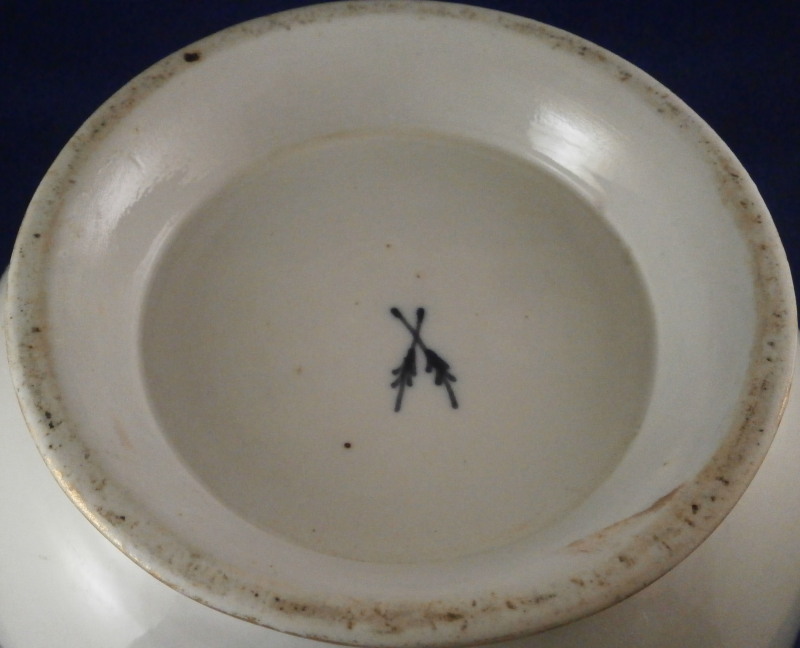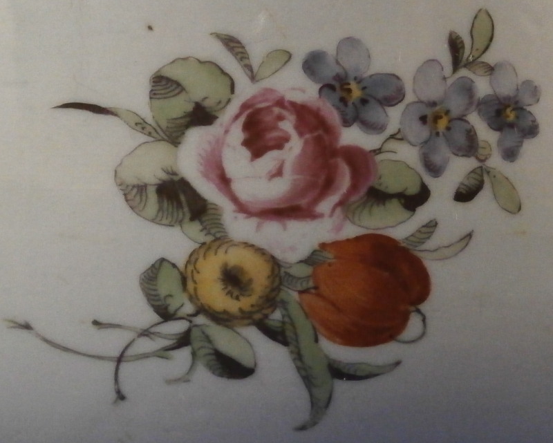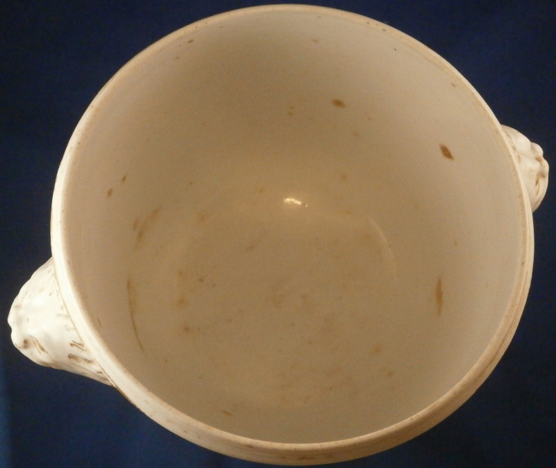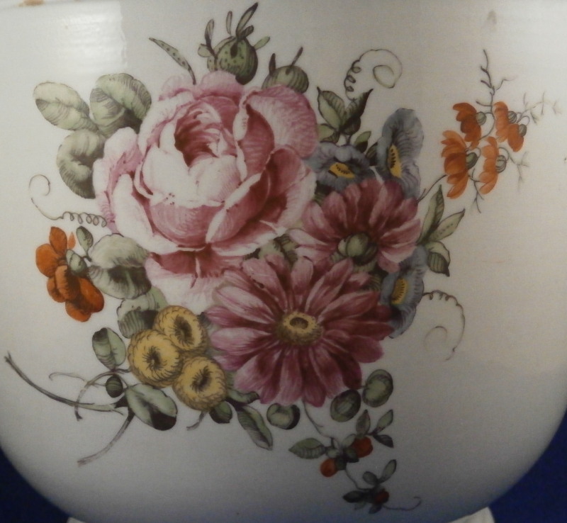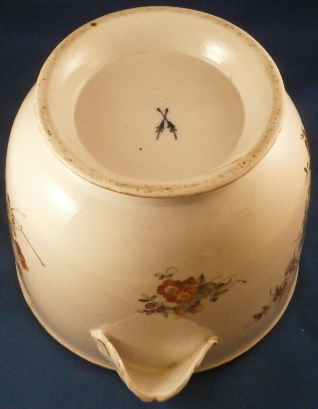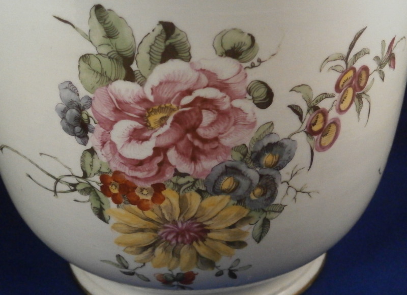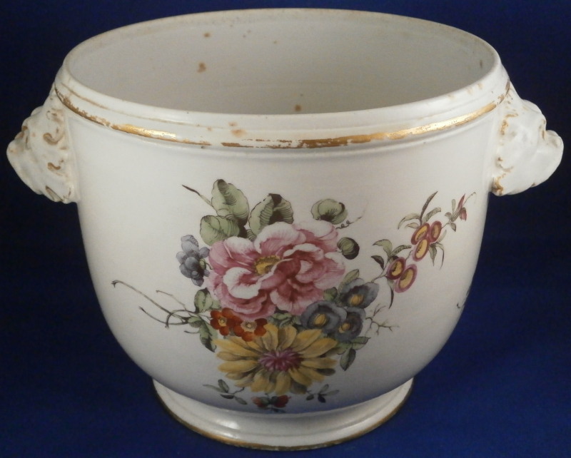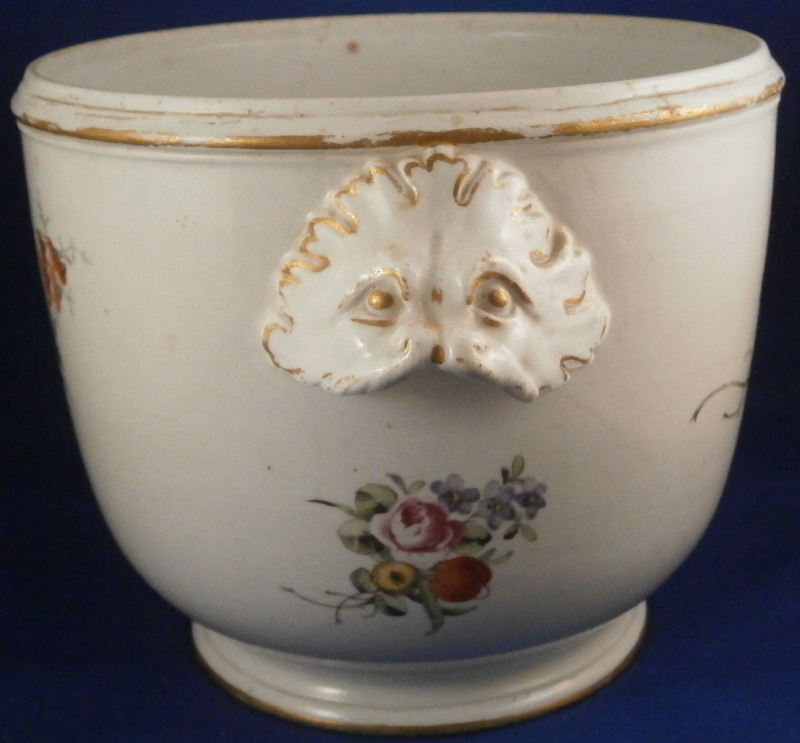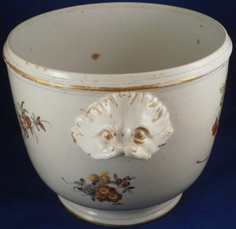 This is a really nice early jadieniere / cache pot / flower pot / wine cooler made by La Courtille aka Locre aka Rue de la Fountaine au Roi in the 18th century during their early period judging by the style and the amazing flower paintings. Likely would have been a fruit cooler though having a pair of these and both just having the bottom piece probably means it was a flower pot or such. The piece is hand painted with a large floral arrangement to the front and back which are some of the nicest I have seen by them as well as smaller ones to the sides under the handles. The handles have a nice shape to them quite typical for this period though I am not sure what they are meant to show. Some sort of animal I guess. The handles as well as the edges are highlighted with gilding. The piece is in good condition with no damage but the gilding is worn and there are some stains as shown which could be made lighted with some chemicals but I don't think that is necessary. All part of the charm of this early stuff to me! The pot is marked underneath with the under glaze blue crossed torches or arrows as shown. The piece is about 5.75 inches tall and 7 inches in diameter with the handles sticking out a bit. I'll add the second one to the site as well if anyone would like a pair. Please email me for more information or other pictures.