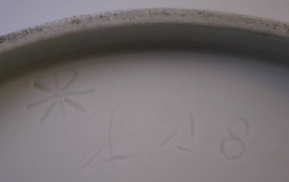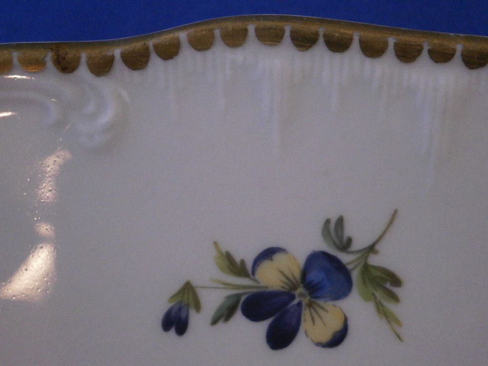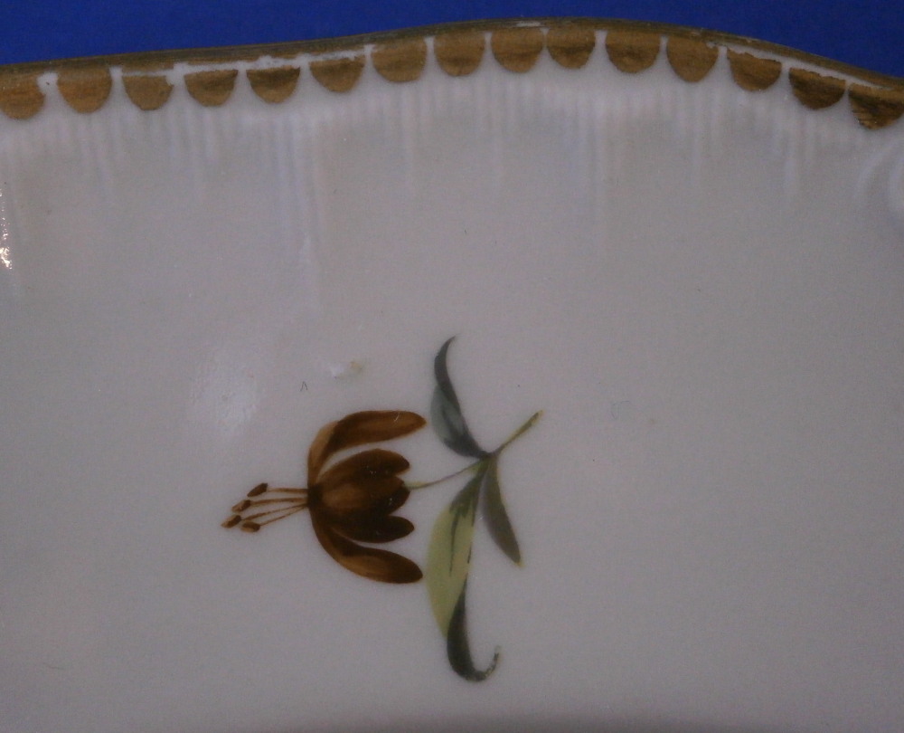 This is a superb plate made by Oude Loosdrecht between 1771 and 1784. Oude Loosdrecht was founded by Johannes de Mol in 1771 with what was left of the Weesp factory and was closed in 1784 when he died. The plate is hand painted with a really well done floral arrangement in the center as well as lots of small flowers scattered throughout. The rim has a relief design to the eedge and dentil gilding to the edge. The plate is in superb condition with the tiniest of wear but as nice as they come! A really nice looking example from this rare maker! The piece is marked with the under glaze blue M.o.L mark as well as the usual incised star plus some other numbers and letters as shown. An unusually well marked example! The plate is 1.375 inches tall and just under 10 inches in diameter. Please email me for more information or other pictures.
