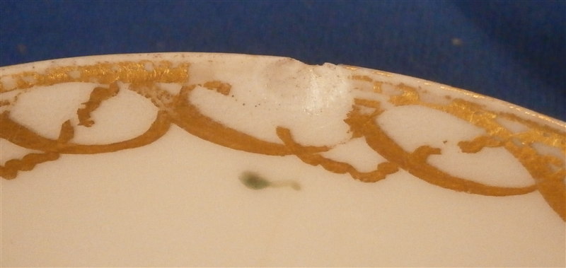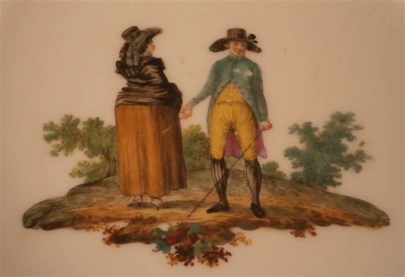This is a saucer made by Oude Loosdrecht between 1771 and 1784. Oude Loosdrecht was founded by Johannes de Mol in 1771 with what was left of the Weesp factory and was closed in 1784 when he died. The saucer is handpainted in colos with a superb scene in the center of a gentleman and a lady surrounded by a andscape scene with three small flowers around that and a nice gold trim. The saucer is in great condition with a little wear/paint flaking to the scene and some wear to the gold trim. There is one small rim chip that would be an easy fix. This rare piece still displays perfectly and is not something you will find again. The piece is marked faintly with the underglaze blue M.o.L as well as an incised star anda script L 1 (I think) underneath. It is 1 inch tall and 5 inches in diameter. Please email me for more information or other pictures.