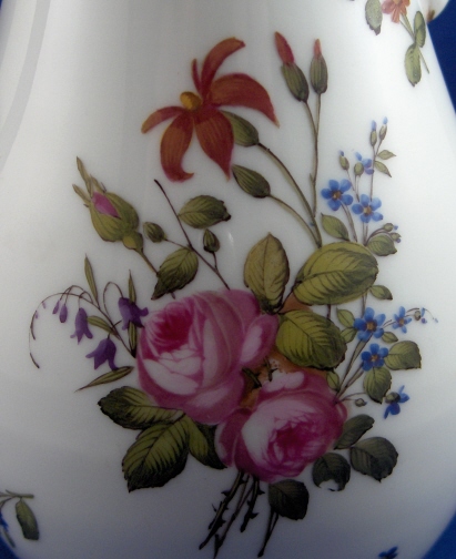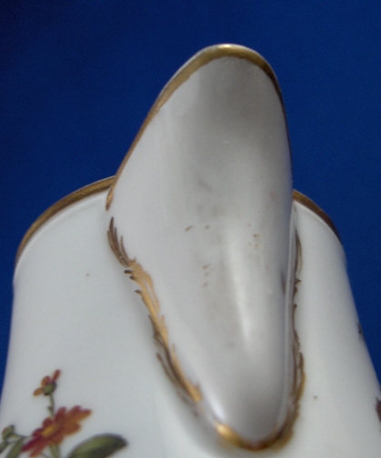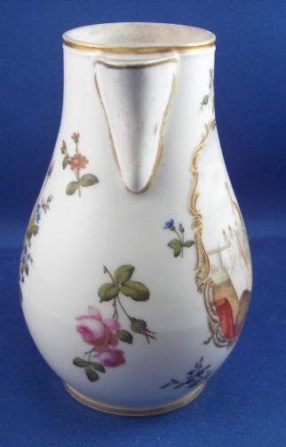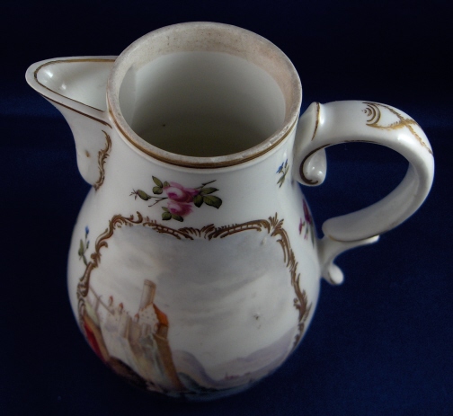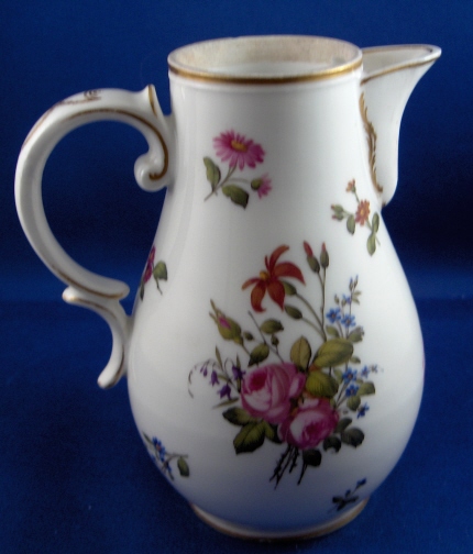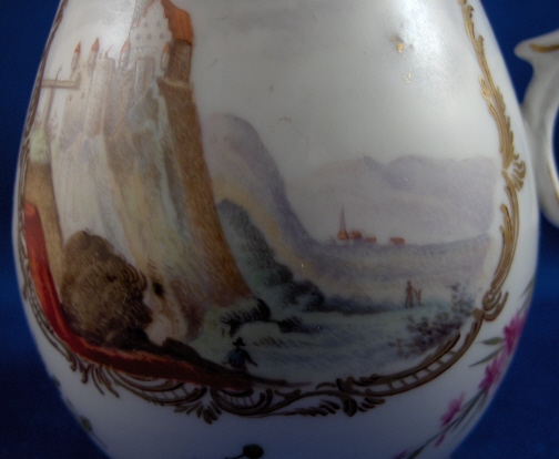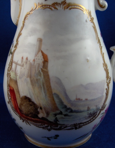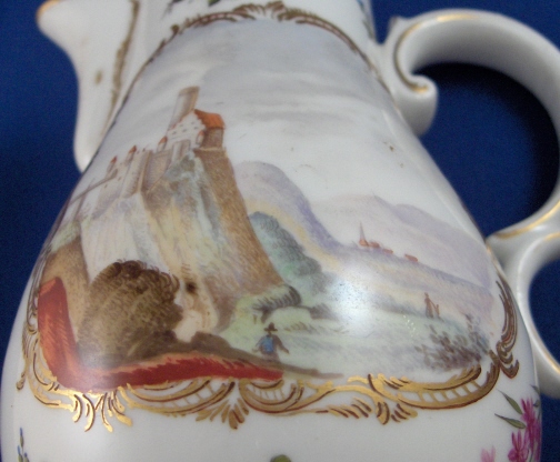 This is a coffee pot made by Oude Loosdrecht between 1771 and 1784. Oude Loosdrecht was founded by Johannes de Mol in 1771 with what was left of the Weesp factory and was closed in 1784 when he died. The pot is handpainted with a superb scene of castle Lichtenstein near Tuebingen on a cliff with the town in the background and some people scattered around the landscape. Nice gold trim surrounding the scene. The other side has a large floral arrangement painted on it and there are scattered smaller flowers all around. Gold trim to top, bottom, spout and handle. The pot is a superb example and in good condition with a very good repair to the spout and the handle. Also the lid is missing. The piece is marked with the underglaze blue MoL underneath as well as the incised M:OL and an incised L48. It is 5.25 inches tall, 4.25 inches long and 3.5 inches wide. Please email me for more information or other pictures.