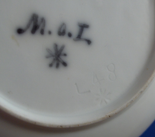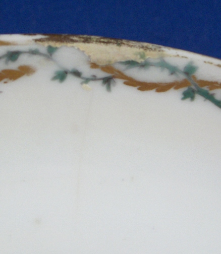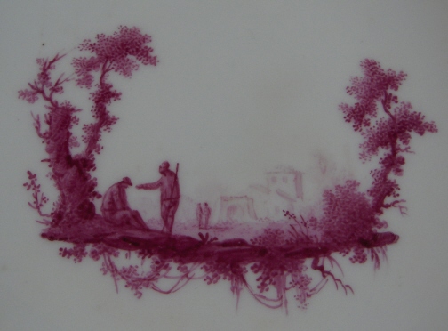 This is a saucer made by Oude Loosdrecht between 1771 and 1784. Oude Loosdrecht was founded by Johannes de Mol in 1771 with what was left of the Weesp factory and was closed in 1784 when he died. The saucer is handpainted with a superb puce landscape scene and a nice green leaf and gold trim to the rim area. Likely painted by the famous Duvivier who was all over the place. This saucer is a superb example of the quality they made. It is in good condition with two small repairs to the rim from which one hairline goes towards the center. It is very faint so doesn't bother me at all. A bit of wear to the gold trim on the rim. The piece is marked with the underglaze blue M.o.L underneath as well as a star and an incised L48 with a star underneath. It is 1 inch tall and 5 inches in diameter. Please email me for more information or other pictures.