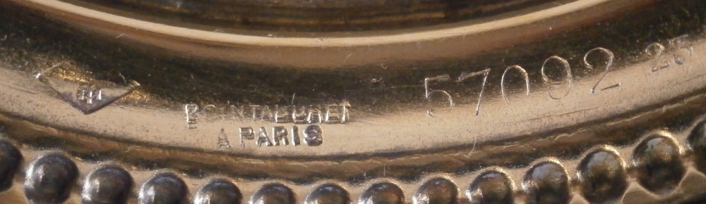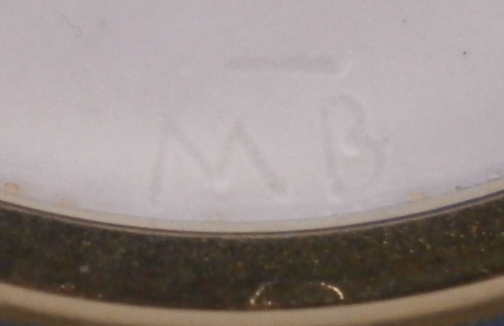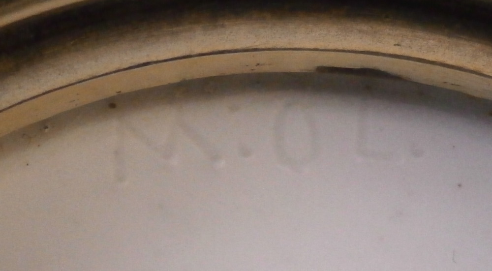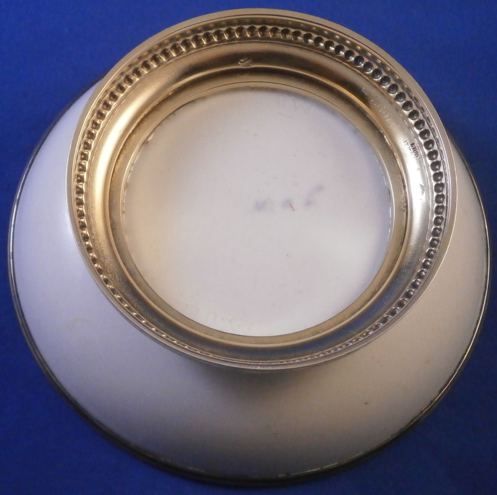 This is a saucer made by Oude Loosdrecht between 1771 and 1784. Oude Loosdrecht was founded by Johannes de Mol in 1771 with what was left of the Weesp factory and was closed in 1784 when he died. The saucer was made into a little dish by adding silver mounts to it. The silver mounts are marked (as far as I can tell) for Boin Taburet from Paris between 1880 and 1919 as well as for 950 silver. The porcelain is nicely hand painted with a nice rim design as well as a large floral arrangement in the center and three leaves covering the area in between. It is in superb condition with some tarnishing to the silver. A really nice looking example from this rare maker! The piece is marked with the under glaze blue M.o.L mark as well as the usual incised marks including MoL as shown. The dish is just over 1.625 inches tall and 4.75 inches in diameter. Please email me for more information or other pictures.