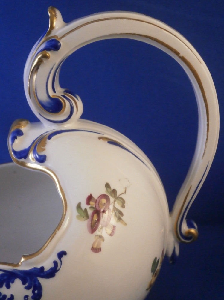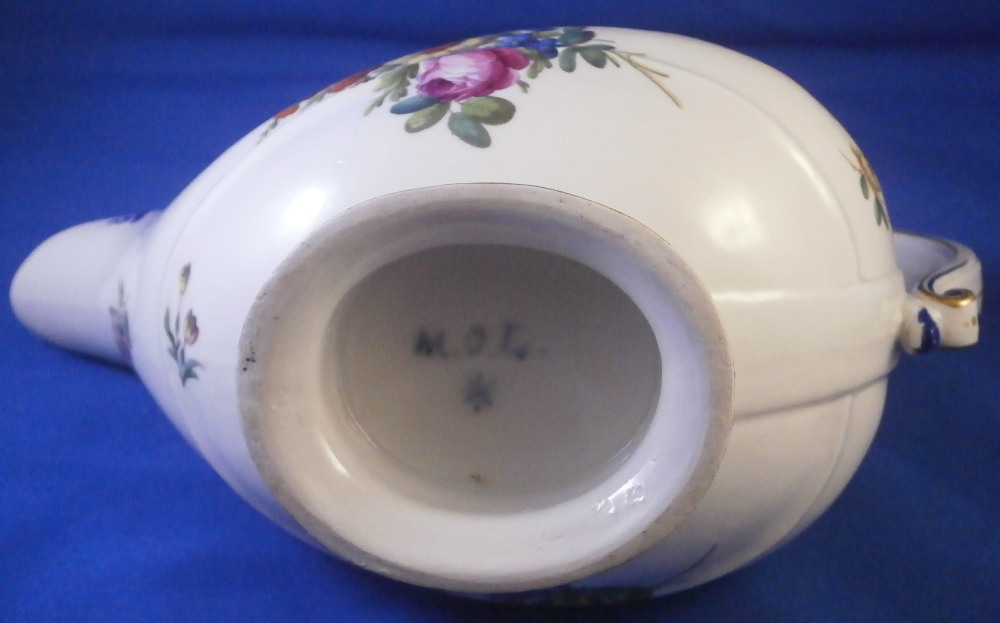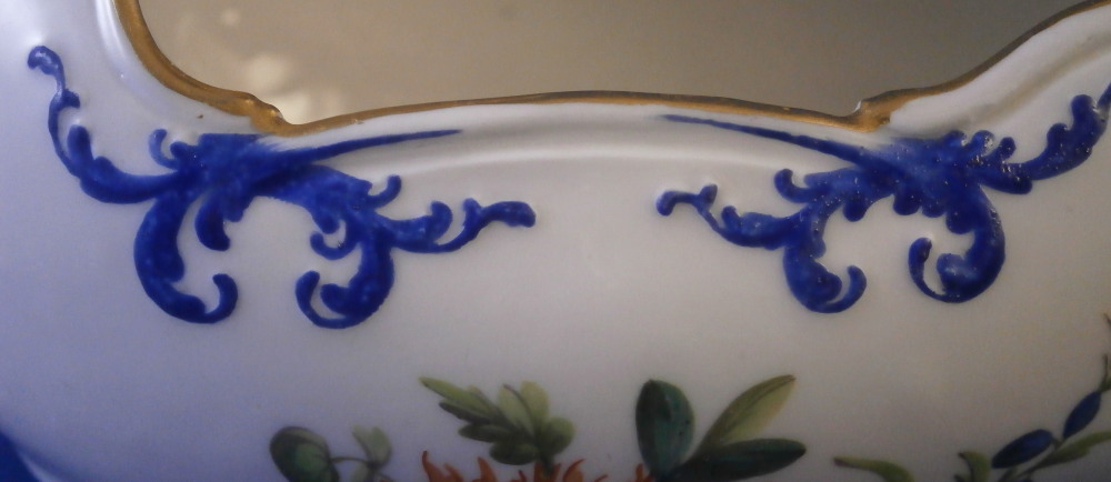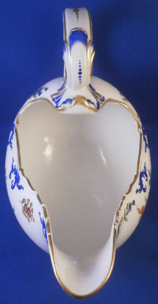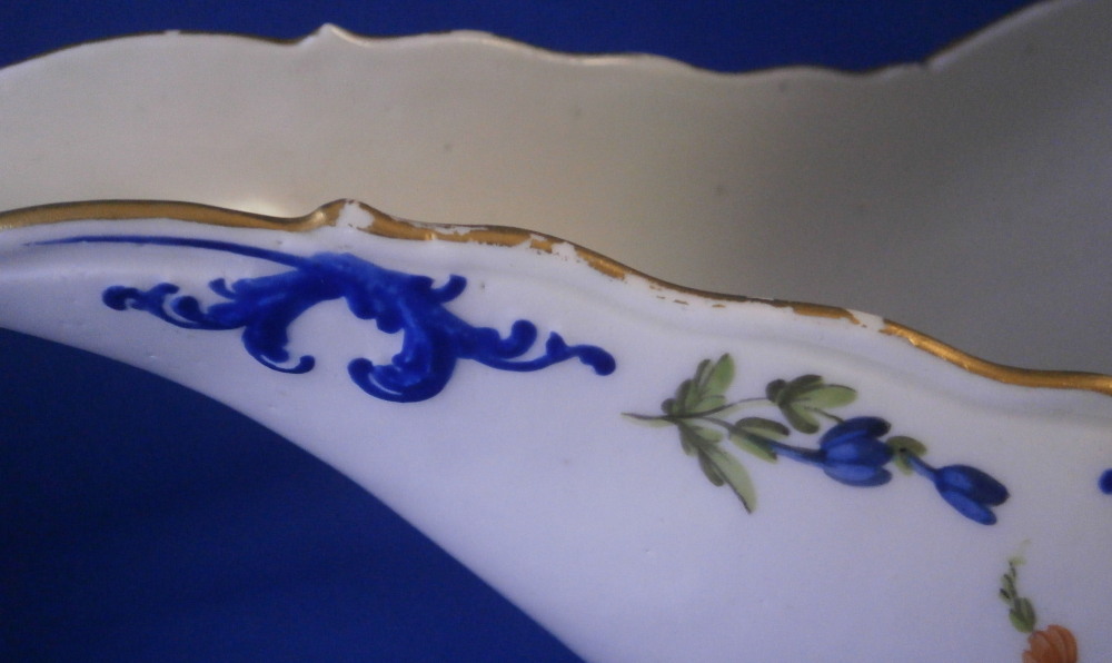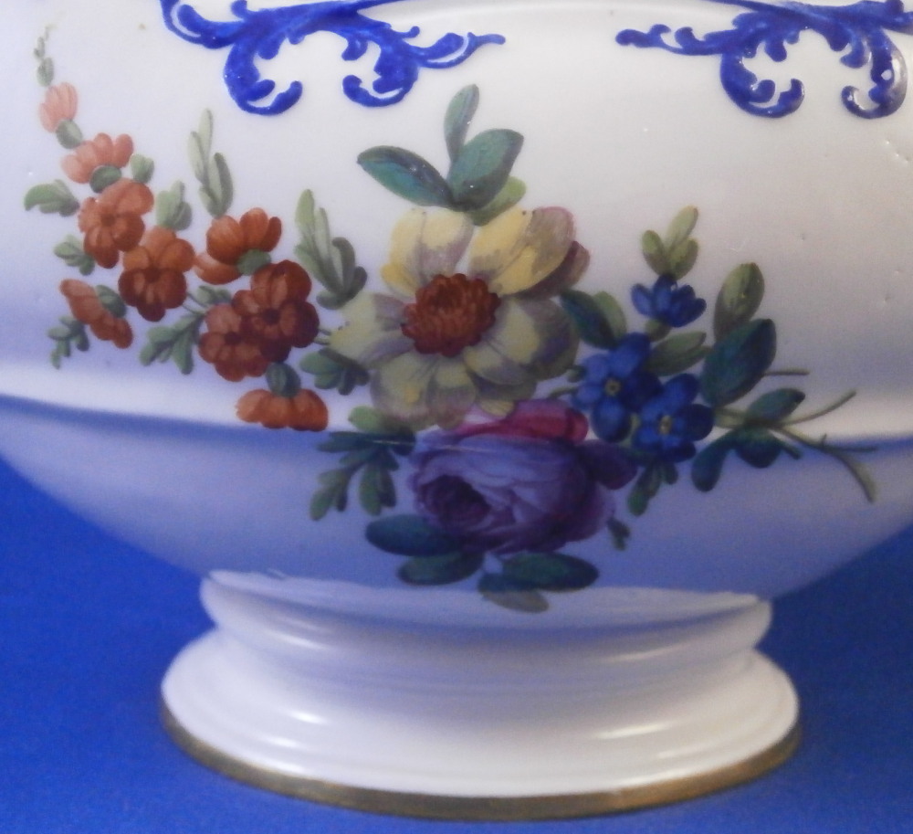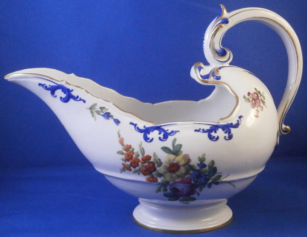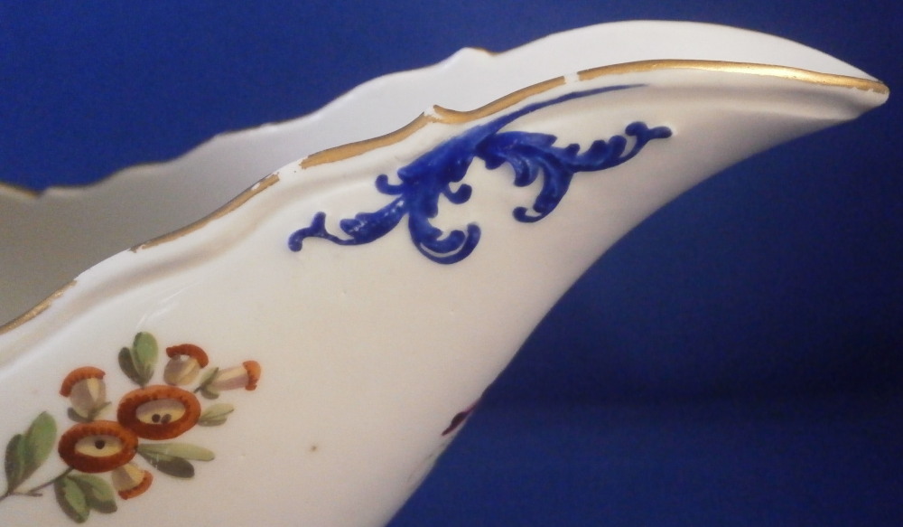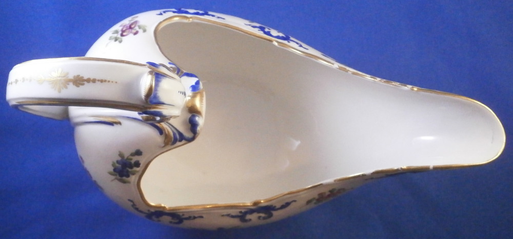 This is a superb gravy boat / sauce dish made by Loosdrecht in about 1780. Oude Loosdrecht was founded by Johannes de Mol in 1771 with what was left of the Weesp factory and was closed in 1784 when he died. The dish has a really nice shape to it with a scroll handle to one side with the details highlighted by a nice blue and gold trim. A gold design to the flat part towards the top. The main body has a relief festoon design to the outside highlighted with that same nice blue color. There is a large hand painted floral arrangement to both the front and back side with six smaller flowers and a leaf filling in the rest of the space. Gold trim to the edges. A very elegant and rare example! Definitely the nicest I have come across. The piece is marked underneath with their blue MoL mark as shown as well as an incised star and MoL and some other incised marks as shown. The condition is superb with just some wear to the gold trim along the high points of the top edge as shown. A small firing flaw to the inside of the tip as shown. Displays superbly and you won't find a nicer one anytime soon! The sauciere is 5.75 inches tall including the handle, about 8 inches long and 4 inches wide. An amazing and very rare example for this maker. Please email me for more information or other pictures.