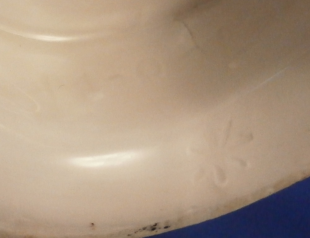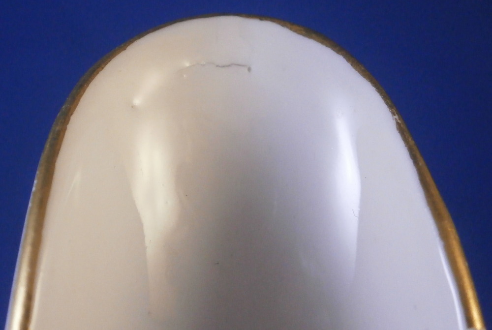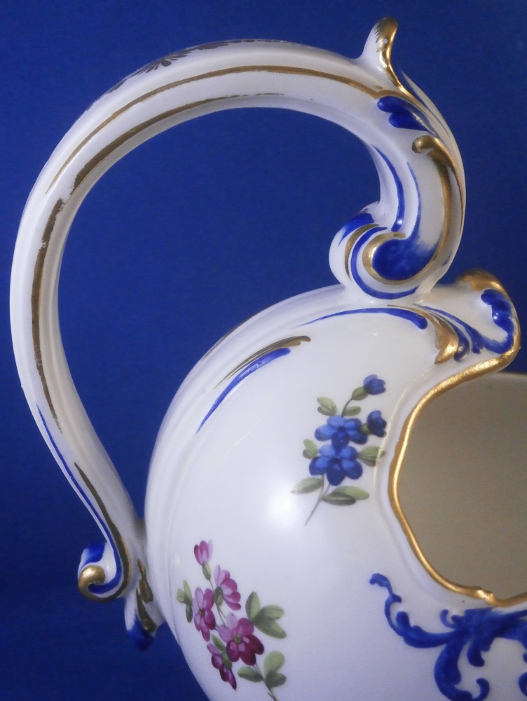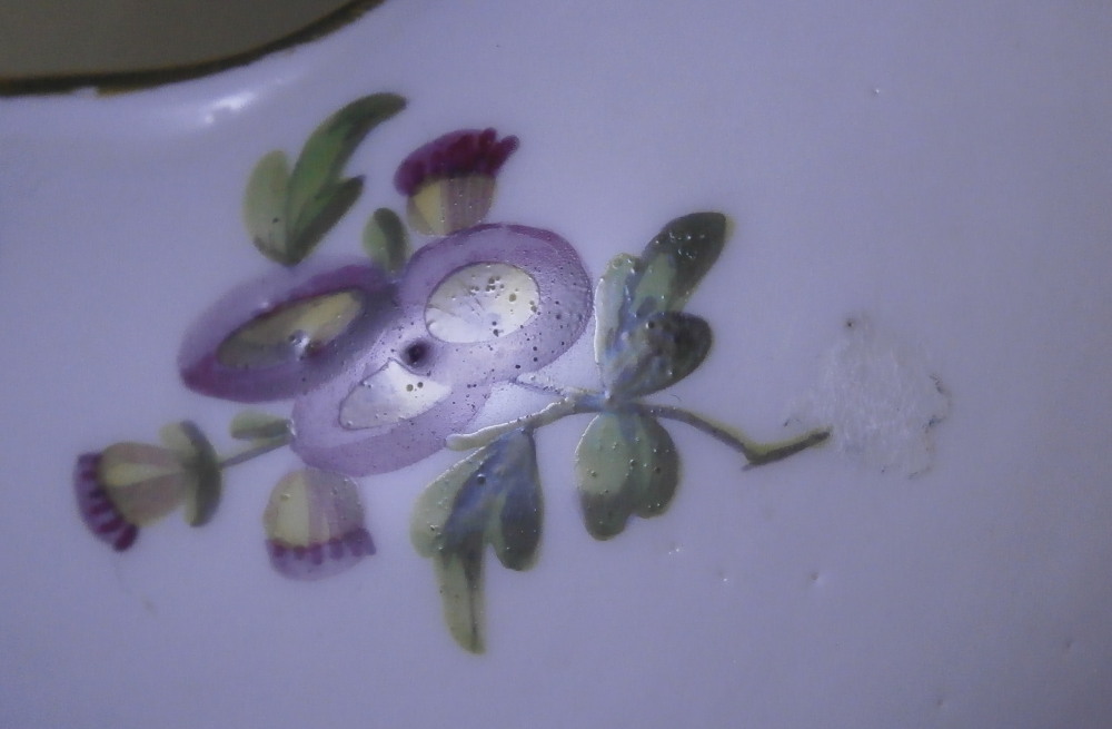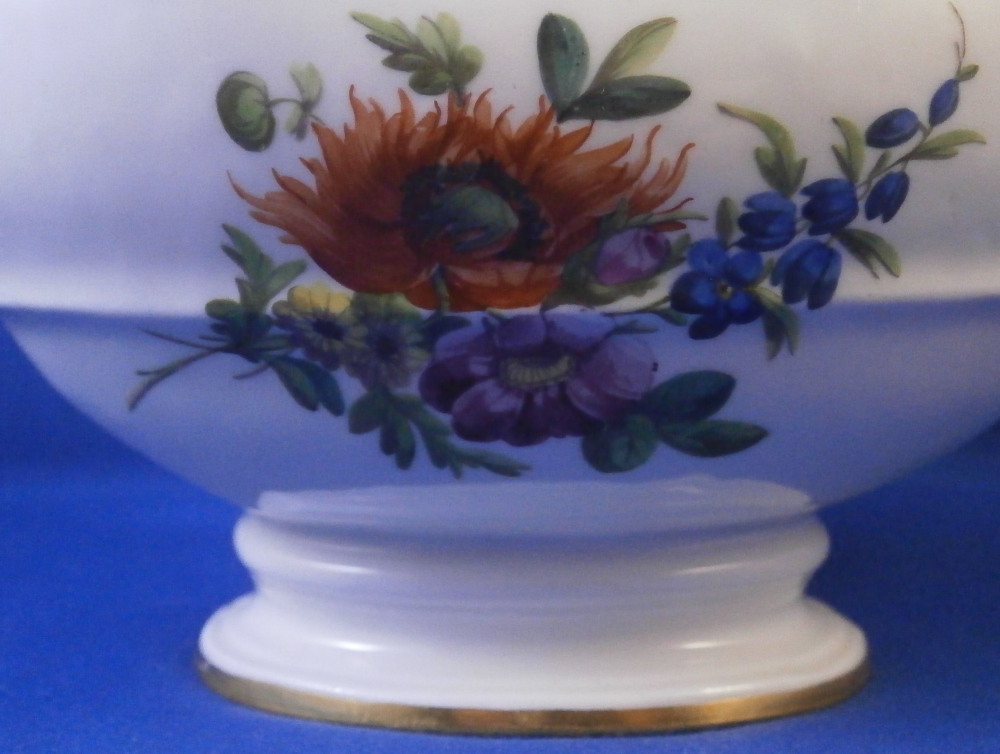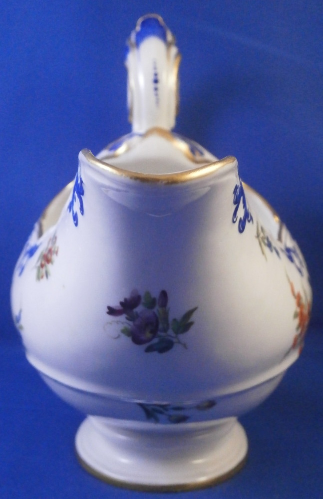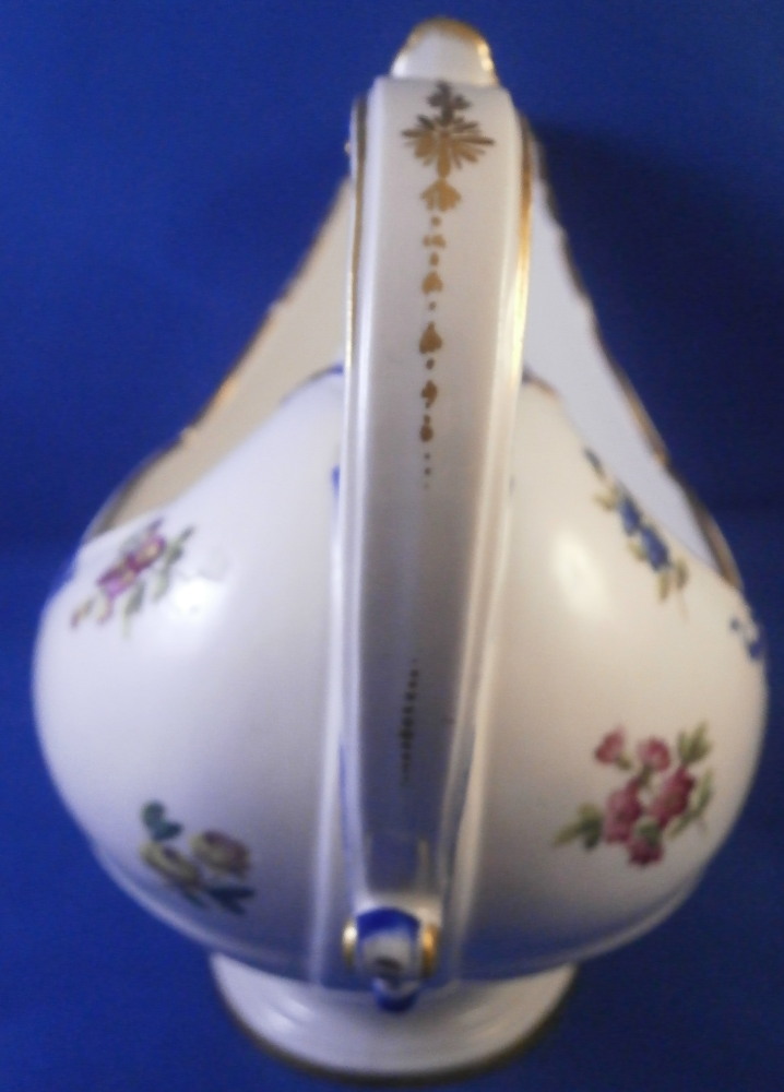 This is a superb gravy boat / sauce dish made by Loosdrecht in about 1780. Oude Loosdrecht was founded by Johannes de Mol in 1771 with what was left of the Weesp factory and was closed in 1784 when he died. The dish has a really nice shape to it with a scroll handle to one side with the details highlighted by a nice blue and gold trim. A gold design to the flat part towards the top. The main body has a relief festoon design to the outside highlighted with that same nice blue color. There is a large hand painted floral arrangement to both the front and back side with six smaller flowers and a leaf filling in the rest of the space. Gold trim to the edges. A very elegant and rare example! Definitely the nicest I have come across. The piece is marked underneath with their blue MoL mark as shown as well as an incised star and MoL and some other incised marks as shown. The condition is superb with just some wear to the gold trim along the high points of the top edge as shown. A small firing flaw to the inside of the tip as shown. Displays superbly and you won't find a nicer one anytime soon! The sauciere is 5.75 inches tall including the handle, about 8 inches long and 4 inches wide. An amazing and very rare example for this maker. Please email me for more information or other pictures.