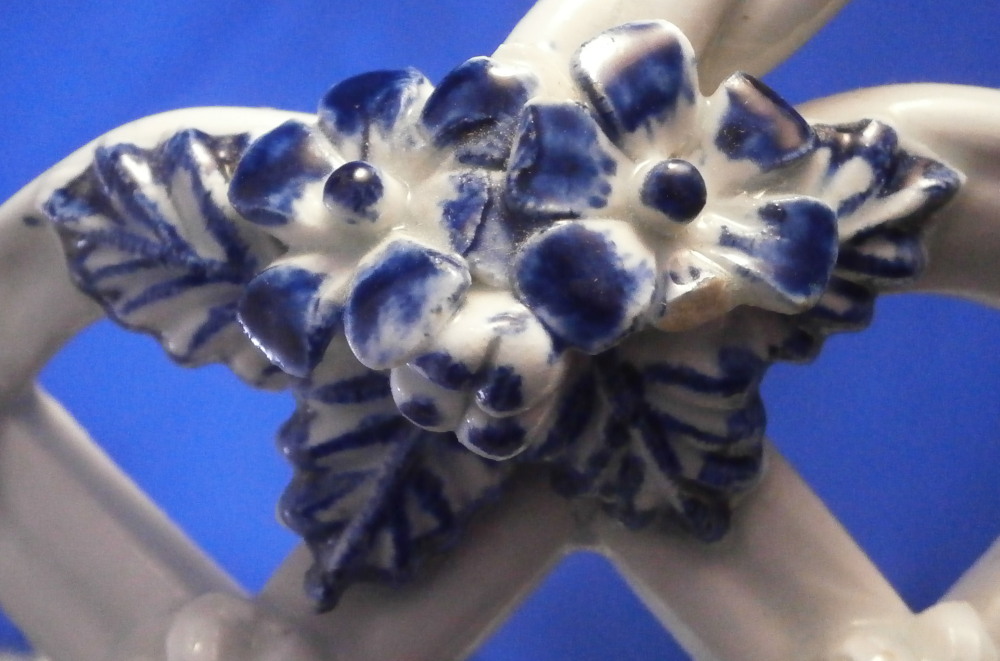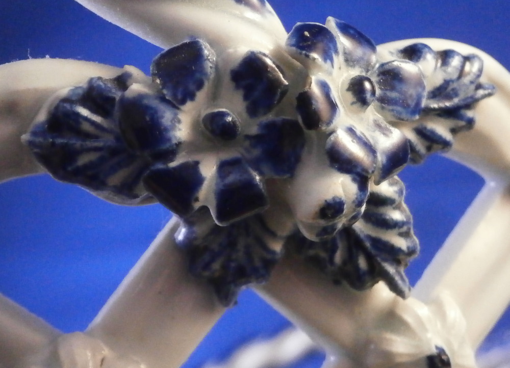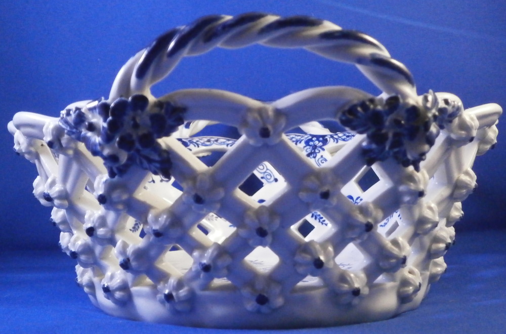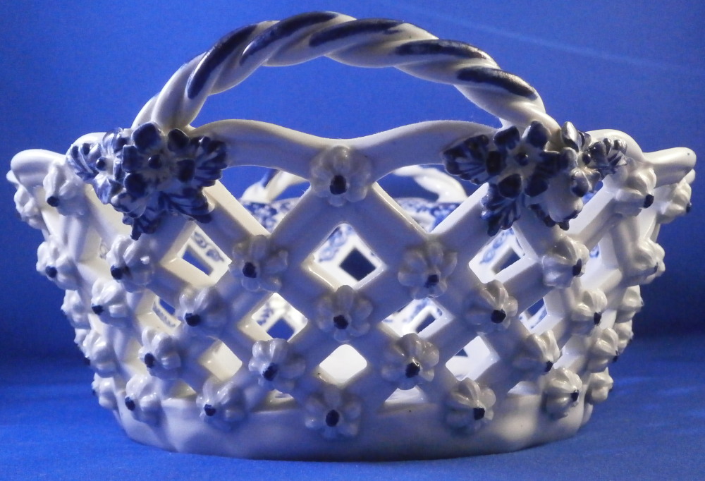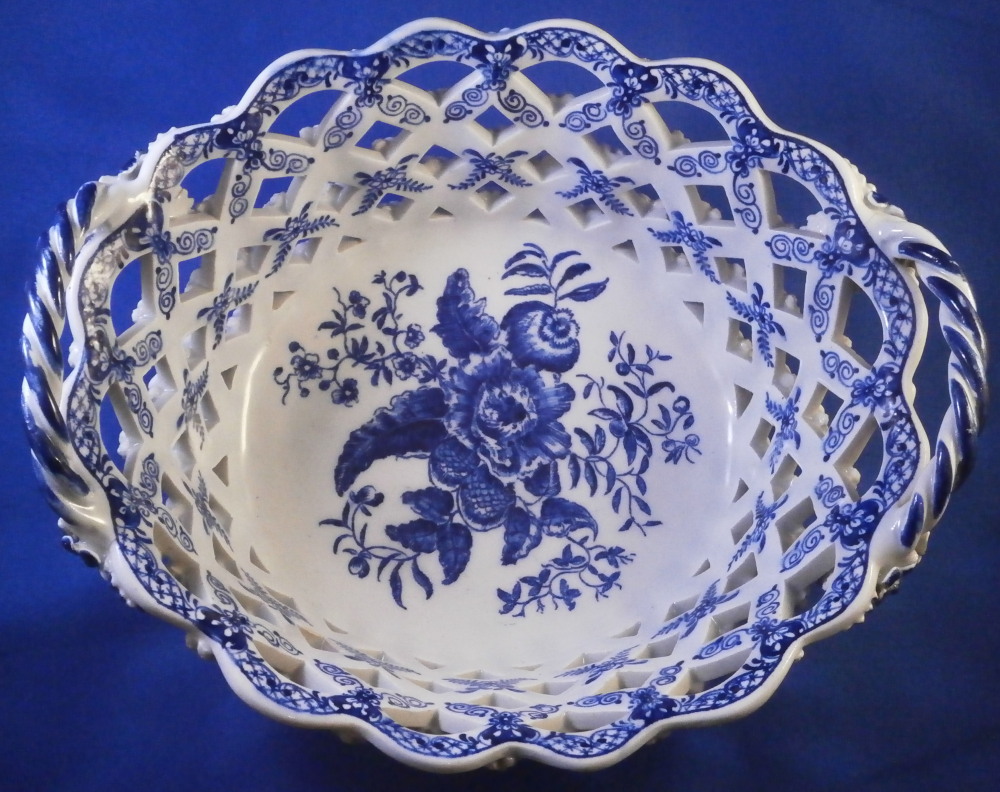 This is a superb chestnut basket made by Lowestoft in the 18th century. Looks very much like the Worcester model except for an extra round of decoration to the inside lattice lower part. The piece is decorated with the pinecone pattern in under glaze blue and has reticulated sides in a lattice pattern with applied flowers on the intersections. A rope twist handle to either side with the terminals having moulded flowers and leaves to them. Nice blue designs to the inside rim and lower part as shown. A really nice example, the nicely sized version and in great condition! Only one petal of one of the applied flowers is chipped and thee are two minor firing cracks near the handles which are glazed over. Not really damage but manufacturing flaws common to these early pieces! The inside decoration along the lattice is nice and crisp! As nice an example as you can find! The basket is unmarked which is the norm for this maker and time period. The piece is about 3.75 inches tall including the handles, 8.875 inches wide and 7.5 inches deep. Please email me for more information or other pictures.