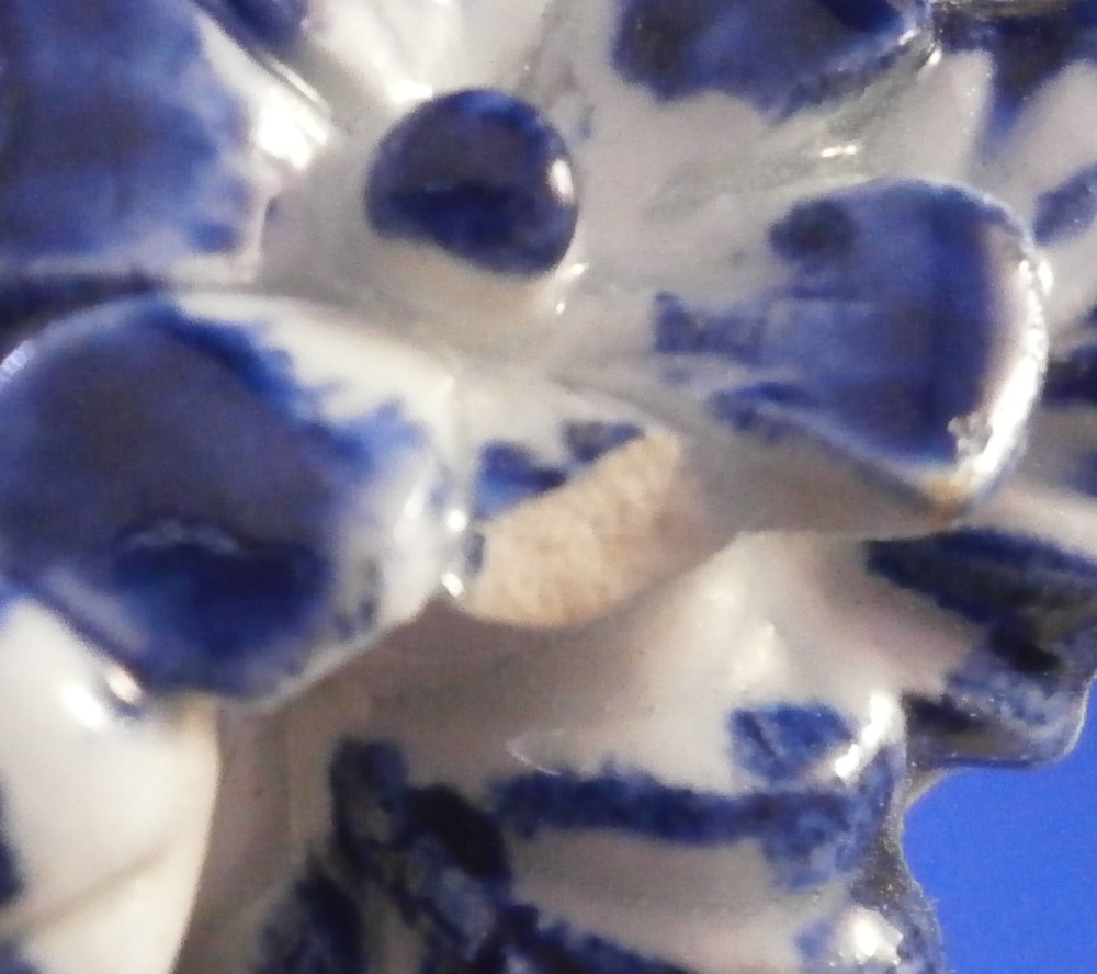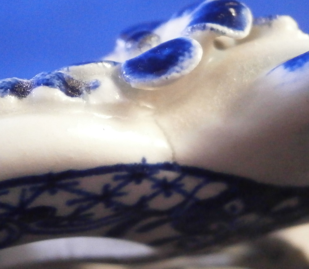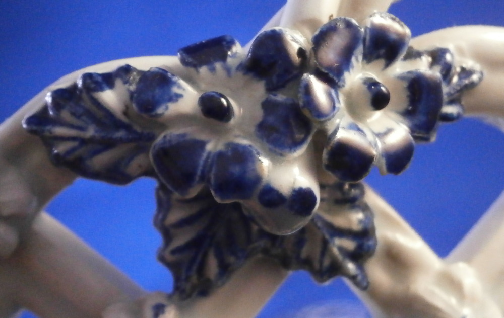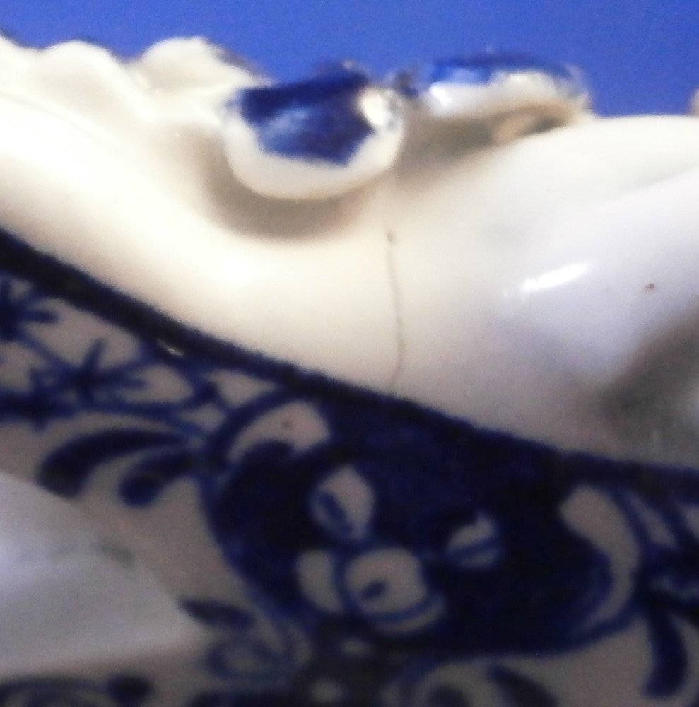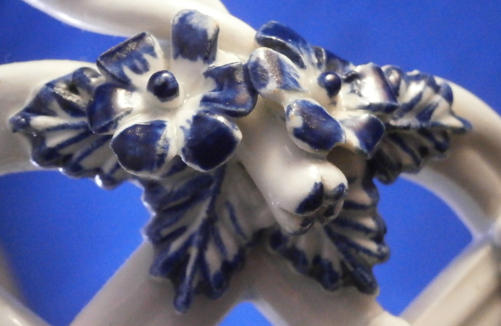This is a superb chestnut basket made by Lowestoft in the 18th century. Looks very much like the Worcester model except for an extra round of decoration to the inside lattice lower part. The piece is decorated with the pinecone pattern in under glaze blue and has reticulated sides in a lattice pattern with applied flowers on the intersections. A rope twist handle to either side with the terminals having moulded flowers and leaves to them. Nice blue designs to the inside rim and lower part as shown. A really nice example, the nicely sized version and in great condition! Only one petal of one of the applied flowers is chipped and thee are two minor firing cracks near the handles which are glazed over. Not really damage but manufacturing flaws common to these early pieces! The inside decoration along the lattice is nice and crisp! As nice an example as you can find! The basket is unmarked which is the norm for this maker and time period. The piece is about 3.75 inches tall including the handles, 8.875 inches wide and 7.5 inches deep. Please email me for more information or other pictures.