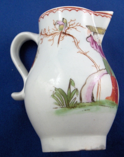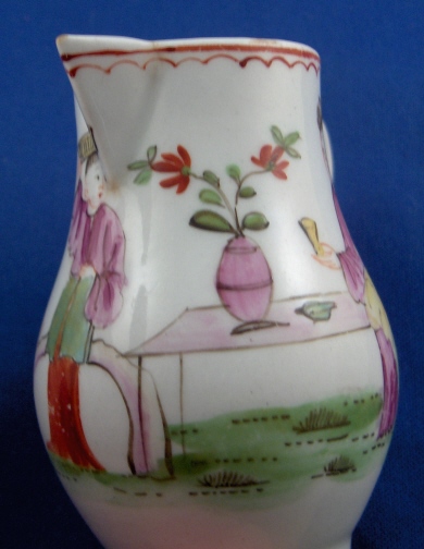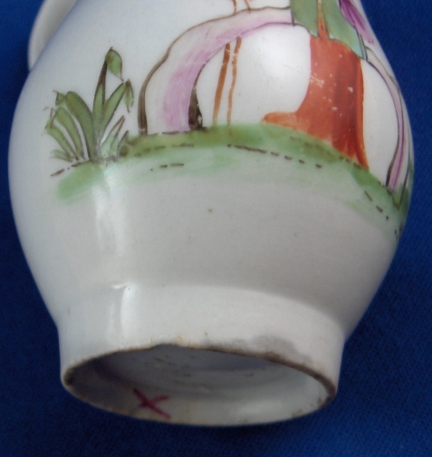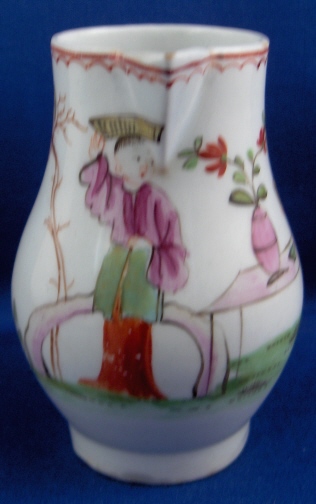 This is a rare creamer made Lowestoft in the 18th century. This was one of the top makers back then and is quite uncommon and a collector must have :) It is superbly painted with a chinoiserie design all around as well as a red trim to the top. Typical handle shape with the "kick" out on the bottom. The creamer is in superb condition with a little wear and some very minor chipping to the footring from the making. The piece is marked with a pink X which unusual likely a painter's mark or something along those lines. The little guy is 3.125 inches tall and 2.125 inches in diameter. Please email me for more information or other pictures.