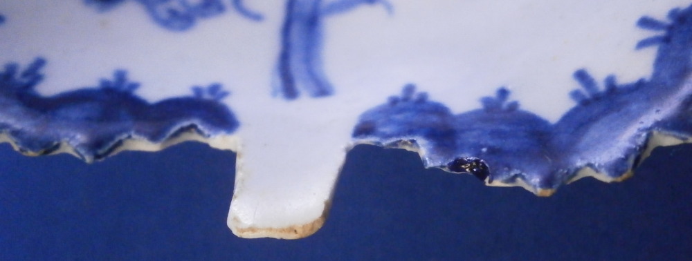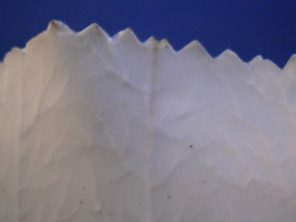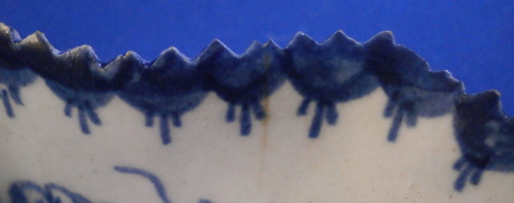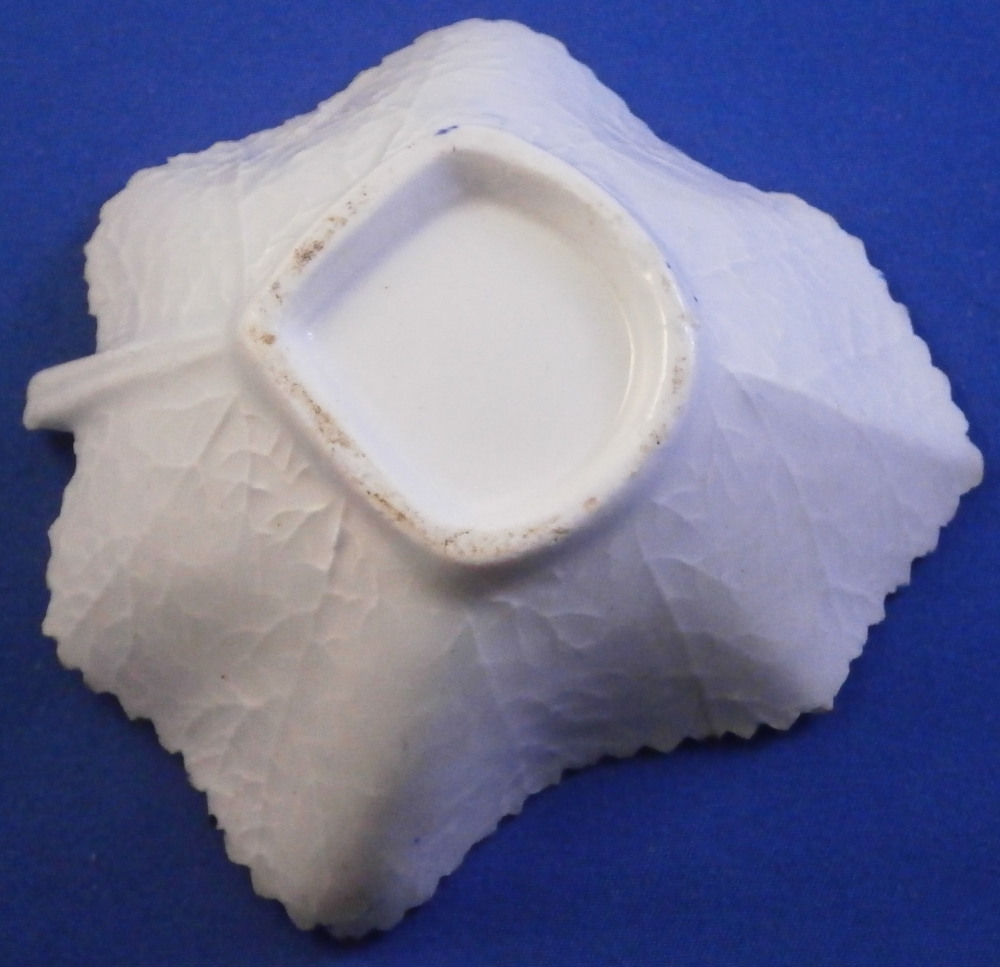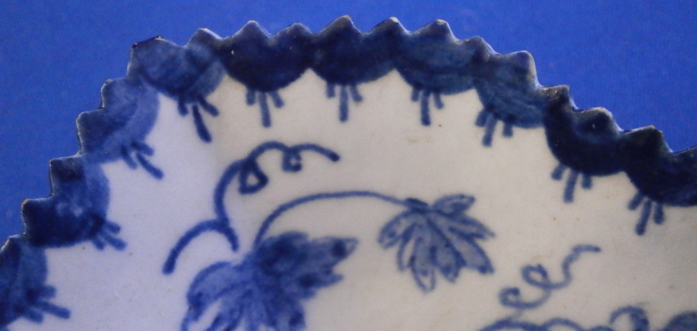 This is a little leaf shaped pickle dish made by Lowestoft in the 18th century. Modeled in the shape of a wine leaf with veins in relief to the underside edge. A cute and delicate dish that is hand painted with a blue design of a fruiting vine branch including the grapes and leaves. Serrated edge with blue trim to it. The dish is in great condition with a short hairline to one side as shown that is stable and doesn't take away from the piece. A few very minor nibbles to the edge but it displays superbly and looks great. It is unmarked which is the norm for this maker and time period. The piece is about 1.125 inches tall, 3.75 inches wide and 3.625 inches long. Please email me for more information or other pictures.