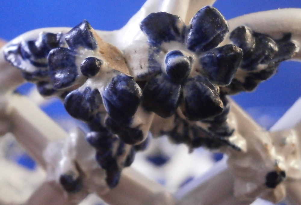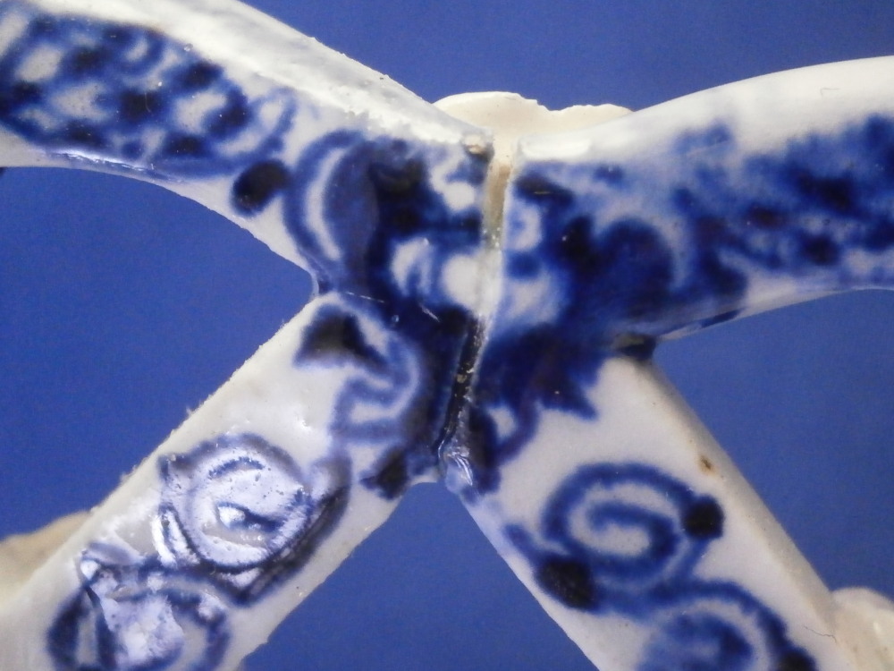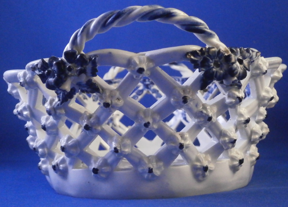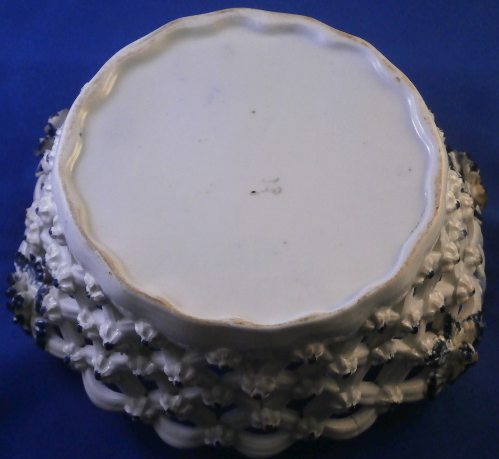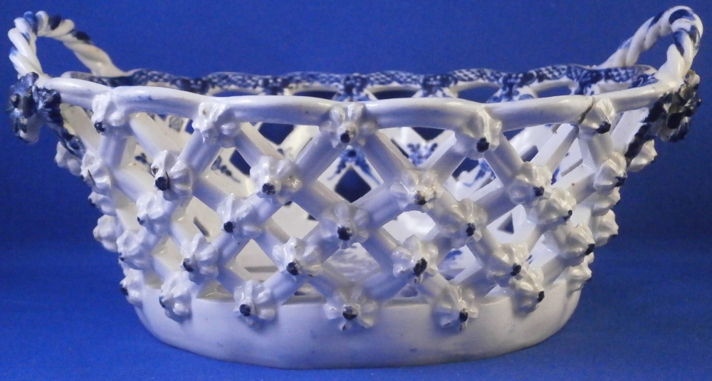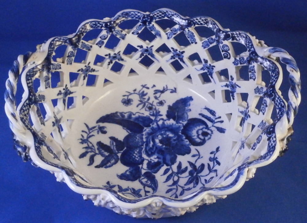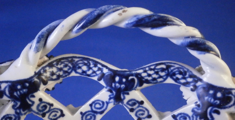 This is a superb chestnut basket made by Lowestoft in the 18th century. A smaller version that the other one I have up for sale. Looks very much like the Worcester model except for an extra round of decoration to the inside lattice lower part. The piece is decorated with the pinecone pattern in under glaze blue and has reticulated sides in a lattice pattern with applied flowers on the intersections. A rope twist handle to either side with the terminals having moulded flowers and leaves to them. Nice blue designs to the inside rim and lower part as shown. A really nice example and in pretty nice condition though not perfect. There are three splits to the top edge where the paste shrank too much during the firing process. This is not later damage but from when it was made. There is also a flower petal chipped off on one terminal of each of the handles. Impossible to spot when on display but I like to be very thorough. One of the applied flowers is missing its blue center. Not damage but the painter must have missed it. The inside decoration along the lattice is nice and crisp! A very nice example for this maker. The basket is unmarked which is the norm for this maker and time period. The piece is about 3.25 inches tall including the handles, 6.875 inches wide and 6.125 inches deep. Please email me for more information or other pictures.