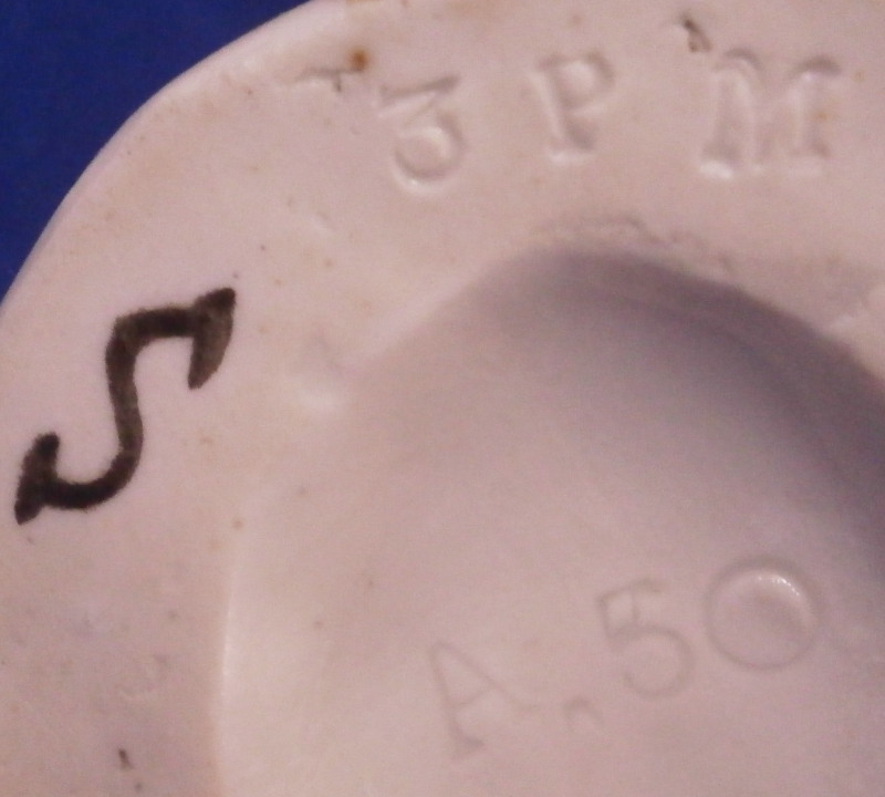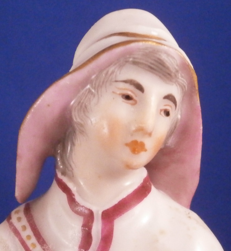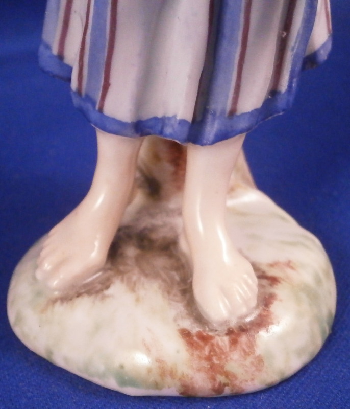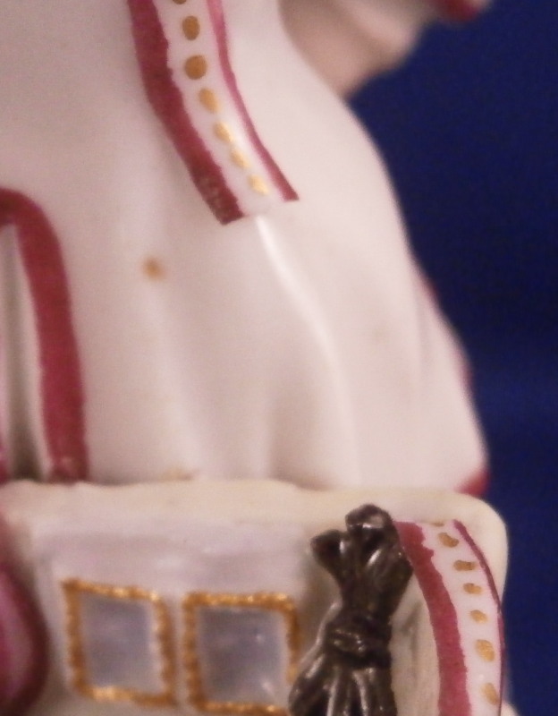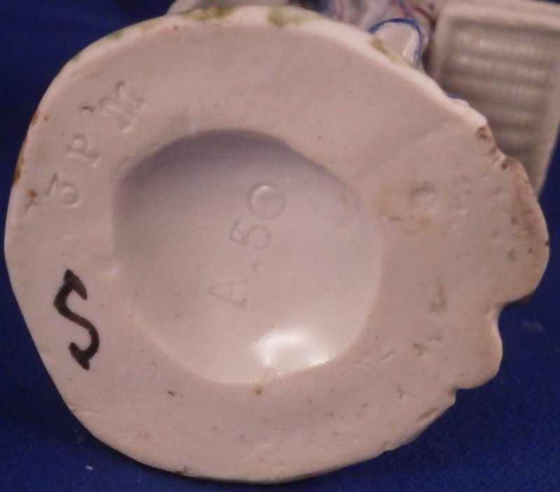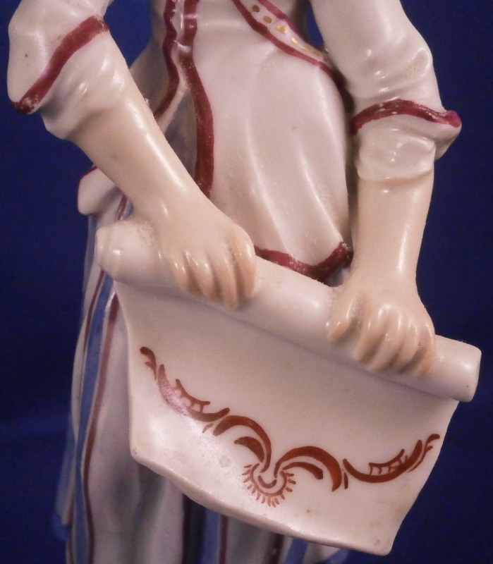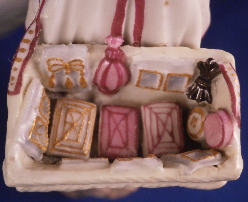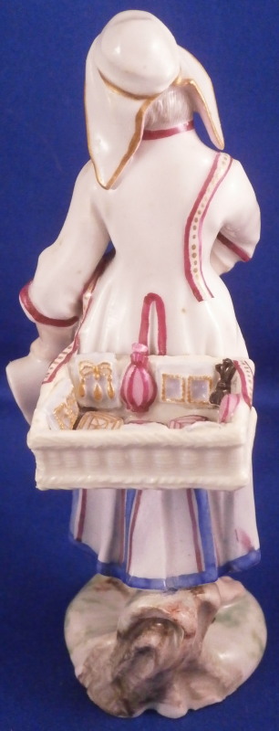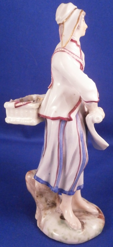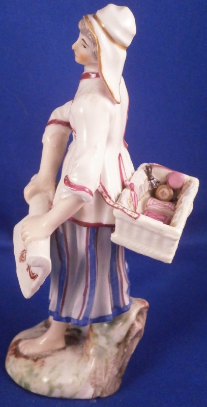 This is a nice figurine of a lady selling books and paintings made by Ludwigsburg in the 18th century. She is rolling up a painting in front of her and has a basket full of books in the back of her. A really well modeled and hand painted figure typical for this maker. The figurine is 5.5 inches tall, 2 inches wide and 2.5 inches deep. She is in superb condition with just one of the sraps holding the basket missing a small section in the back. As nice as you will find! The piece is marked underneath with the under glaze blue CC mark as well as a painter's mark S and a few impressed letters and numbers as shown. Please email me for more information or photos.