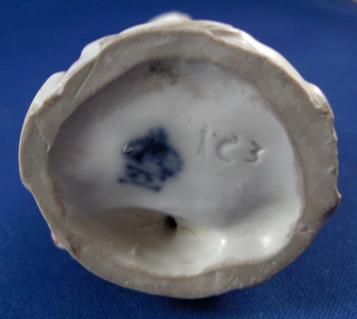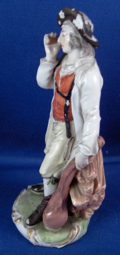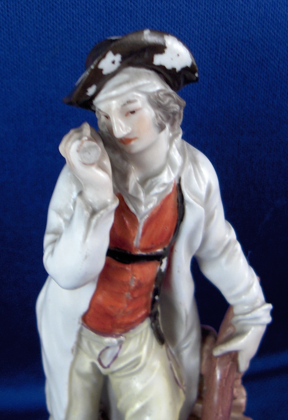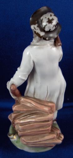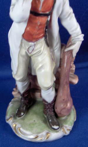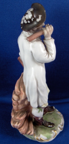 This is a woodsman with his ax and club made by Ludwigsburg. It was made between 1759 and 1770 and is marked with the crown over CC mark in underglaze blue as well as some incised letters and numbers. The figure is 4.75 inches tall. He is in good condition with the black flaking off the hat, suspenders and the shoes. He is also missing the front and back of the ax. Please email me for more information or photos.