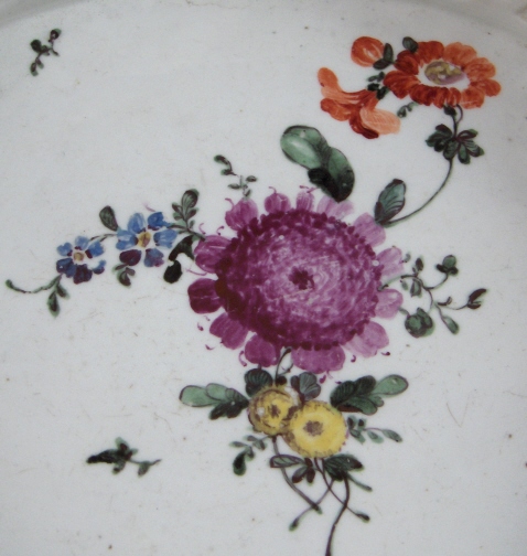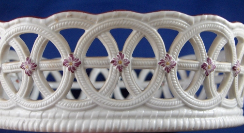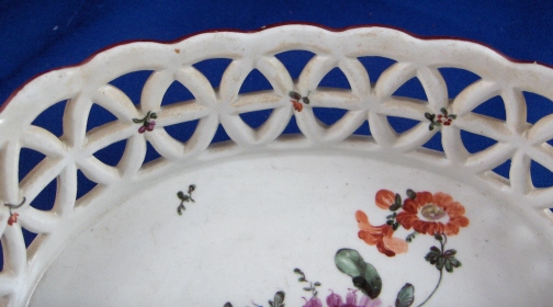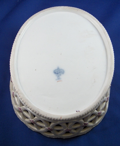 This is a basket made by Ludwigsburg between 1759 and 1770. It is handpainted with a large floral arrangement in the center and small flowers on the rim. The reticulated rim has a very nice relief design to the outside and puce and yellow highlights in the centers. Orange brown trim to the top rim. It is marked with the CC mark under the crown in underglaze blue. Impressed numbers 2 and 3 and letter F. Also a red line under the blue mark and a 5T. in brown on the footring. The basket is 2.25 inches tall, 5.875 inches deep and 7.25 inches wide. The basket is in perfect condition. Please email me for more information or photos.