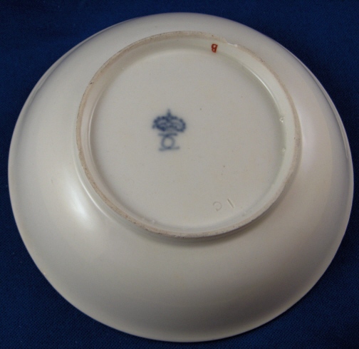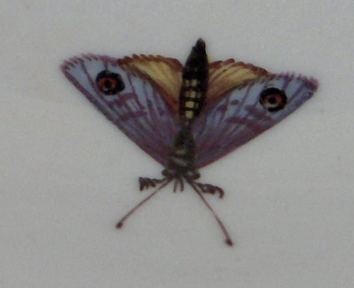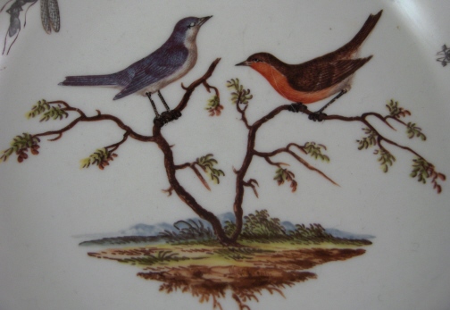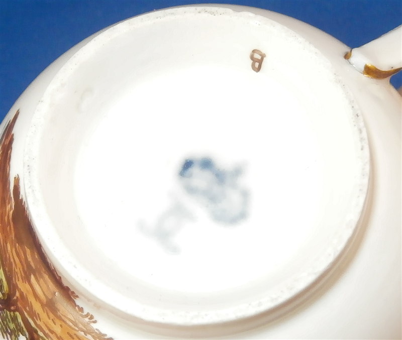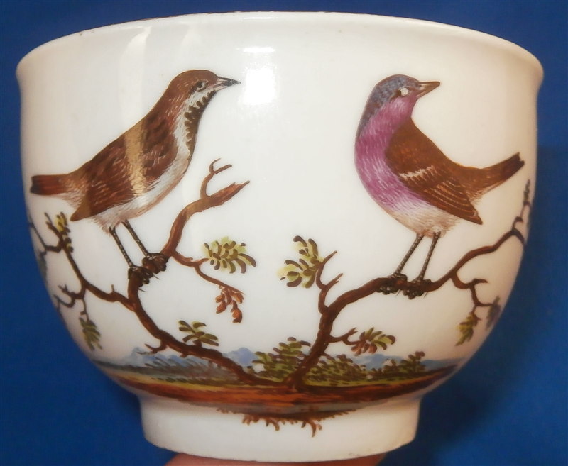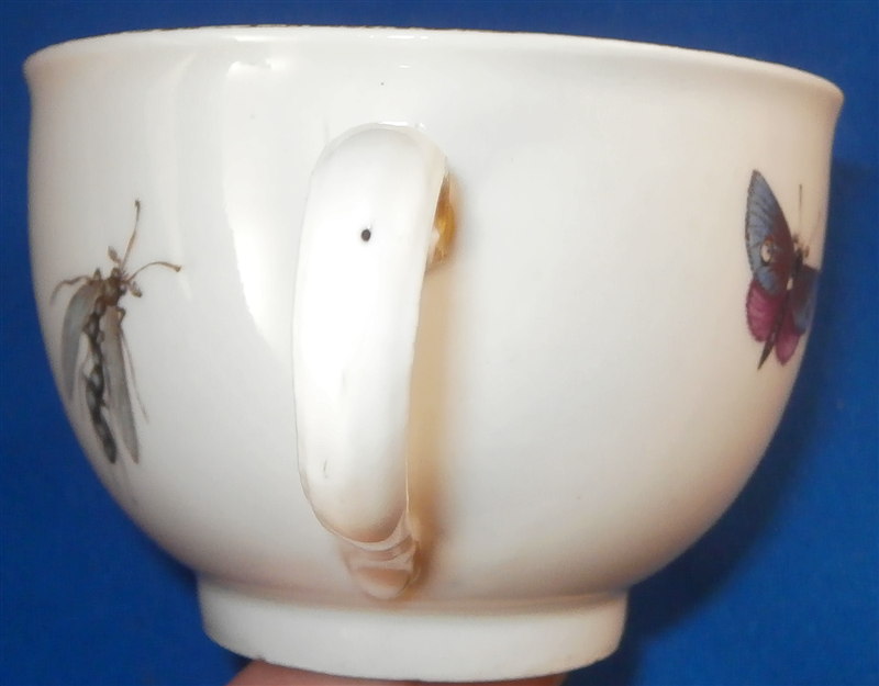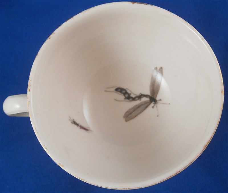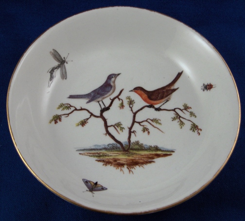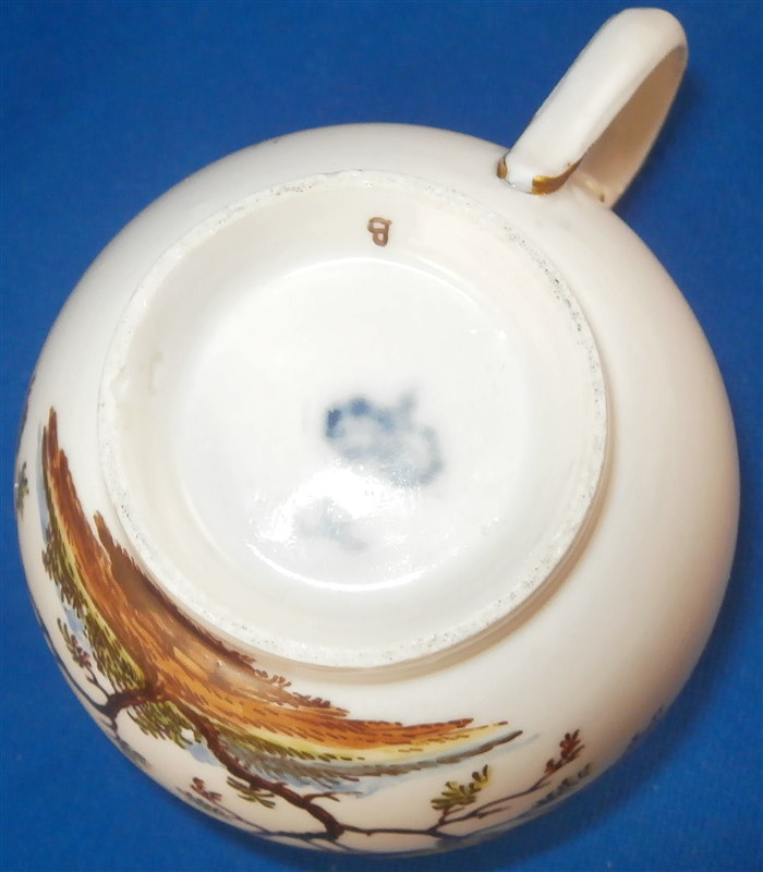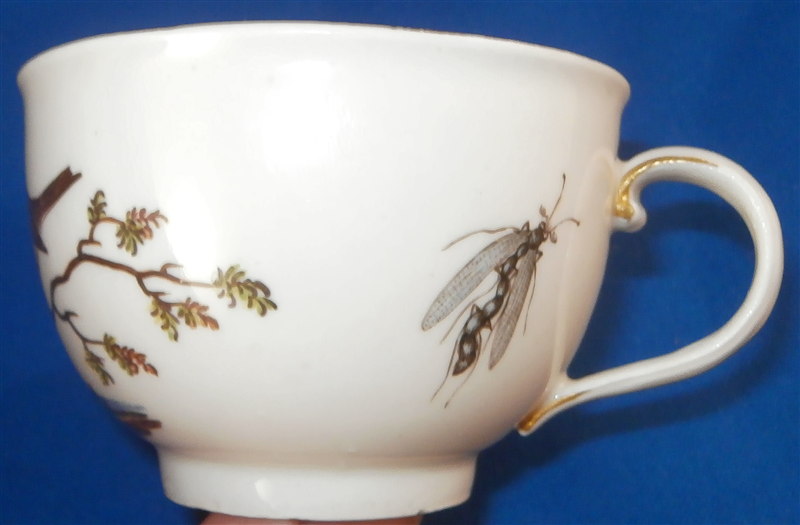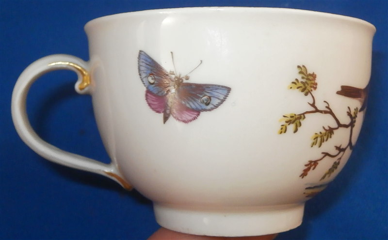 This is a superb cup and saucer made by Ludwigsburg around 1765. Both are handpainted with a top quality bird scene as well as three/four really nice bugs and a nice gold trim. The set was painted by one of the Hoeflich brothers (the birds and bugs) and the tree by whoever the letter B signifies. The signature HO: can be found twice in the butterfly wings and was used by the Hoeflich brothers. A big THANKS as always to Dr. Hans Flach - one of the really nice experts in the field of porcelain! I always enjoy the chats! The set is marked with the CC mark under the crown in underglaze blue as well as an impressed number 8 on the footring and 1C near that as well as a painter's mark B in iron red on the saucer and on the cup. The footring of the cup has an impressed number 3. The cup is 1.875 inches tall and has a diameter of 2.75 inches. The saucer is 1.25 inches tall and 5 inches in diameter. Both are in super condition with just a small chip on the footring of the saucer and wear to the gilding of the top edge on the cup. Please email me for more information or photos.