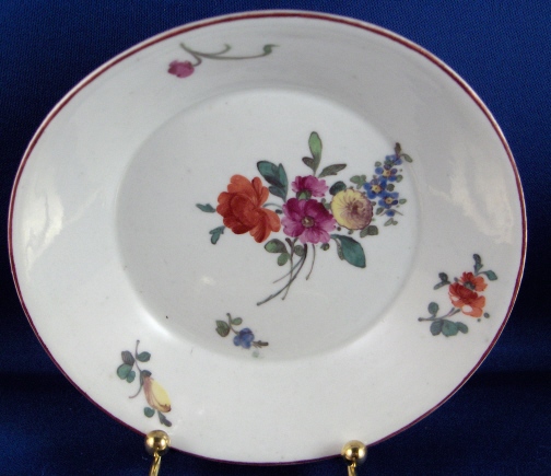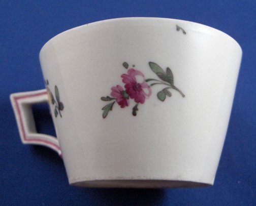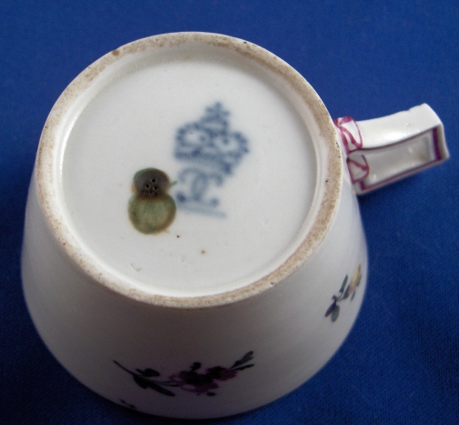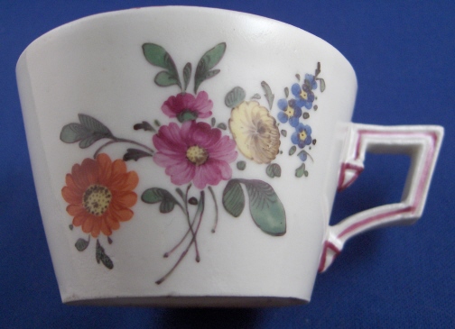 This is a cup and saucer set made by Ludwigsburg. It was made between 1765 and 1770 and is marked with the CC mark under the crown with a line under the CC in underglaze blue. Incised letter X. Both are decorated with flowers and a reddish brown trim. The cup is 2 inches tall and 2.75 inches in diameter at the top (not including the handle which sticks out almost 1 inch). The saucer is a bit over 1 inch tall and between 5.25 and 5.5 inches in diameter (a bit oval from firing). The set is in super condition. Please email me for more information or photos.