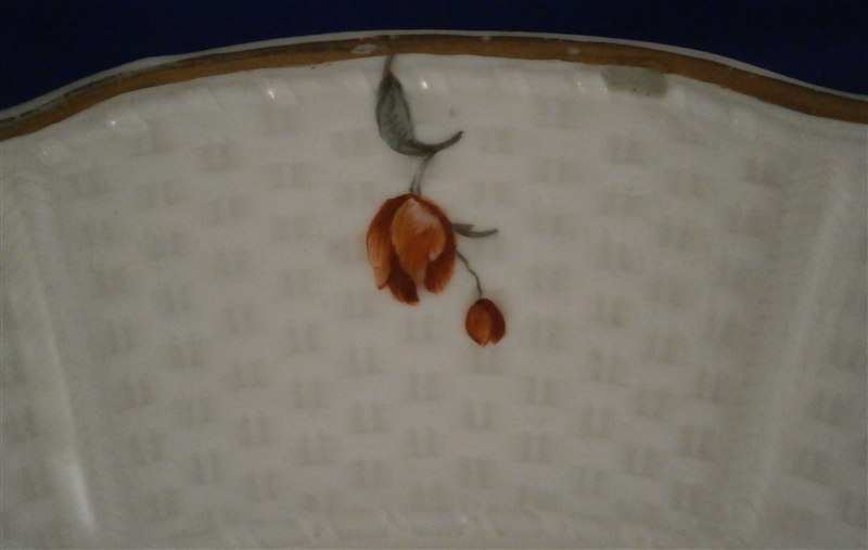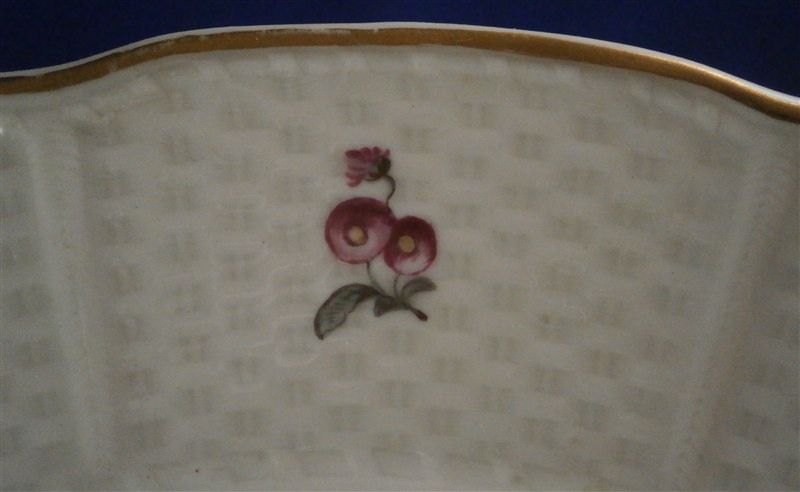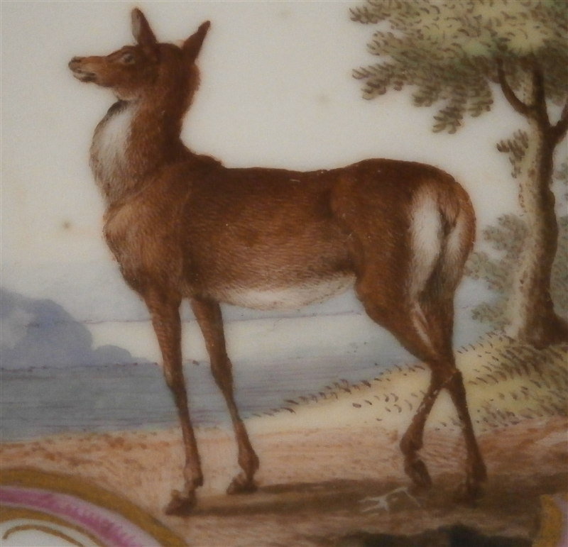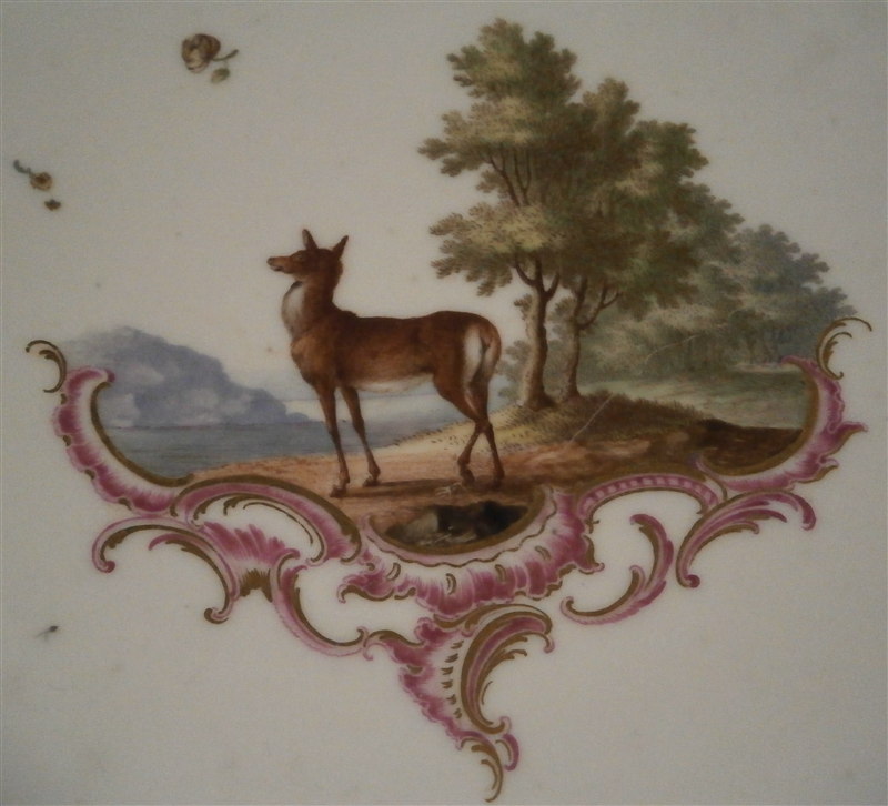 This is a fun plate made by Ludwigsburg between 1759 and 1770. It is hand painted with an unsual scene of a doe standing by a lake with some trees in the back and mountains in the far distance or possibly low clouds. The scene has a superb puce and gold scroll design underneath it! The rest of the plate has a few small scattered flowers likely to hide imperfections in the paste. The rim has a basket weave design to it with some more flowers and a gold edge. The plate is marked with the CC mark under the crown in underglaze blue and an impressed RS and 1 by the footring. It is 1.25 inches tall and 9.625 inches in diameter. It is in great condition with a little wear to the gilding, a long scratch as well as some minor scratches to the scene, a chip to the foot ring and a knock to the footring that didn't quite turn into a chip as shown. It displays superbly! Please email me for more information or photos.