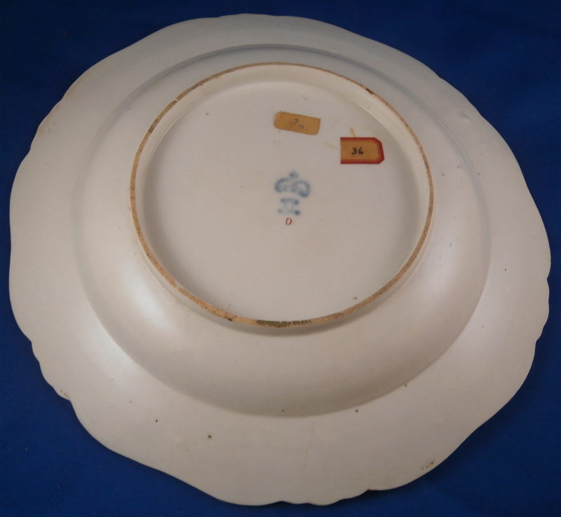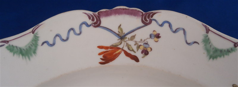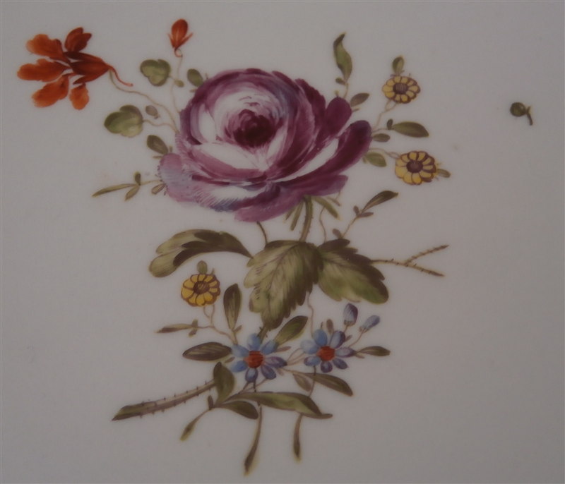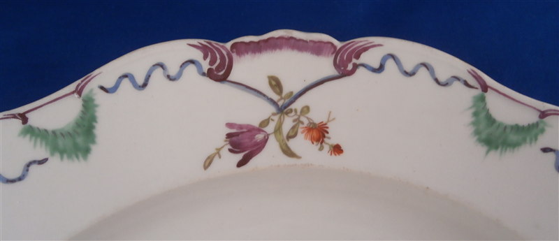 This is a fun plate made by Ludwigsburg in the 18th century. It is handpainted with a nice floral arrangement in the center, los of tiny flowers scattered throughout (mostly on tiny flaws in the paste) and a super fancy rim design including green, blue and purple with small floral arrangements mixed in. Never seen one quite this fancy from them! The edge has a nice shape to it as well. The plate is marked with the CC mark under the crown in underglaze blue as well as a red D: as a painter's mark and some impressed numbers by the footring. The piece is between 1.25 inches and 1.5 inches tall and 9.25 inches in diameter. It is in perfect condition. Please email me for more information or photos.