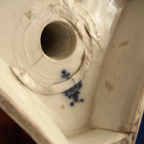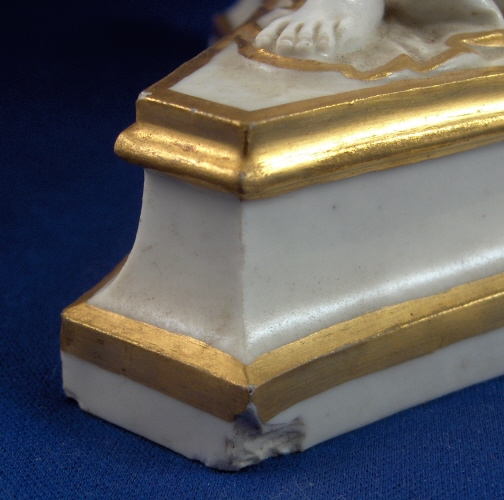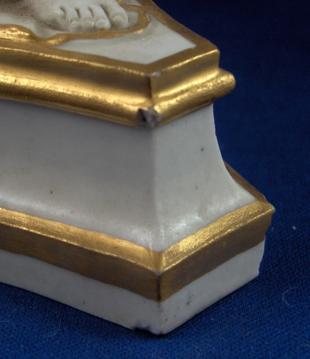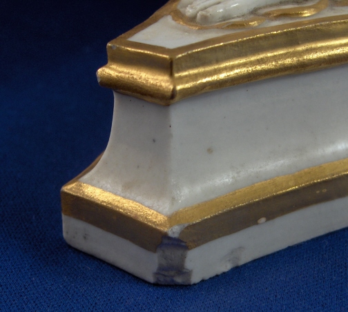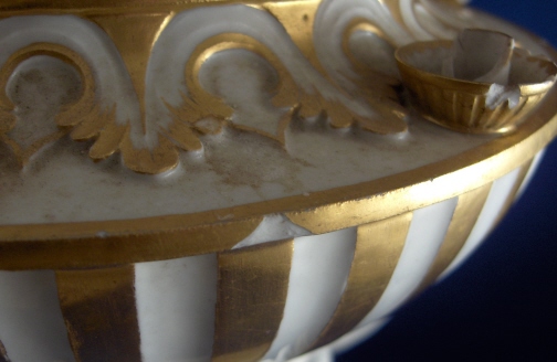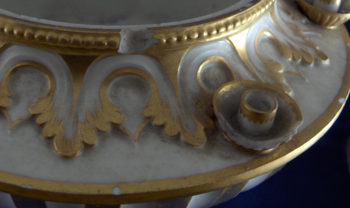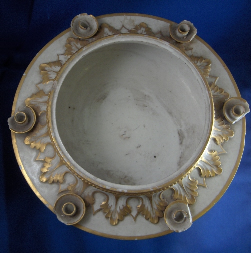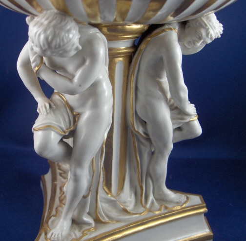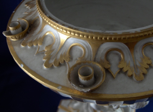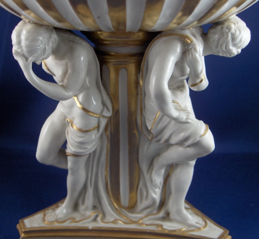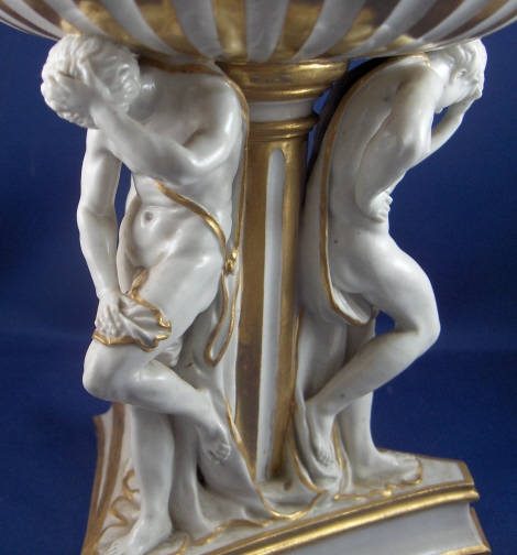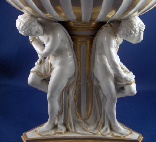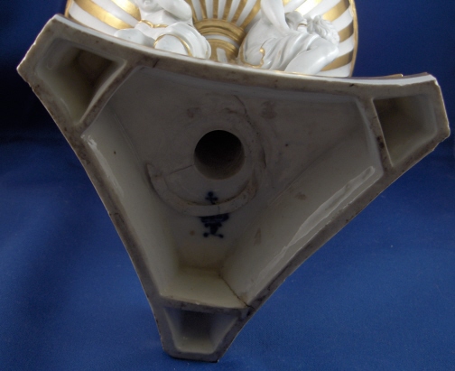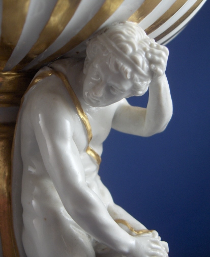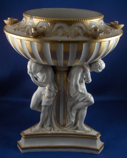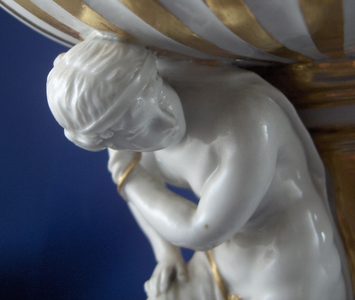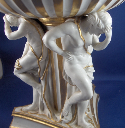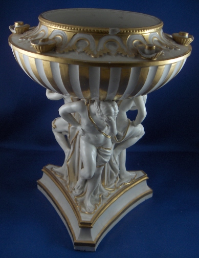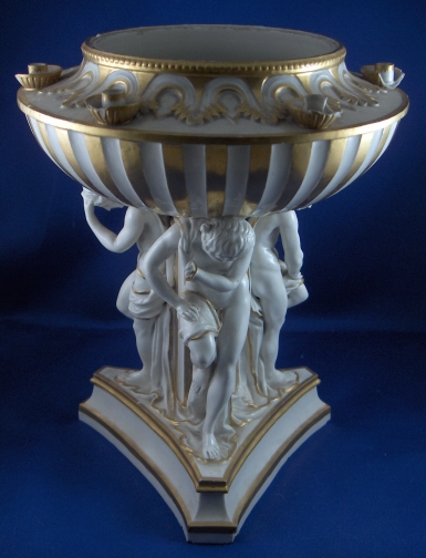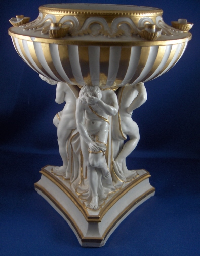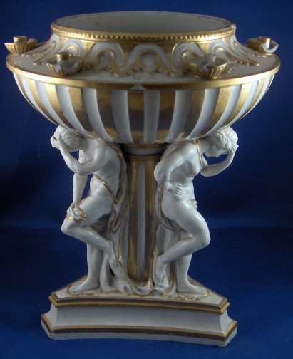 This is a figural vase made by Ludwigsburg around 1785 in the classicism period. The vase has a triangular base on which three figurines (a man and two ladies - I think) stand who are holding up the vase like Atlas was holding the earth. The vase has six candleholder looking things that go into the vase and could hold flowers too. Nice arcarnus leaf decoration in relief to the top and gold highlights throughout. The piece is marked with the crown over CC mark in underglaze blue. The entire vase is 10 inches tall and 8 inches in diameter so a sizable piece. It is in good condition considering the size and nature of the piece. I took a lot of photos so look at those as well please. There is some small chipping to the rims - none of which is horrendous. The candle holders have the most damage with all of them missing a piece. The figurines are in perfect condition and the gilding amazingly is as well except where there are chips. It looks like it might have had a lid but the one in the Ludwigsburg book is the same and they have a complete inventory in it and would have mentioned one. Please email me for more information or photos.