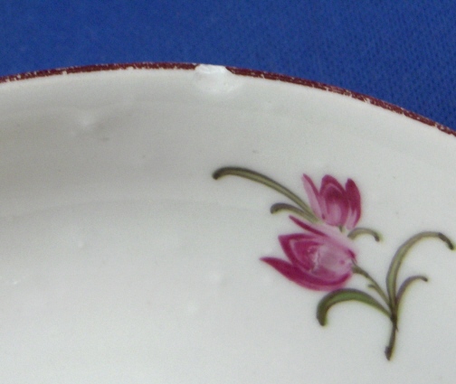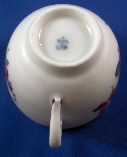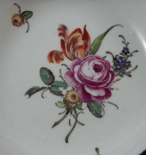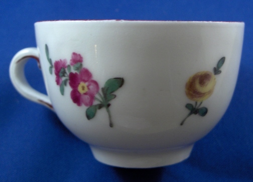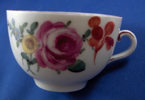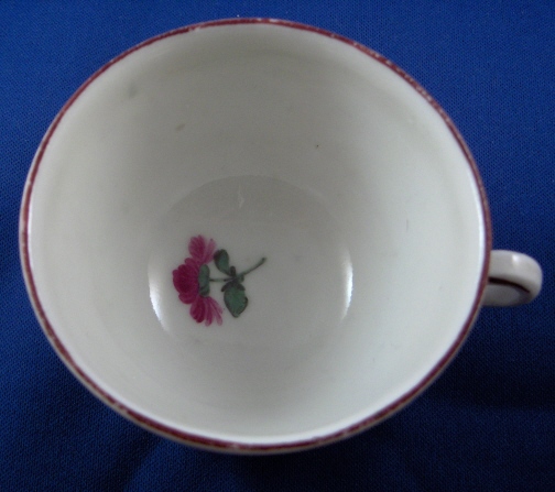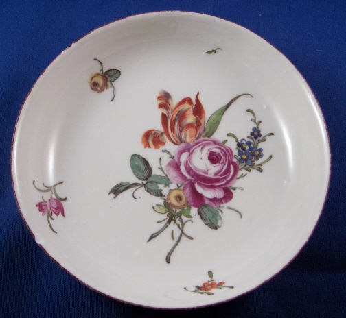 This is another cup and saucer set made by Ludwigsburg around 1775. Both are handpainted with a larger floral arangement as well as some smaller flowers and a reddish brown trim. The cup also has a small flower on the inside bottom as always a sure sign of quality. Both are marked with the CC mark in underglaze blue with the mark on the cup having a small dot over it as well. Never seen that - might have just been a fluke. The cup is 2 inches tall and 3 inches in diameter. The saucer is 1.125 inches tall and 5.125 inches in diameter. The set is in good condition with the saucer having a small inside rim chip as well as a really tiny fleabite.The main floral arrangement on the saucer has some flaking to the green which is a common problem with this color back then! Please email me for more information or photos.