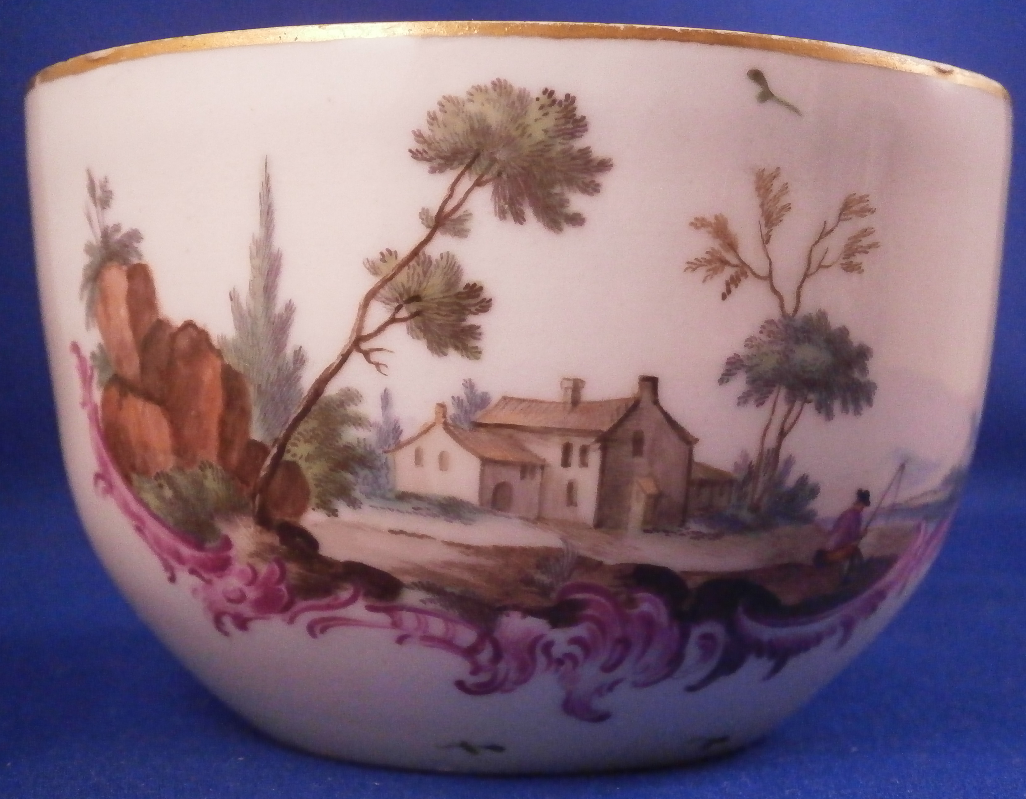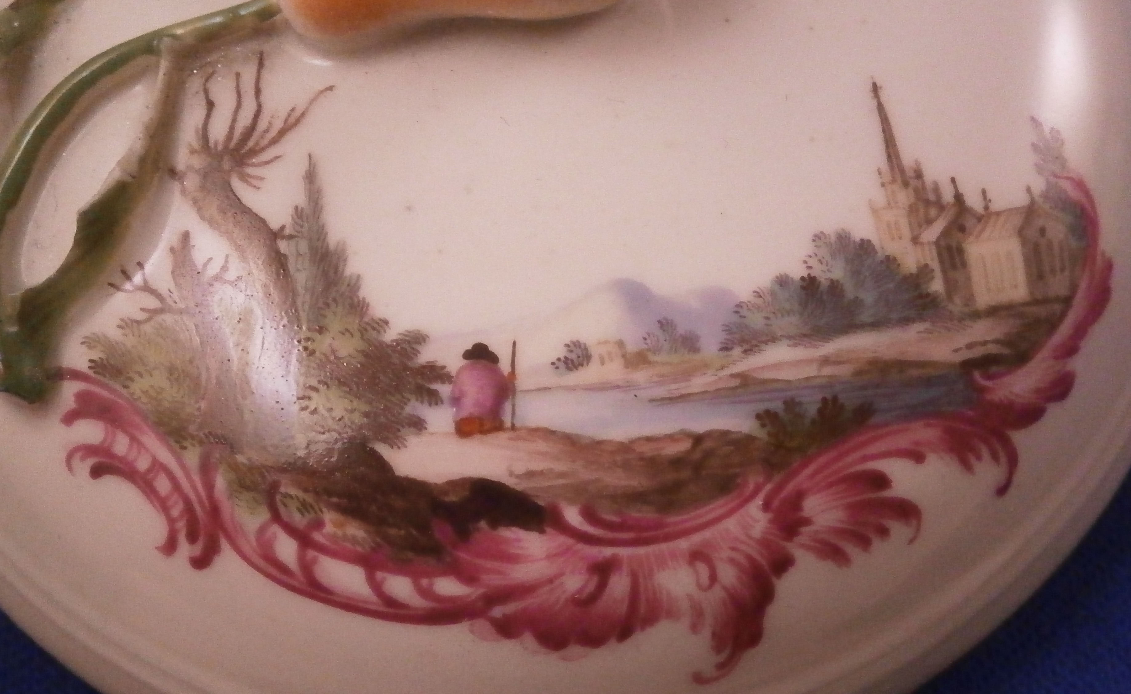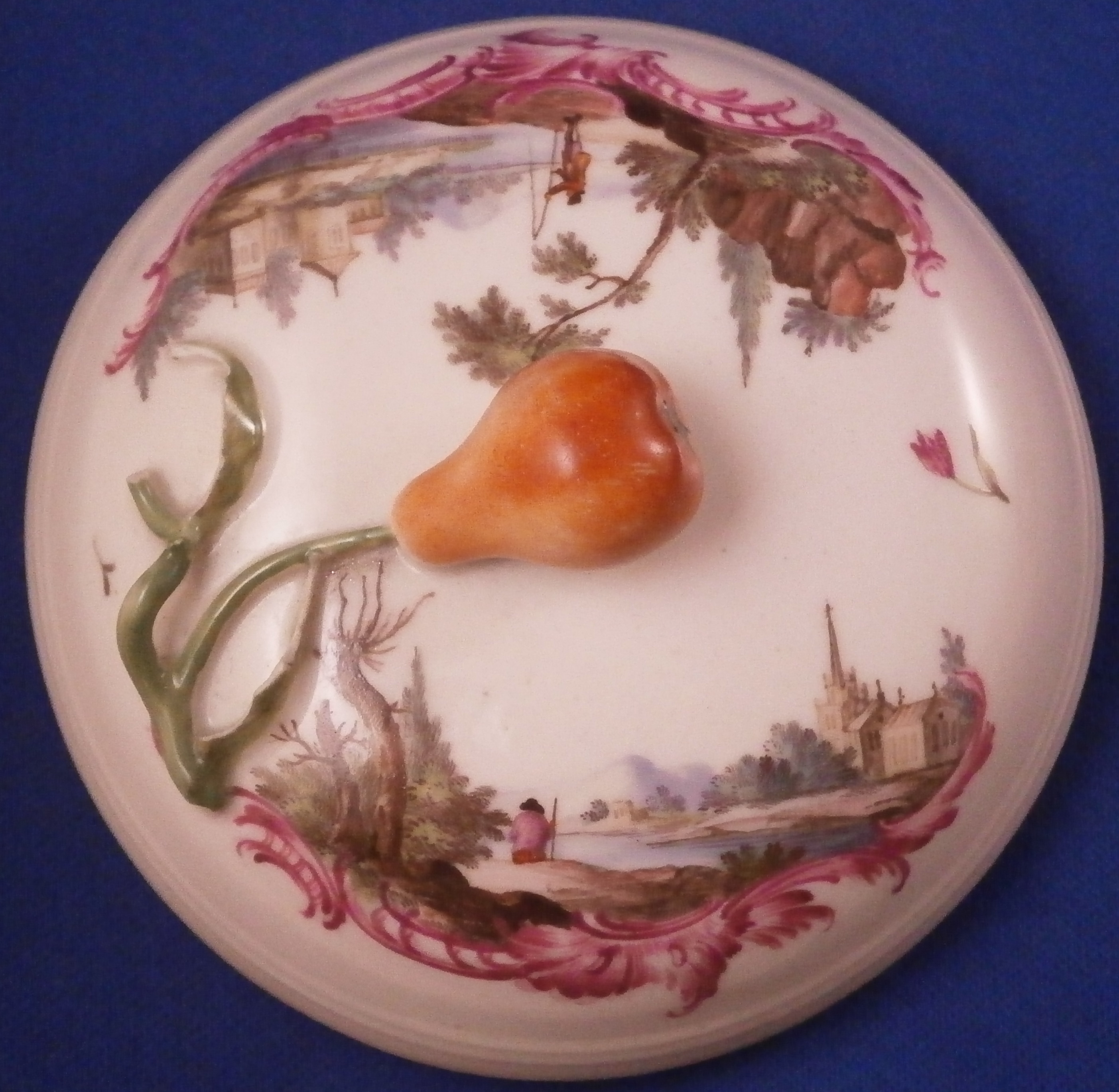 This is a great lidded sugar dish made by Ludwigsburg around 1760. The piece is really nicely hand painted and has the early puce scroll work under the scenes that Andreas Oettner liked to use but I think it was more likely painted by Johann Friedrich Kull. Either way the main piece is hand painted with a superb landscape scene to the front and the back in the usual Ludwigsburg manner with a building, rocks, some greenery and a lone figure. The lid also has two scenes to it in the same style with a nice pear fruit finial. Gold trim to the edge. These early dishes like this are becoming really hard to find especially the nice quality ones like this. The main body is marked with the CC mark under the crown in under glaze blue and quite a few impressed numbers and letters along the foot as shown. The entire dish with the lid in place is about 3.5 inches tall and 3.625 inches in diameter. It is in great condition except for the leaves of the finial on the lid are damaged quite a bit and a star line to the inside that is not visible from the outside! Neither takes away from the piece when on display at all. Please email me for more information or photos.
