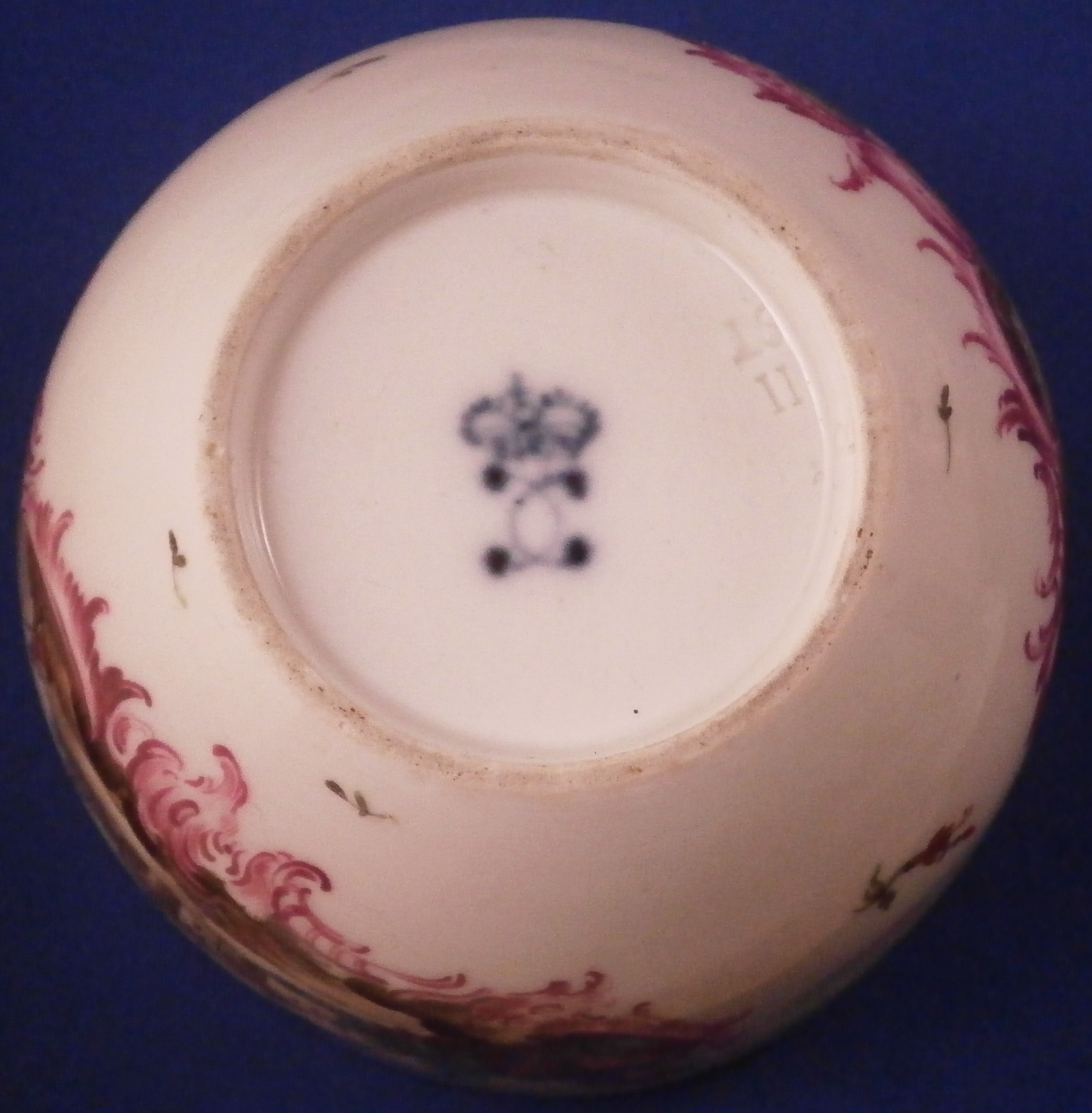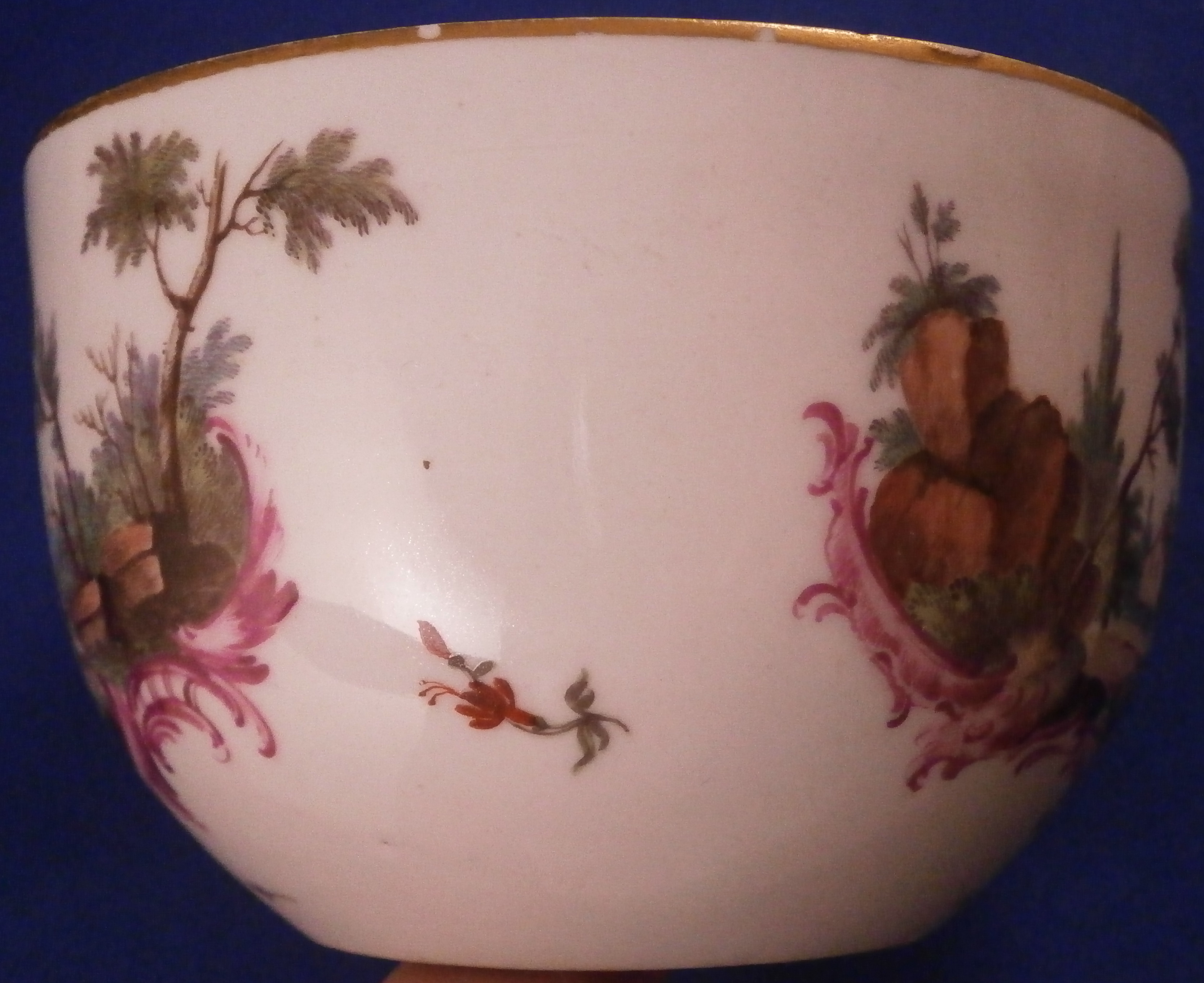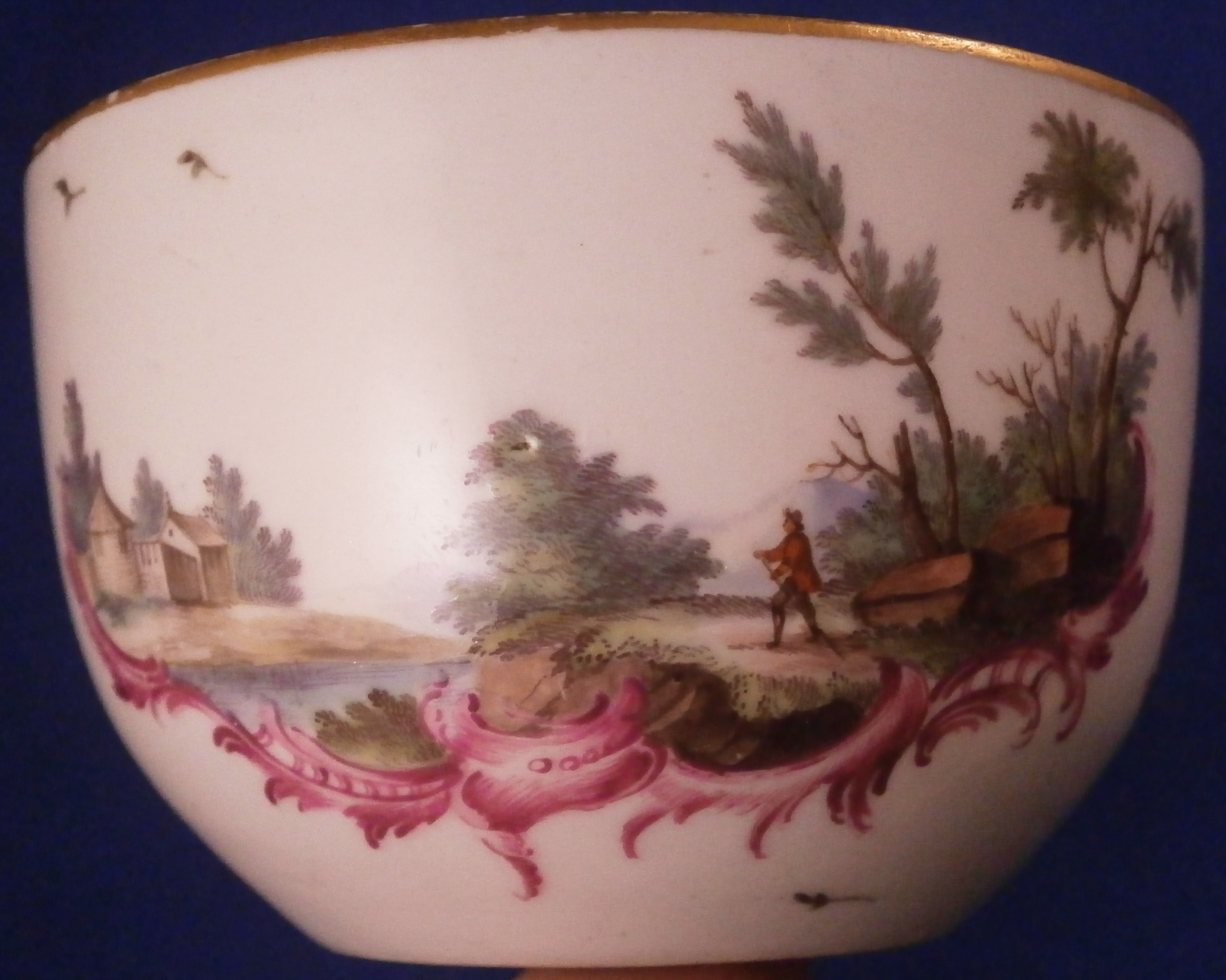 This is a great lidded sugar dish made by Ludwigsburg around 1760. The piece is really nicely hand painted and has the early puce scroll work under the scenes that Andreas Oettner liked to use but I think it was more likely painted by Johann Friedrich Kull. Either way the main piece is hand painted with a superb landscape scene to the front and the back in the usual Ludwigsburg manner with a building, rocks, some greenery and a lone figure. The lid also has two scenes to it in the same style with a nice pear fruit finial. Gold trim to the edge. These early dishes like this are becoming really hard to find especially the nice quality ones like this. The main body is marked with the CC mark under the crown in under glaze blue and quite a few impressed numbers and letters along the foot as shown. The entire dish with the lid in place is about 3.5 inches tall and 3.625 inches in diameter. It is in great condition except for the leaves of the finial on the lid are damaged quite a bit and a star line to the inside that is not visible from the outside! Neither takes away from the piece when on display at all. Please email me for more information or photos.
