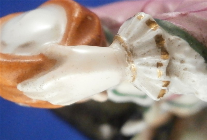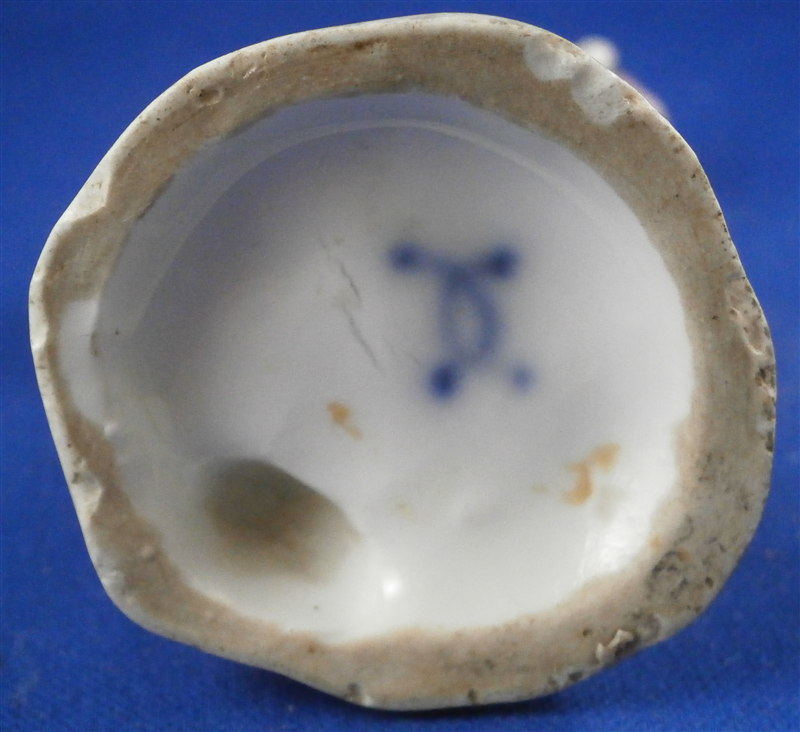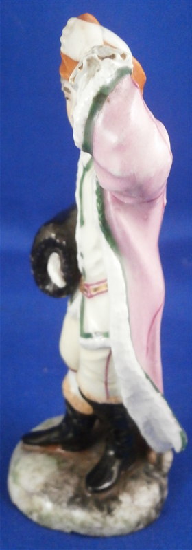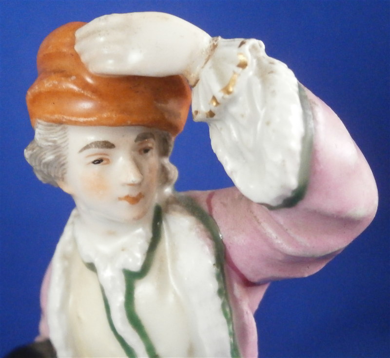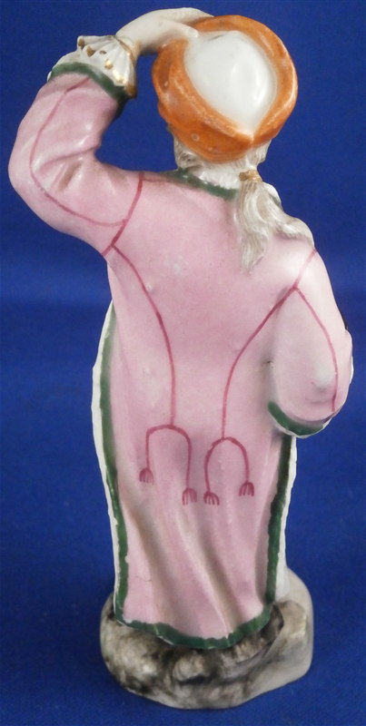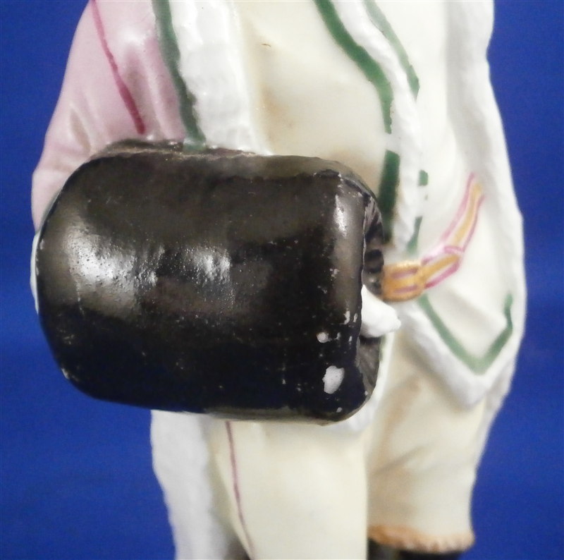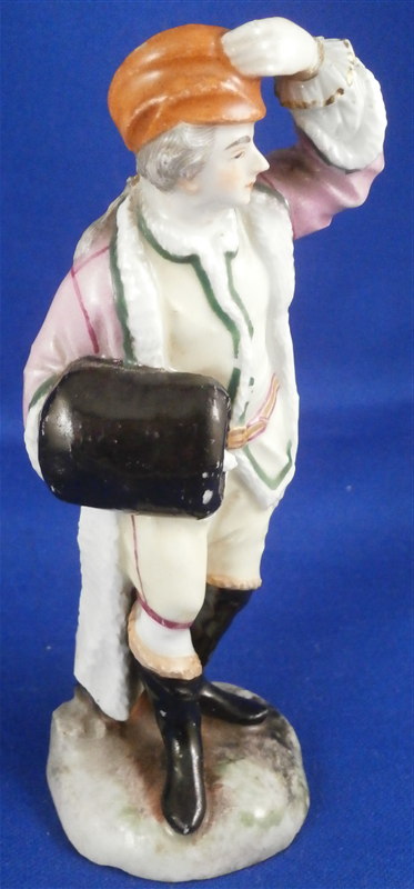 This is a figurine made by Ludwigsburg in the later 18th century. It is marked with the CC mark in underglaze blue as shown. The figure is of a gentleman with a muff wearing a fur coat and a hat. The piece was designed by Pierre Francois Lejeune who did quite a few figures. A superbly modeled and painted piece and very typical for their figurines! The piece is 4.75 inches tall, 1.75 inches wide and 1.75 inches deep. He is in great condition with a few spots of wear and the wrist of the hand that is on his head has an old repair to it. I assume it is a manufacturing defect since it couldn't break off. Not visible unless you really look for it! Three minor chips to the base bottom edge. Please email me for more information or photos.