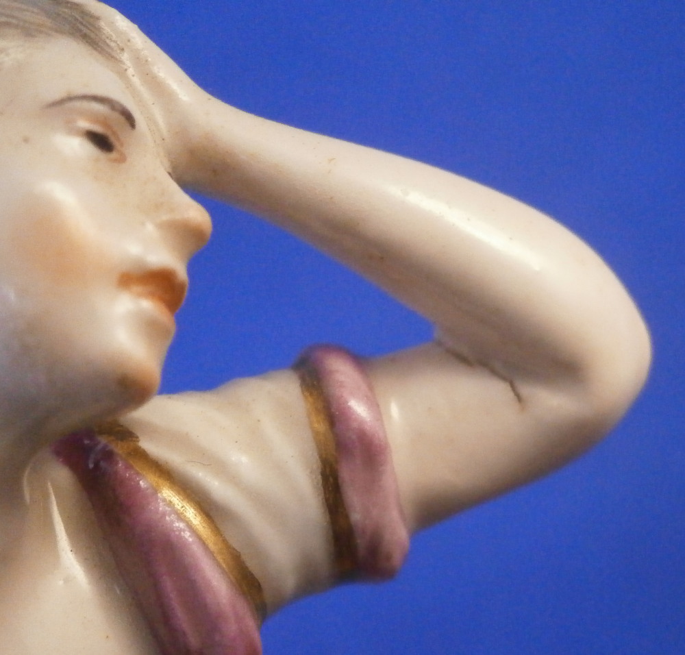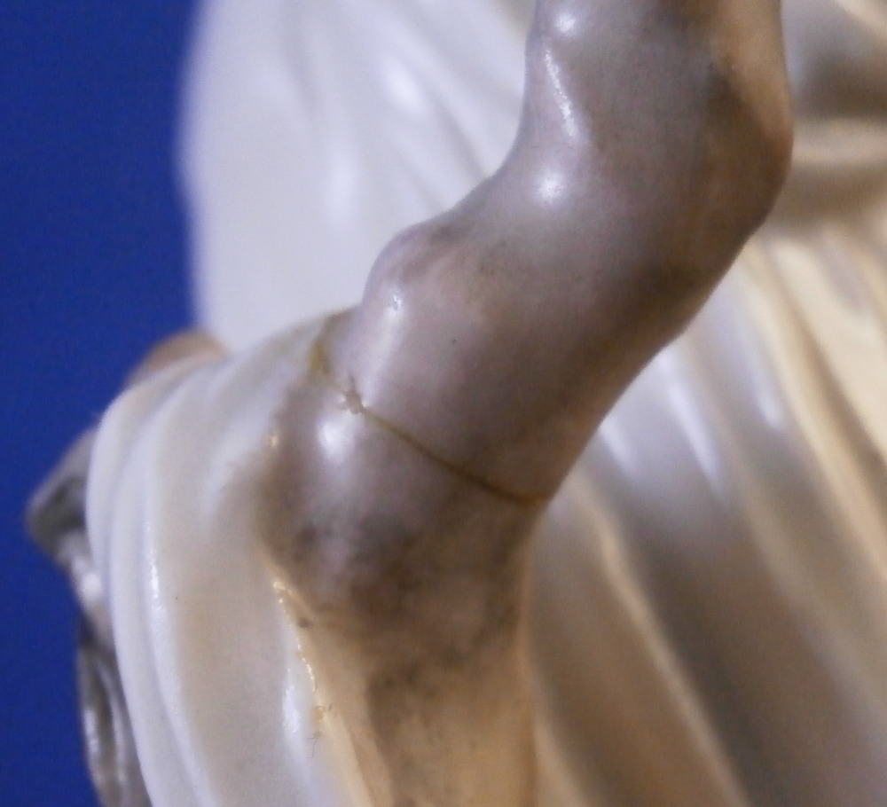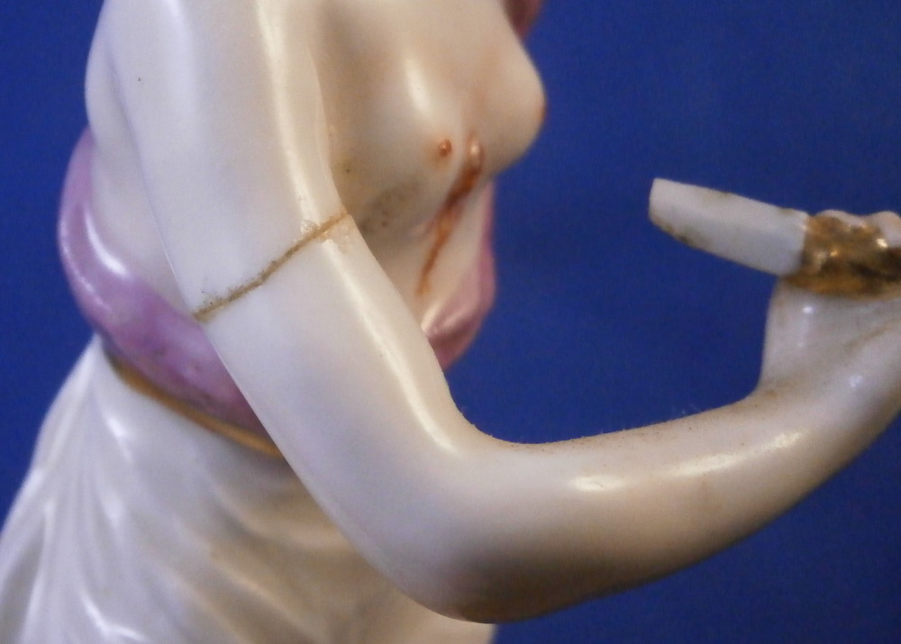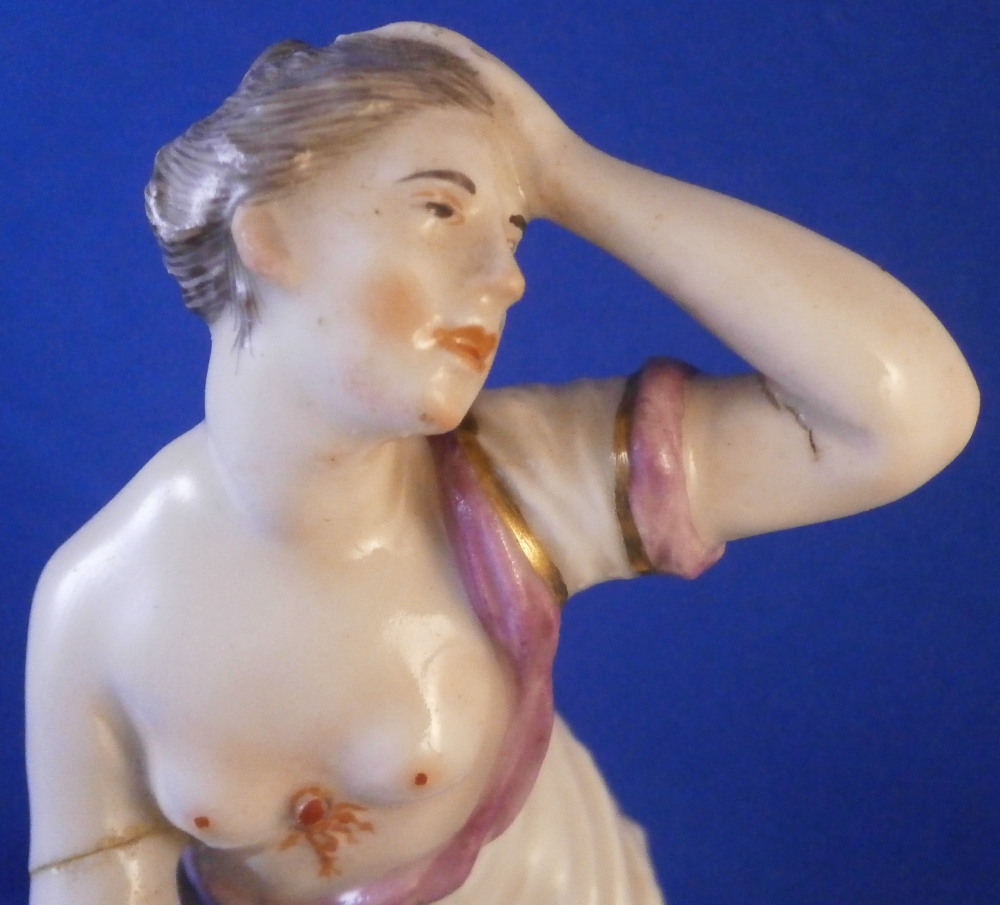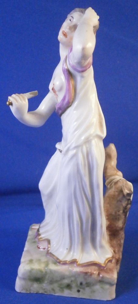 This is a figurine of Lucretia stabbing herself made by Ludwigsburg in about 1767. A nicely modeled figurine of the lady holding a knife in her right hand with her other hand on her head and some blood between her exposed breasts. She is wearing a nice gown and standing on a base with a tree trunk in the back. The figure is marked with incised CM:3p and s3 and has the painter's mark S in brown. It is 5.25 inches tall, 2.25 inches wide and 2.125 inches deep. The piece displays nicely but there are some issues - the tip of the knife is missing, her right arm has a clean break to it as shown, a firing crack in the other arm and a break in the tree trunk as shown. Sounds worse than it is and a decent restorer could easily bring her back to perfection or she looks great as is. Please email me for more information or photos.
