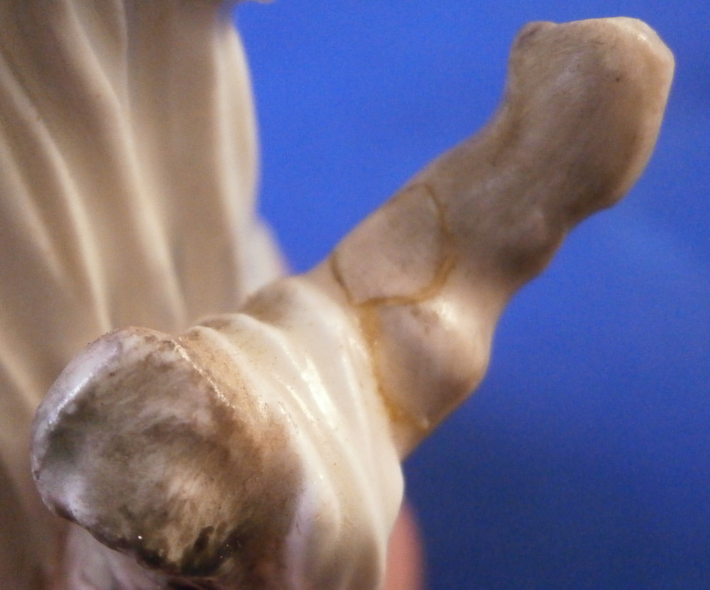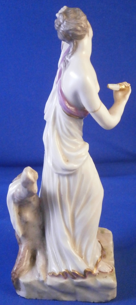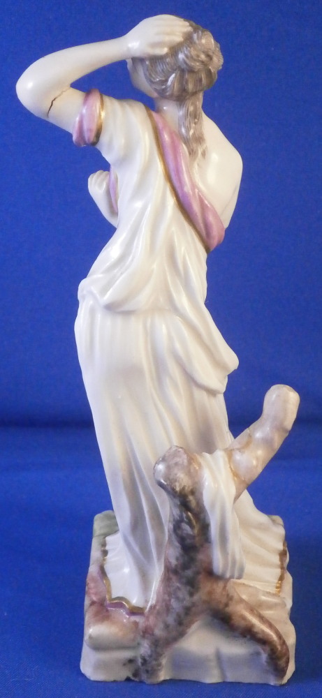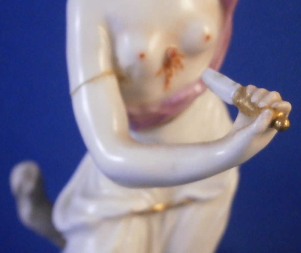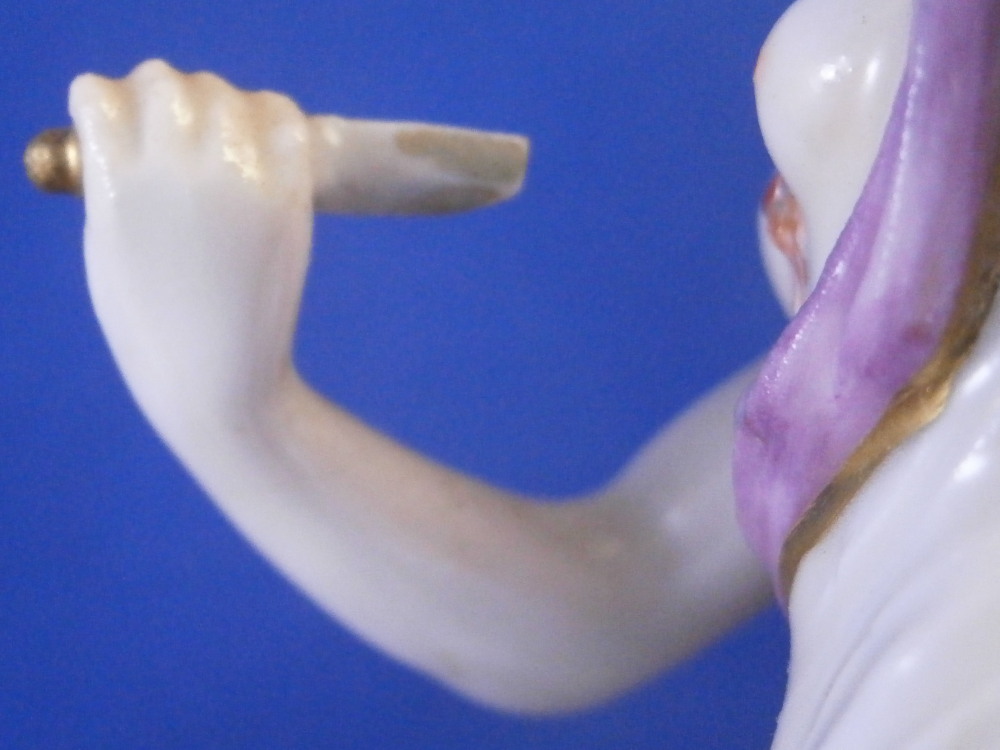 This is a figurine of Lucretia stabbing herself made by Ludwigsburg in about 1767. A nicely modeled figurine of the lady holding a knife in her right hand with her other hand on her head and some blood between her exposed breasts. She is wearing a nice gown and standing on a base with a tree trunk in the back. The figure is marked with incised CM:3p and s3 and has the painter's mark S in brown. It is 5.25 inches tall, 2.25 inches wide and 2.125 inches deep. The piece displays nicely but there are some issues - the tip of the knife is missing, her right arm has a clean break to it as shown, a firing crack in the other arm and a break in the tree trunk as shown. Sounds worse than it is and a decent restorer could easily bring her back to perfection or she looks great as is. Please email me for more information or photos.