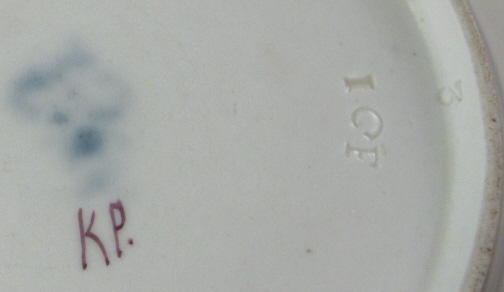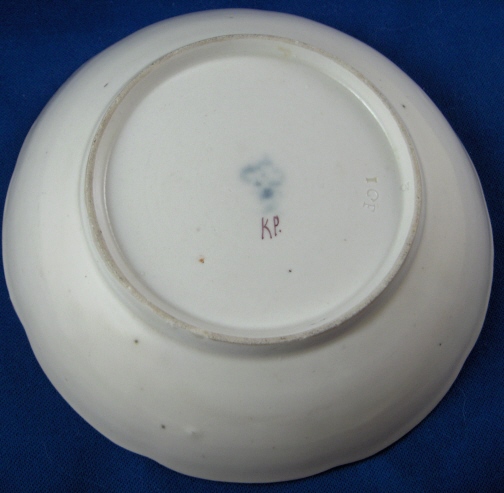 This is a saucer made by Ludwigsburg around 1770. It is marked with the CC mark under the crown in underglaze blue and a rare painters mark KP for Knaup. in puce under that. Some impressed marks as well as shown. The saucer is handpainted with a large floral arrangement in the center with three smaller flowers on the basket weave type rim. Brownish trim to the edge. The saucer is 1.25 inches tall and 5.375 inches in diameter. It is in perfect condition. Please email me for more information or photos.
