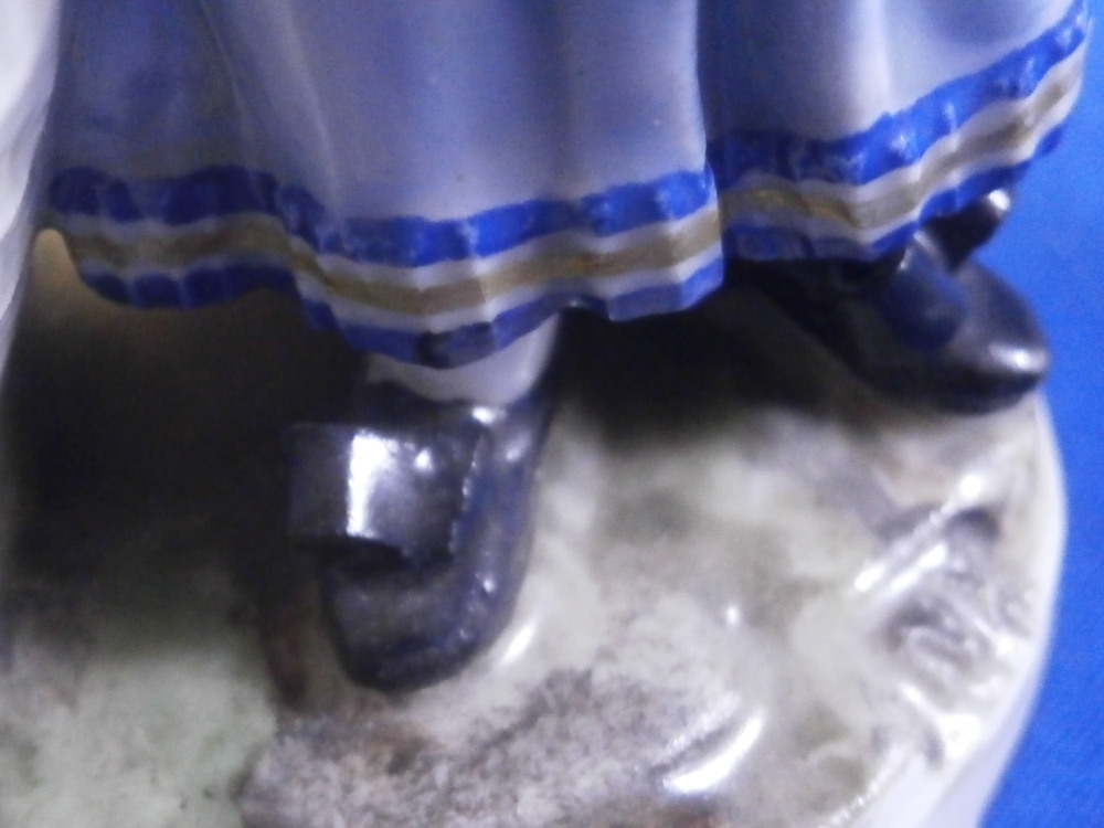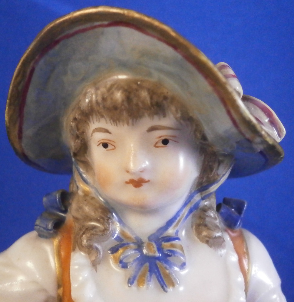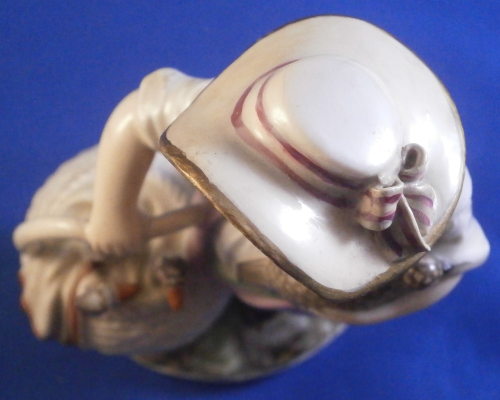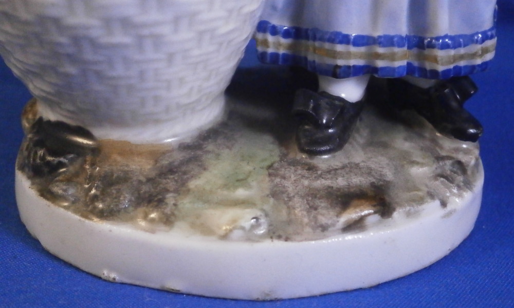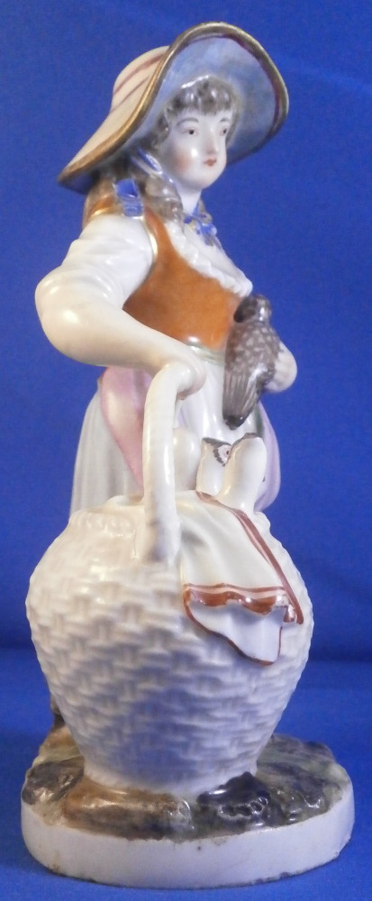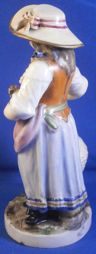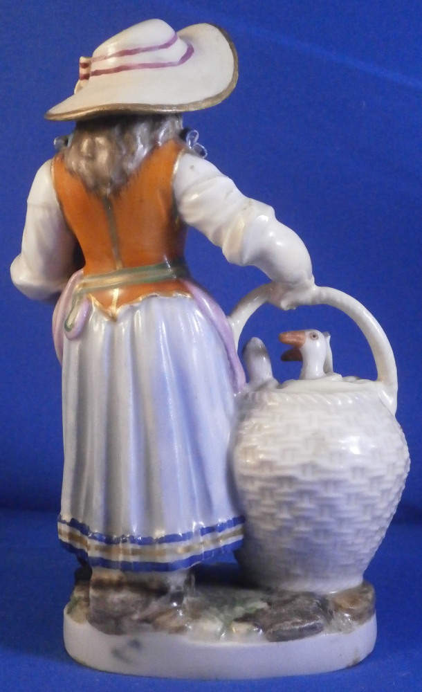 This is a cute figurine of a girl or young lady made by Ludwigsburg probably towards the end of this maker in the early 19th century or possibly the very late 18th century. The girl has a large basket standing next to her in which three geese or ducks stick their heads out but most is covered with a cloth. She is holding another bird in her left arm. She is nicely dressed and wearing a large hat. Typical base for this period! The figure is nicely modeled and hand painted perfectly! It is in great condition with the brim of the hat and the bow on top of the hat having been restored fairly well. One loop of the bow on her right shoe is missing but that looks to be a manufacturing flaw. Some imperfections around the bottom edge of the base from when the piece was made. The figurine displays nicely! She is marked on the back of the base with a script L mark in under glaze blue as shown - not a mark one sees often at all! Please email me for more information or photos.
