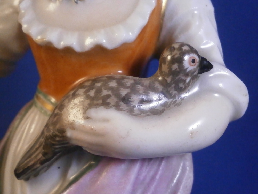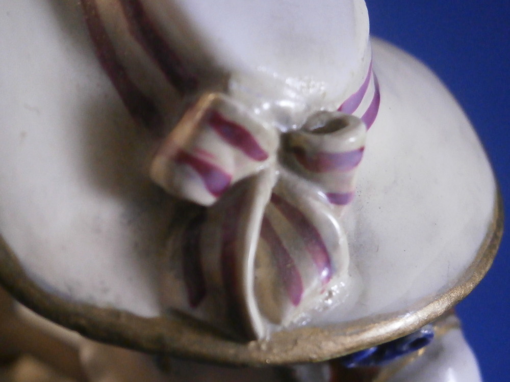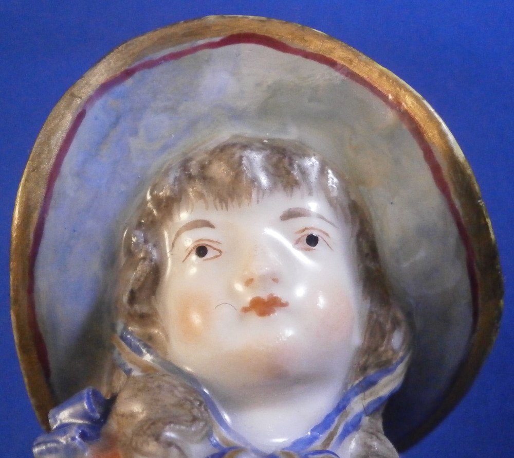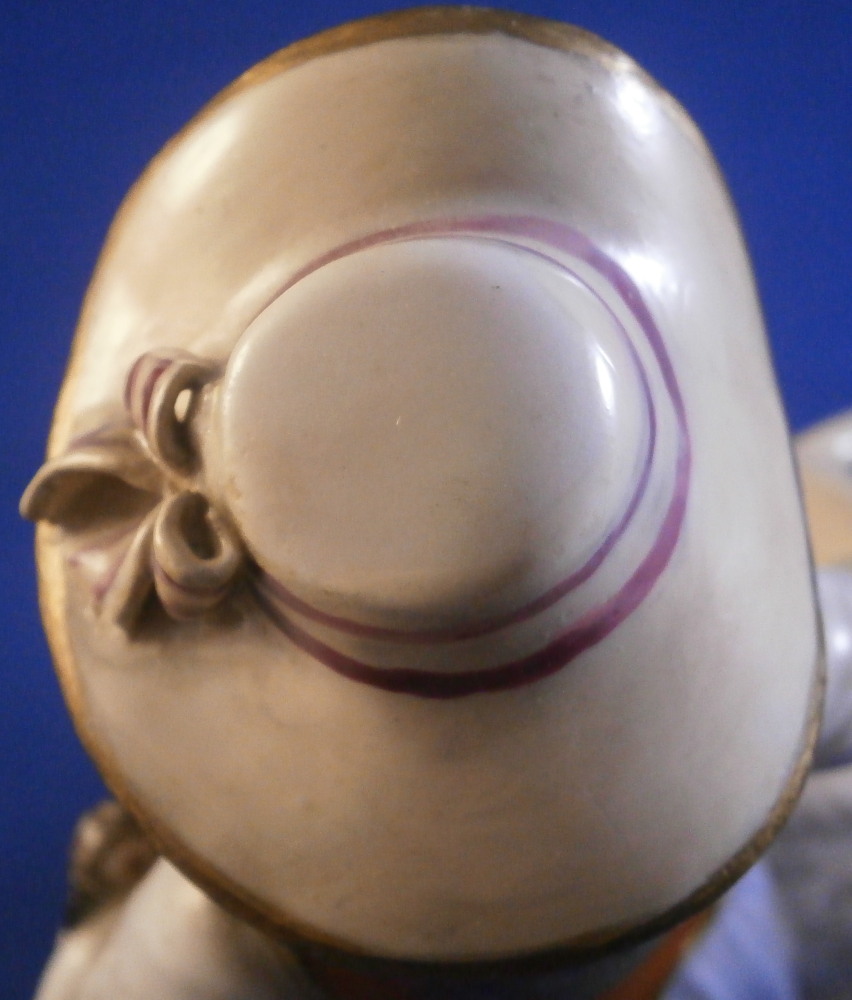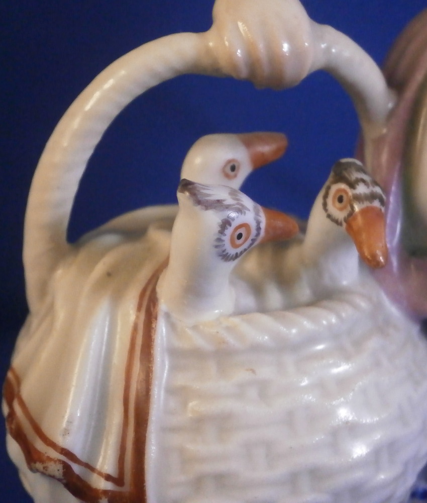 This is a cute figurine of a girl or young lady made by Ludwigsburg probably towards the end of this maker in the early 19th century or possibly the very late 18th century. The girl has a large basket standing next to her in which three geese or ducks stick their heads out but most is covered with a cloth. She is holding another bird in her left arm. She is nicely dressed and wearing a large hat. Typical base for this period! The figure is nicely modeled and hand painted perfectly! It is in great condition with the brim of the hat and the bow on top of the hat having been restored fairly well. One loop of the bow on her right shoe is missing but that looks to be a manufacturing flaw. Some imperfections around the bottom edge of the base from when the piece was made. The figurine displays nicely! She is marked on the back of the base with a script L mark in under glaze blue as shown - not a mark one sees often at all! Please email me for more information or photos.
