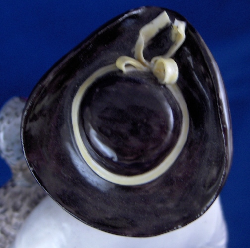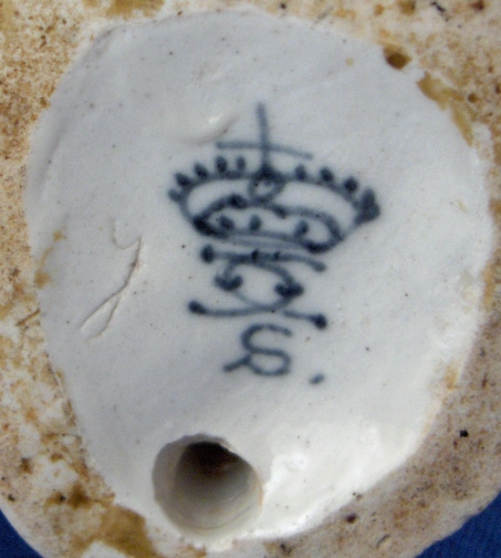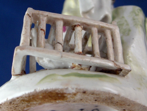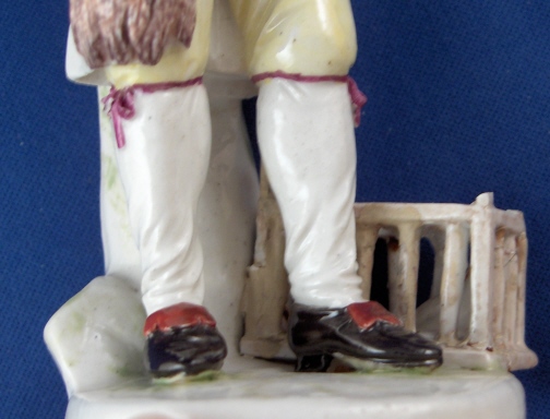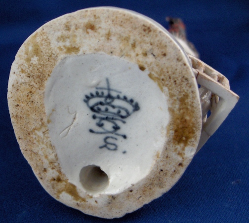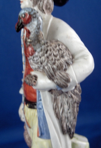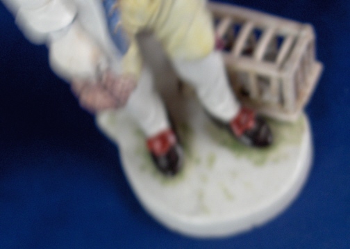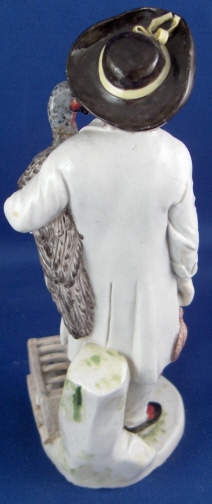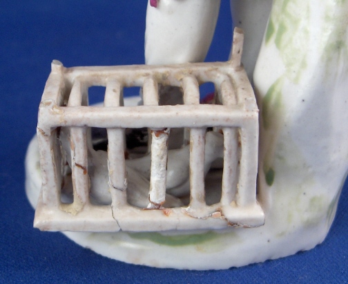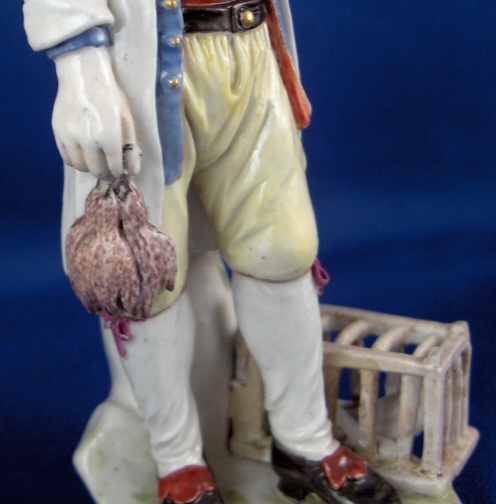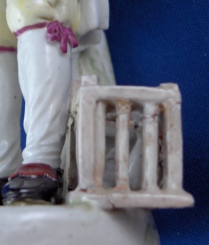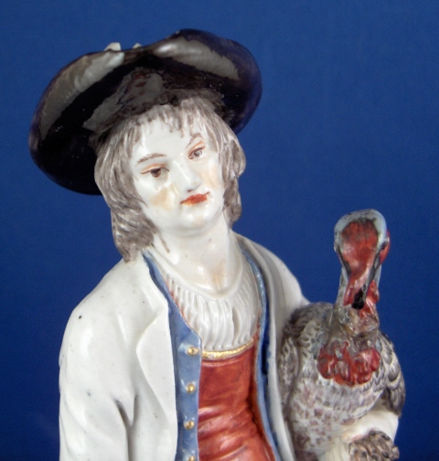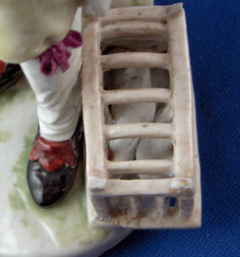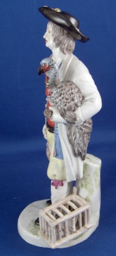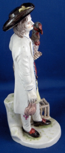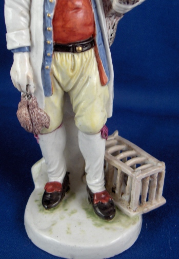 This is a figurine made by Ludwigsburg. It was made between 1759 and 1770 and is marked with the crown over CC mark in underglaze blue as well as an incised letter y and a blue S. The figurine is of a street vendor selling poultry - he is holding a turkey under his left arm, some quail or such on his right hand and two birds are in the cage by his feet. A superbly modeled and painted piece! The figure is 6.25 inches tall, 2.5 inches wide and 2.375 inches deep. He displays very nicely but the neck of the turkey was broken and restored as was the cage both of which could use an update. One tiny glaze chip to the bottom base rim and a small chip to the puce bow in his pant leg. Please email me for more information or photos.