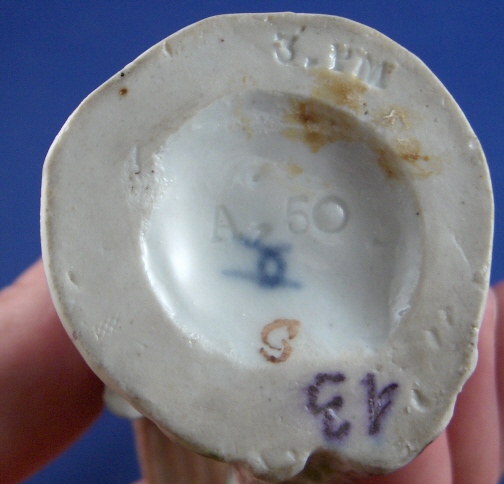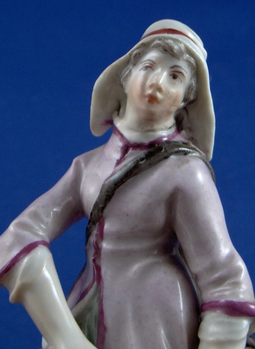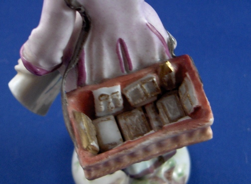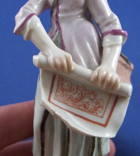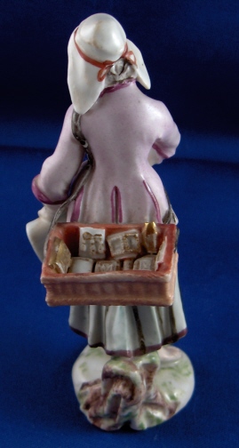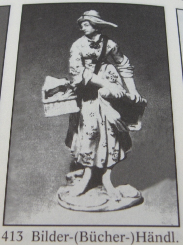 This is a figurine of a lady selling books and paintings made by Ludwigsburg. It was made between 1770 and 1790 and is marked with the CC mark in underglaze blue. Incised letter A and number 50 as well as painters mark G in overglaze brown. The figure is a bit under 5.5 inches tall, 2.25 inches wide and 2.5 inches deep. She is in great condition withsome firing cracks around the neck and a small chip to the painting she is rolling up in her hands. Please email me for more information or photos.