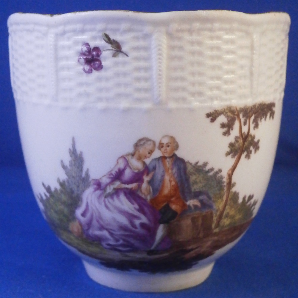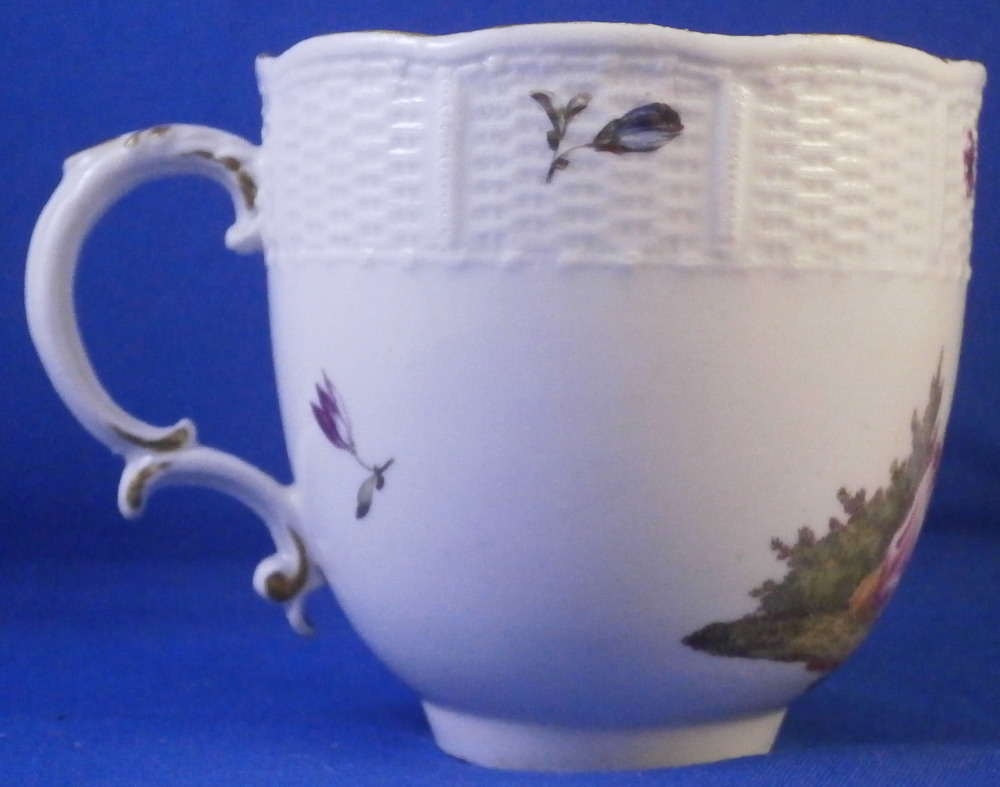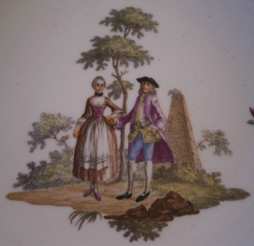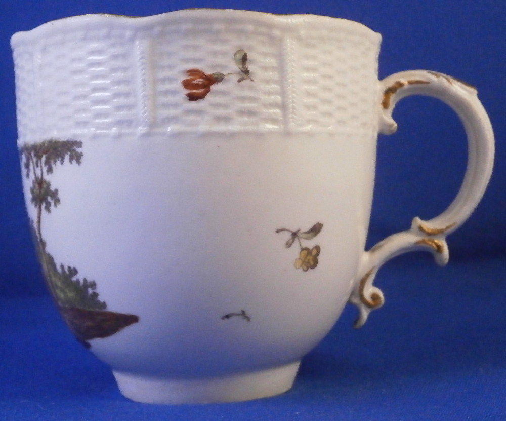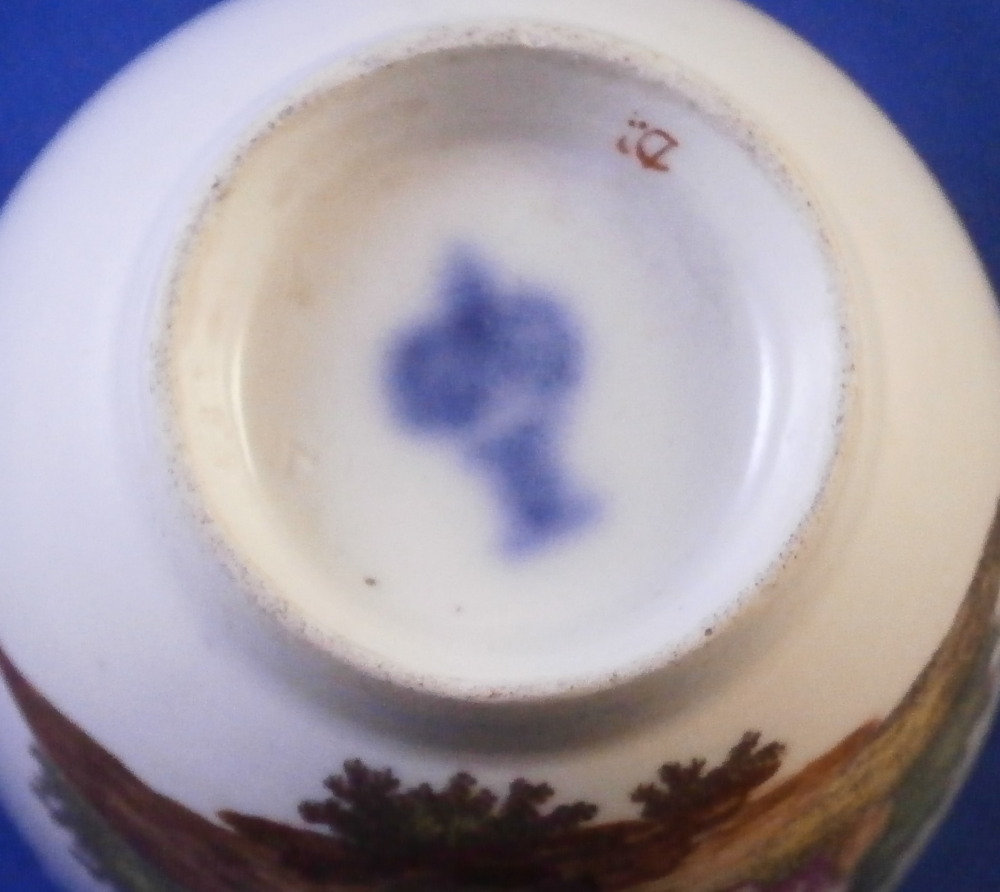 This is a cup and saucer made by Ludwigsburg in about 1765. The set is hand painted with a really nice polychrome Watteau style scenes of a couple in a landscape background. Some small flowers as well and a gold trim. Great handle shape also highlighted with a bit of gilding. Both the cup & the saucer are marked with the under glaze blue CC under the crown mark as well as impressed 4 and I3 and red D:. under the cup and impressed 7 and 10 and red half moon (painters mark of Ihle) under the saucer. The cup is 2.5 inches tall and 2.5 inches in diameter. The saucer is 5.5 inches in diameter and 1.125 inches tall. The set is in good condition with a chip to the inside rim of the cup as shown. This set came with the teapot I have on this site and they match perfectly so they are likely from the same service. Please email me for more information or photos.