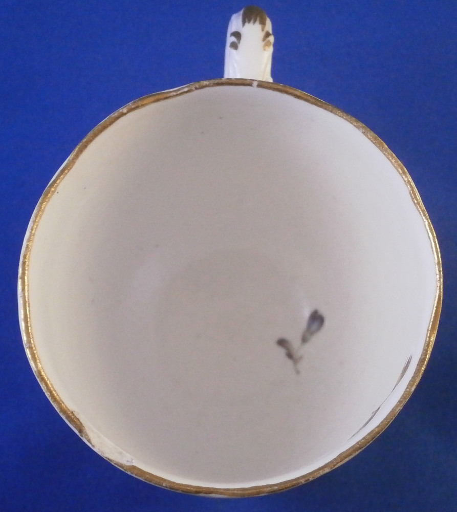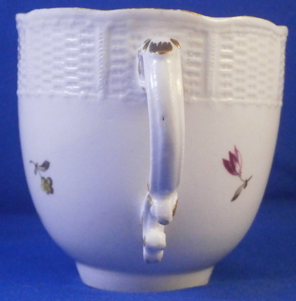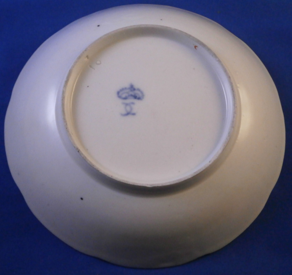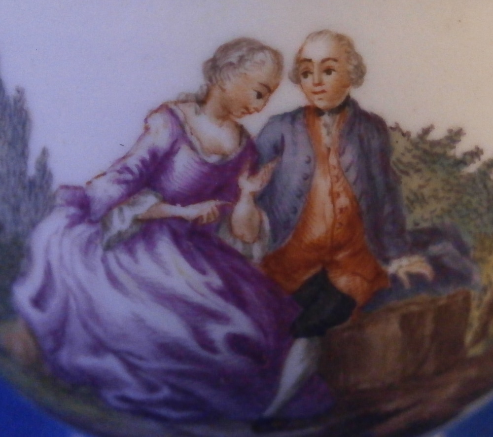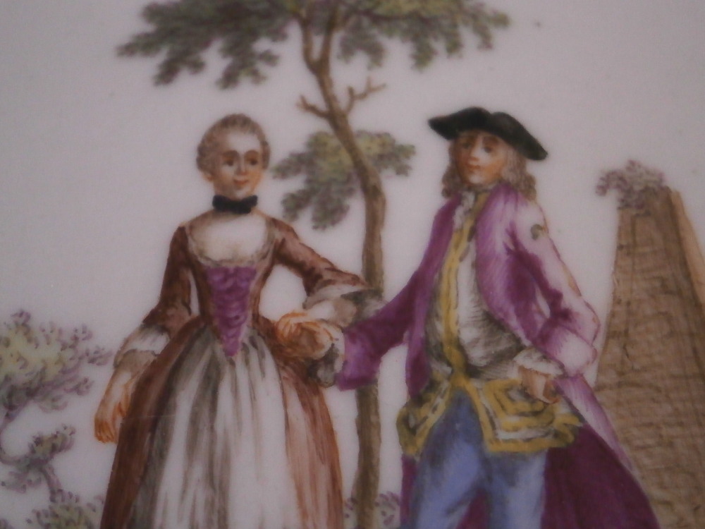This is a cup and saucer made by Ludwigsburg in about 1765. The set is hand painted with a really nice polychrome Watteau style scenes of a couple in a landscape background. Some small flowers as well and a gold trim. Great handle shape also highlighted with a bit of gilding. Both the cup & the saucer are marked with the under glaze blue CC under the crown mark as well as impressed 4 and I3 and red D:. under the cup and impressed 7 and 10 and red half moon (painters mark of Ihle) under the saucer. The cup is 2.5 inches tall and 2.5 inches in diameter. The saucer is 5.5 inches in diameter and 1.125 inches tall. The set is in good condition with a chip to the inside rim of the cup as shown. This set came with the teapot I have on this site and they match perfectly so they are likely from the same service. Please email me for more information or photos.