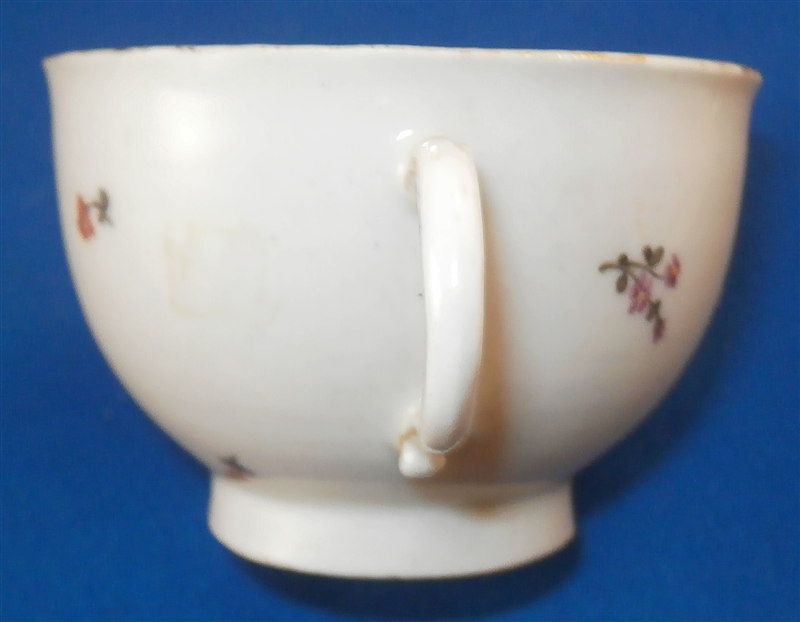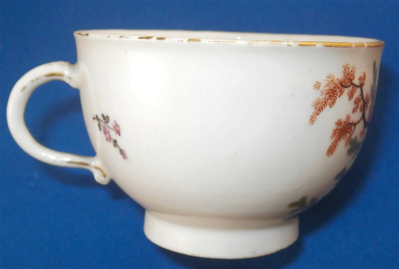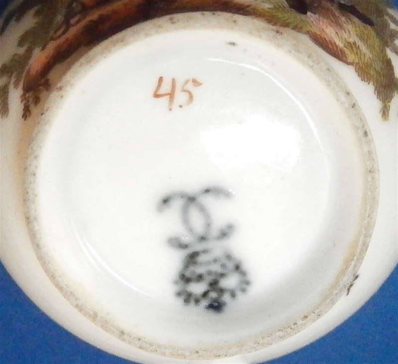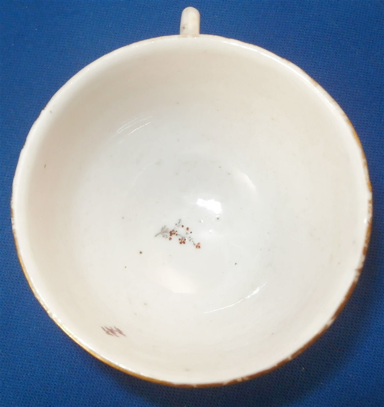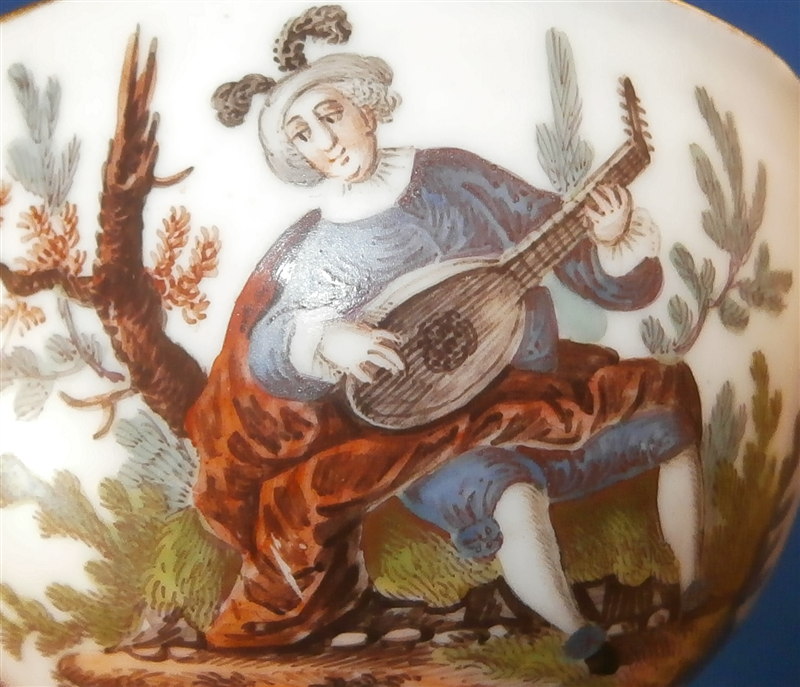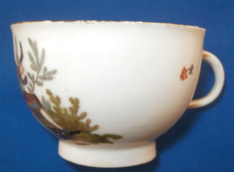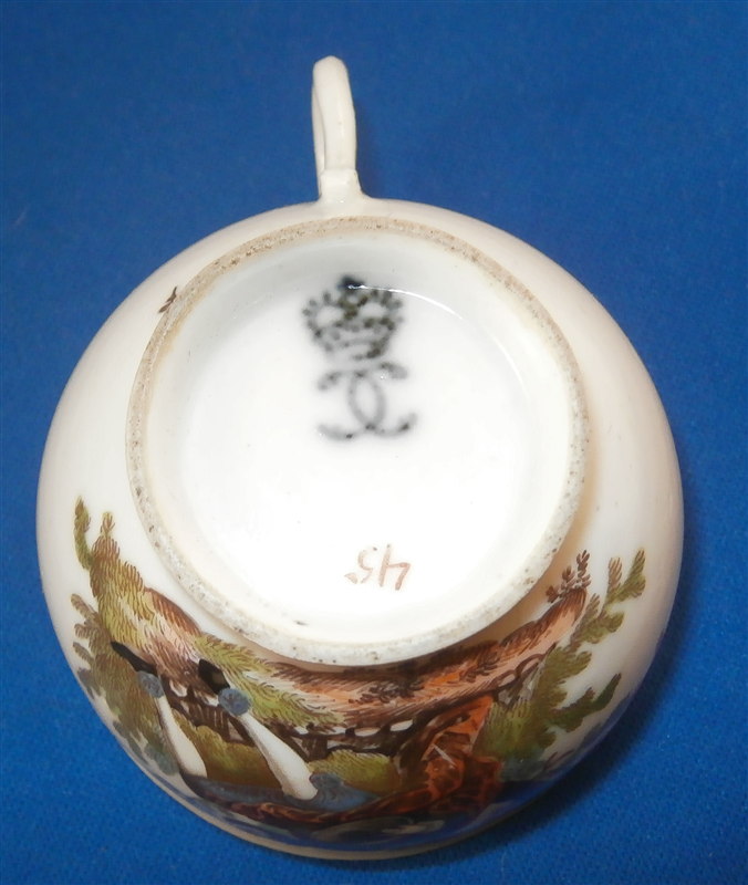 This is a superb and rare scenic cup made by Ludwigsburg around 1762. So a very early piece for them! The rare thing is that we can for sure say who painted this piece as it is definitely by the hand of the famous Andreas Philipp Oettner . The piece is handpainted with a top quality polychrome scene in the front including a gentleman playing a lute (I think) while sitting in a landscape surrounding. A few scattered small flowers fill the rest of the space as well as the inside. Gold trim to the edge. The cup marked with the CC mark under the crown in underglaze blue as well as a red 45 as a mark to keep items together during production - the saucer would have had the same number - something they only used during the first three years of production. The cup is of a rare size and I don't recall ever seeing a kid's cup by them before - it is 1.625 inches tall and 2.375 inches in diameter. It is in great condition with wear to the gold trim on the edge. Please email me for more information or photos.