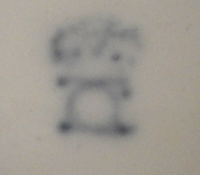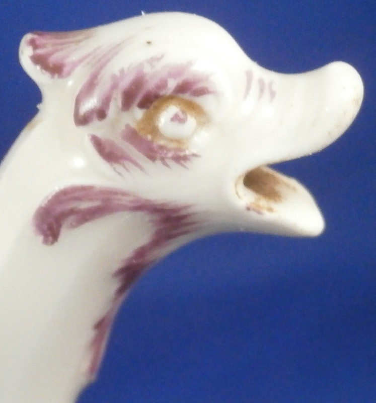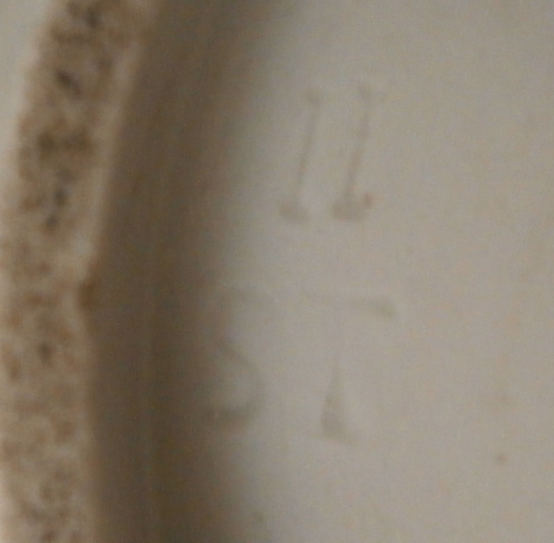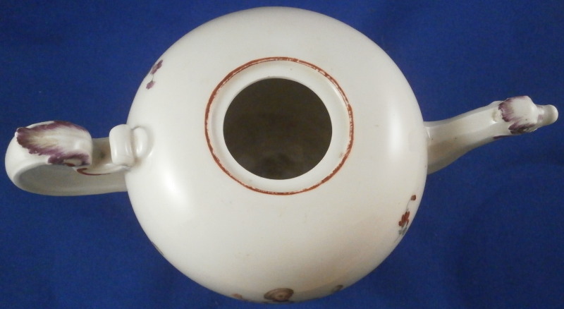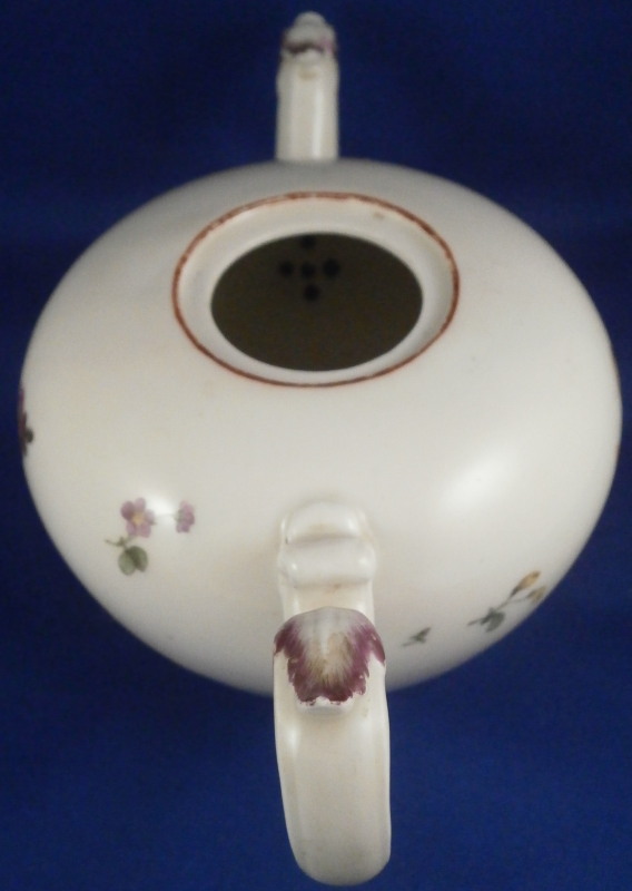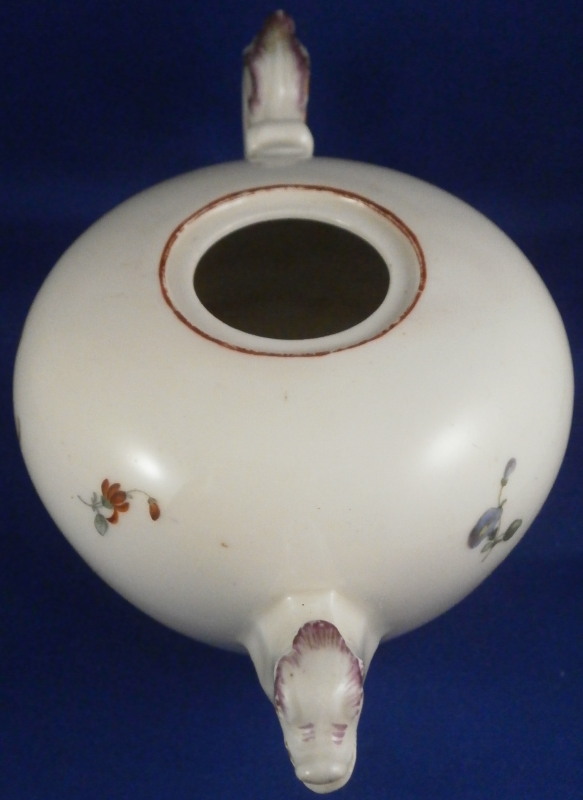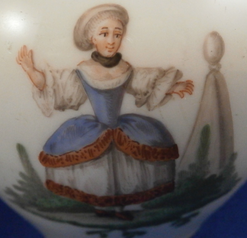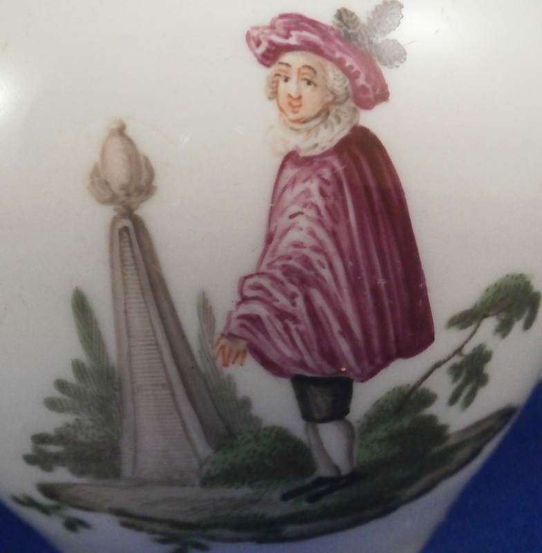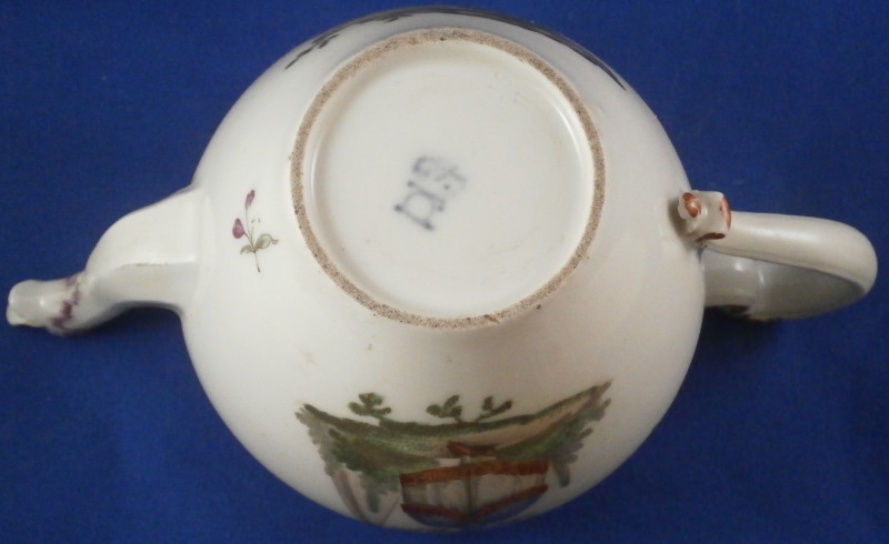 This is a fun teapot made by Ludwigsburg in the 18th century. It is hand painted with two polychrome scenes - one of a lady dancing in front of a column in a landcape surrounding and the other of a gentleman standing in front of a column in a landscape surrounding. I guess not much has changed in the last 250 years :) A few small single flwoers scattered about and a nice rust color trim to the top rim around the lid opening and along the side of the handle. The figural apout has a puce trim to it as does the top of the handle. What makes this tea pot special is the fact that is was painted by the famous Andreas Philipp Oettner which is pretty neat. The pot is marked underneath with the under glaze blue CC under the crown as well as some impressed marks as shown. The pot is just under 3.5 inches tall, 6.875 inches from handle to spout and about 4 inches in diameter. The piece is in superb condition but sadly it is lacking its lid! There is a little bit of expected wear but the scenes are not affected! Please email me for more information or photos.