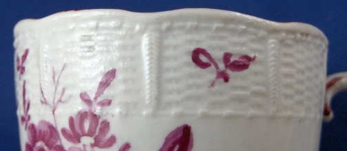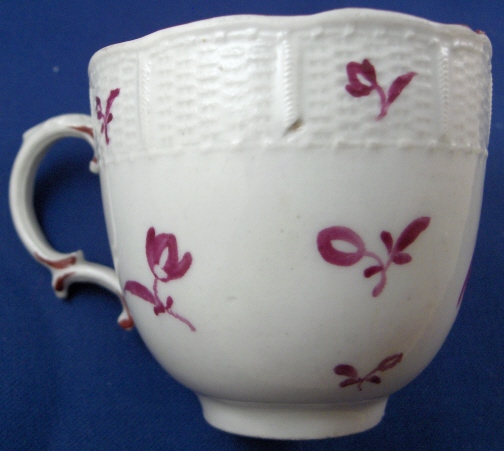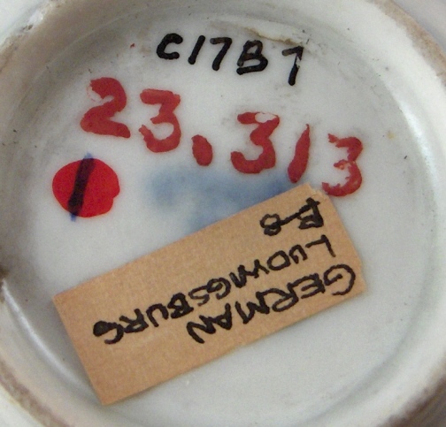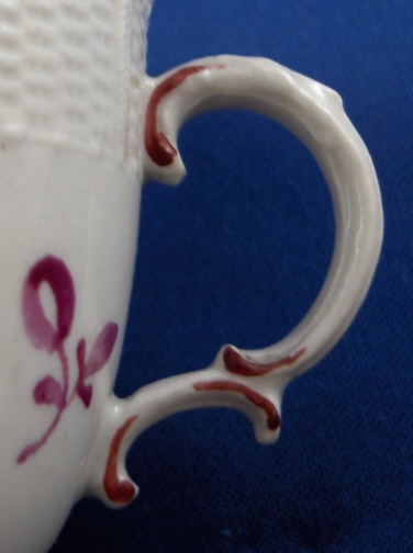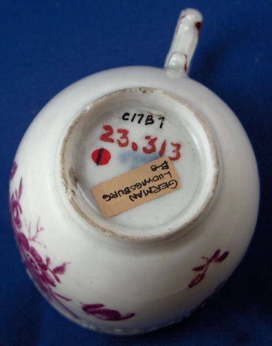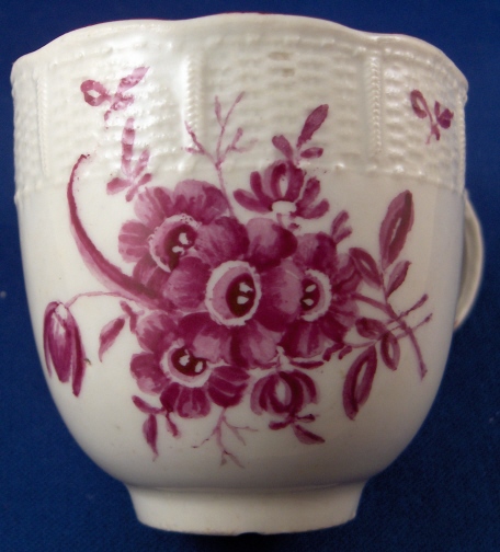 This is a cup made by Ludwigsburg in the 18th century. It is handpainted with a large floral arrangment as well as lots of small flowers scattered throughout. The rim has the typical reddish brown trim and a basketweave design to the top. Nice handle shape, too. It is likely marked with the CC mark under the crown in underglaze blue but it could just be the CC mark by itself. Impossible to see with the sticker in the way. Doesn't really matter too much if at all :) Some old museum ID numbers underneath as well. The cup is 2.625 inches tall and 2.625 to 2.75 inches in diameter - a bit oval from the firing. The cup is in great condition with a small chip to the top rim from the making which is glazed and has the rim painting over it and some very minor chips to the foortring. Please email me for more information or photos.