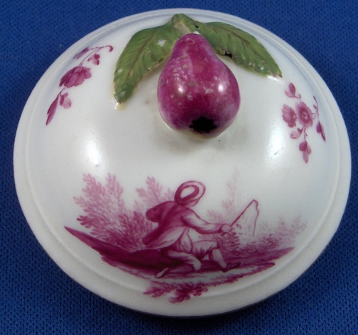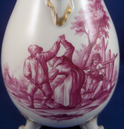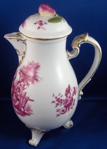 This is a creamer with its lid made by Ludwigsburg between 1765 and 1770. The pot is not marked but came with the rest of the set and is quite obviously a Ludwigsburg piece. The main body is decorated with a large handpainted puce scene in the front of a couple dancing and a man playing a fiddle. There are also two flower arrangements on the sides. The nicely shaped feet, spout and handle have gold trim on them. Puce was one of the hardest colors to fire because the slightest temperature difference changed the shade of it. The large scenes are of superb quality and some of the best I have seen on Ludwigsburg. The lid has a small scene with a man fishing on it as well as two small flowers and a pear finial with two leaves. The pot with lid is 7 inches tall and 3.5 inches in diameter. Amazingly the pot is in super condition with just two tiny paint spots missing on the stem and leaf of the finial. Please email me for more information or photos.