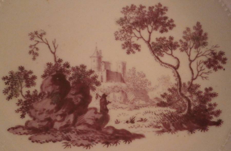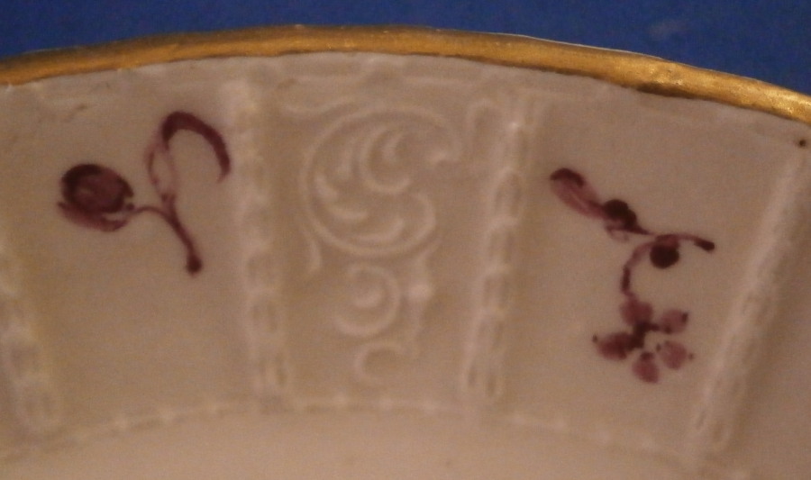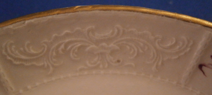 This is a nice saucer made by Ludwigsburg in the 18th century. It is marked with the under glaze blue interlaced double C mark under the crown as well as some impressed marks as shown. The saucer is hand painted with a large scene in puce in the center including a building and a person in a superb landscape surrounding. The rim has some really nice molded detail to the paste in relief with small single puce flowers in between. Not a trim one sees too often by them. Gold trim to the edge. The saucer is 1.125 inches tall and 5.125 inches in diameter. It is in superb condition with some minor manufacturing imperfections and a teeny nibble to the outside edge as shown. Please email me for more information or photos.