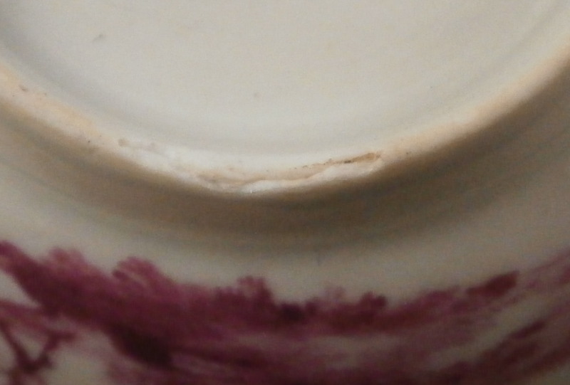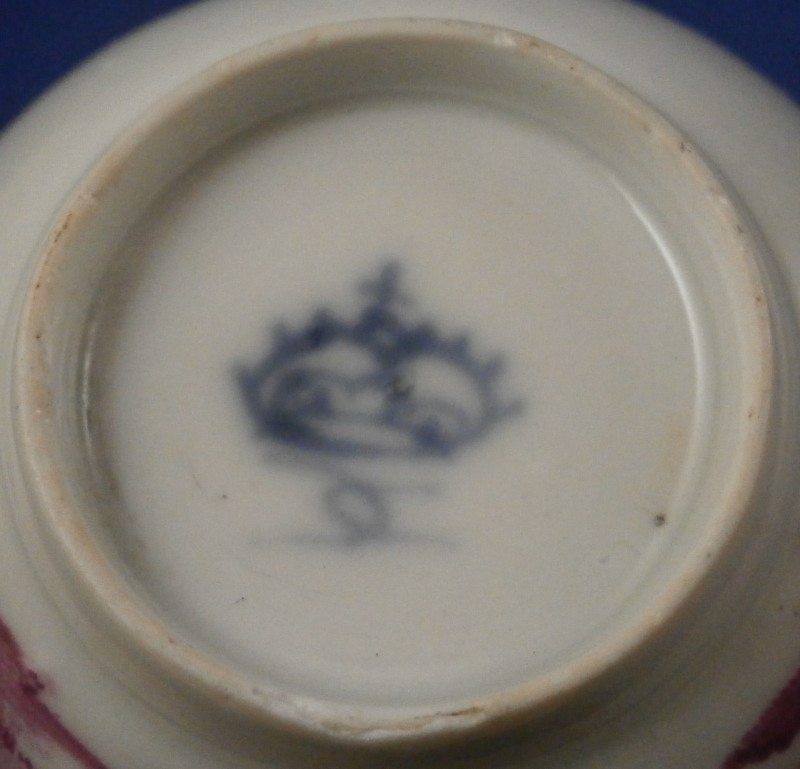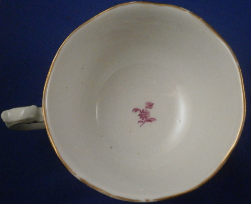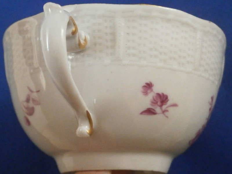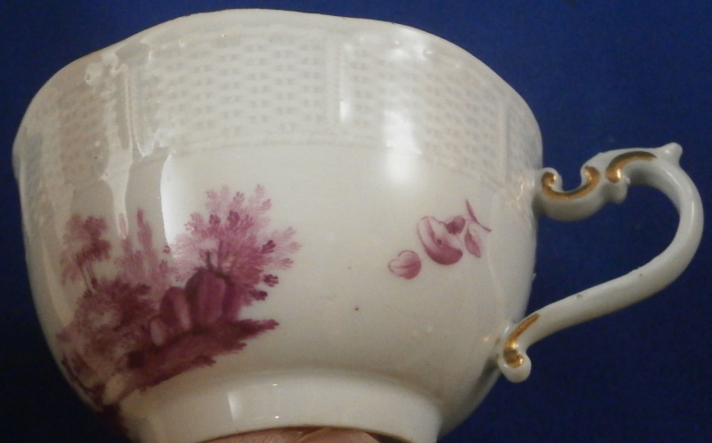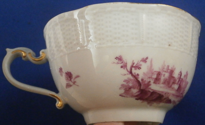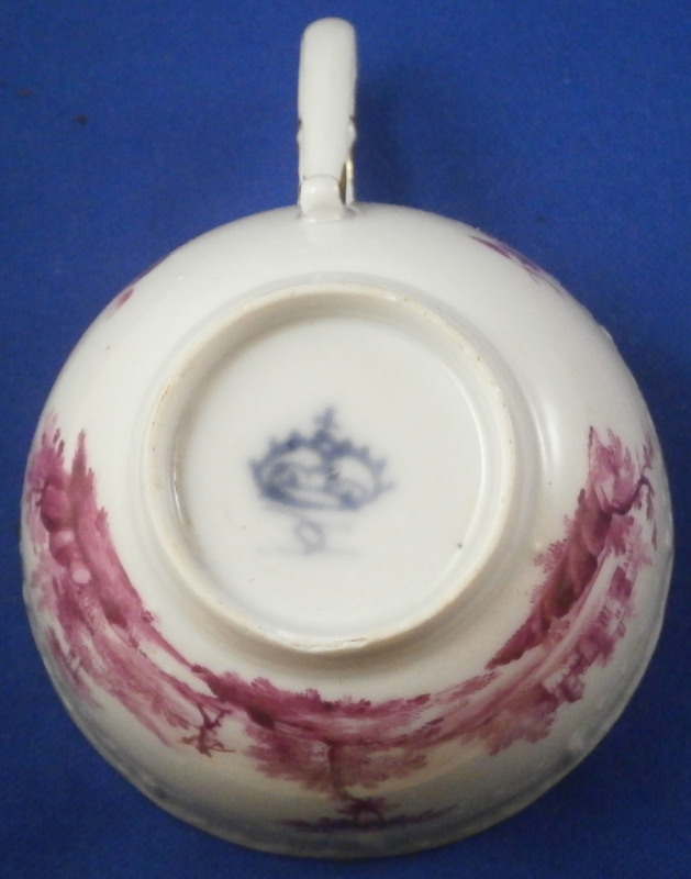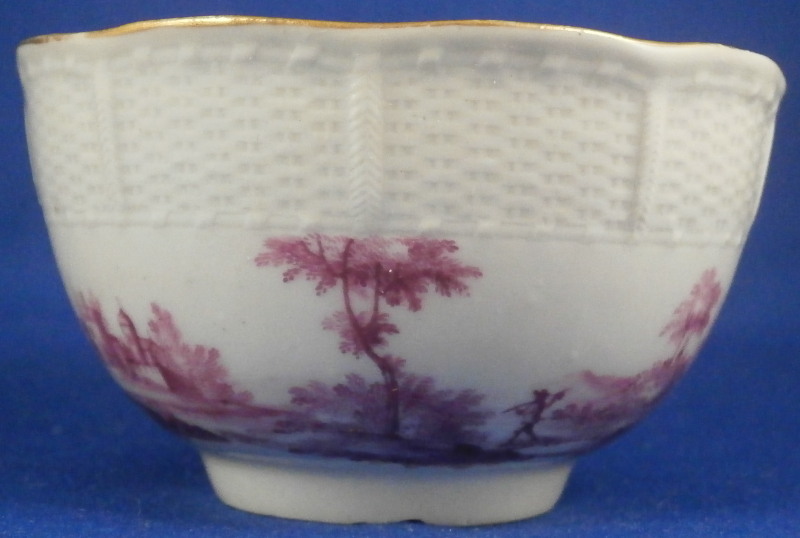 This is a cup made by Ludwigsburg in the 18th century. It is hand painted with a large and very well done puce landscape scene including a building, a person walking as well as the usual trees and rocks. The rim has a basket weave design to it and there is a gold trim to the top edge. Nice handle shape, too. It is marked with the CC mark under the crown in underglaze blue as shown. The cup is 1.75 inches tall and 3 inches in diameter. The cup is in great condition with a chip to the foot ring which isn't bad at all and a tiny bit of wear to the gold trim. Please email me for more information or photos.