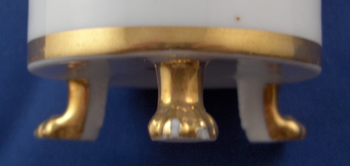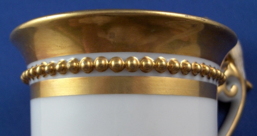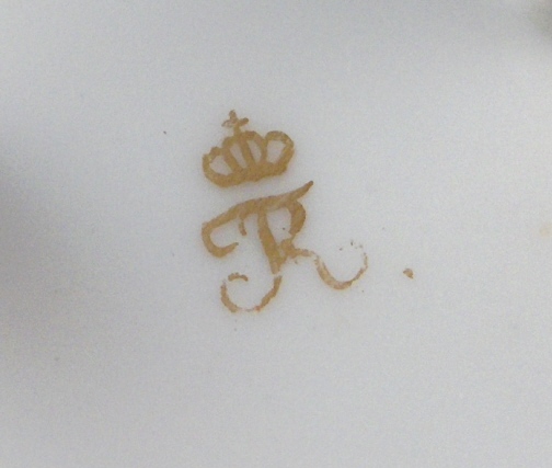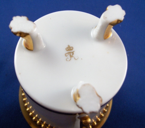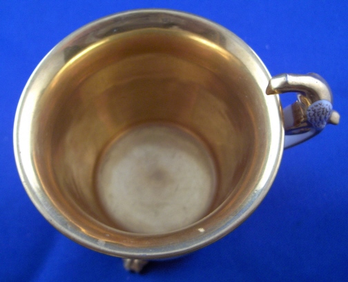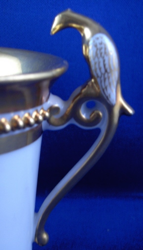 This is a great single cup made by Ludwigsburg around 1810. I bought this piece because the shape is superb but also because of the mark. The later Ludwigsburg pieces are very hard to find and while I have seen this mark in books I have not seen it in person so it was a must have for the site :) The cup is really nice with a bird on top of the handle, a "pearl" trim to the top and lots of nice gilding that is in great condition! It sits on three nice feet which just adds to the charm. The cup is in great condition all around with just a few nibbles to the feet nothing a little gilding would completely hide. The piece is marked with the FR. under the crown for Friedrich Rex in gold. The cup is 3.375 inches tall (including the bird on the handle) and 2.875 inches in diameter. Please email me for more information or photos.