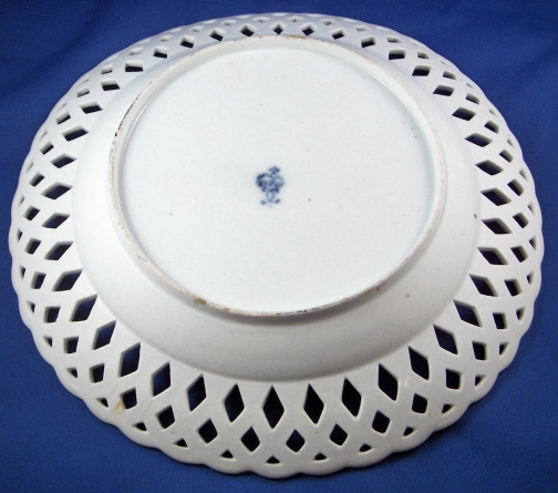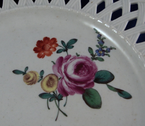 This is a rare reticulated plate made by Ludwigsburg around 1775. It is handpainted with a large floral arrangement in the center as well as three smaller flowers. The reticulated rim has a very nice relief design to it and the typical brown trim to the edge. It is marked with the CC mark under the crown in underglaze blue and the impressed letters IP. The plate is about 1.5 inches tall and has a diameter of 10 inches. It is in perfect condition. Please email me for more information or photos.