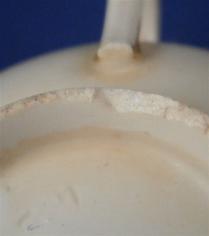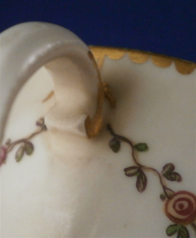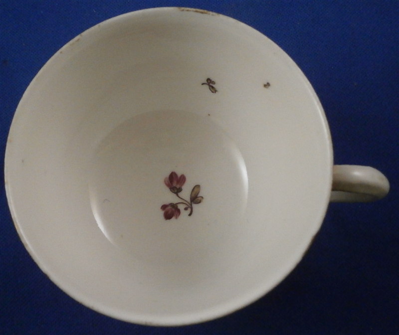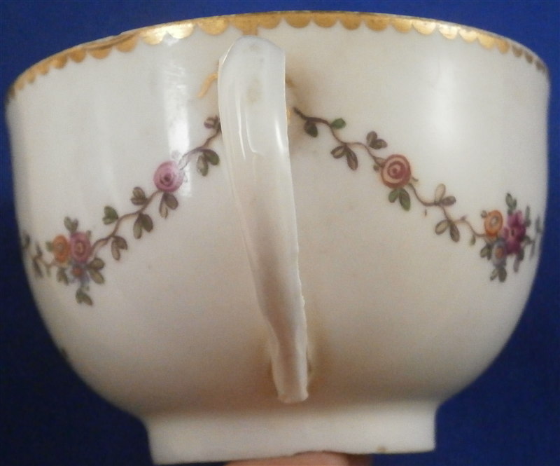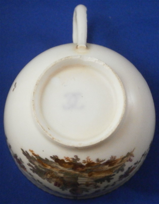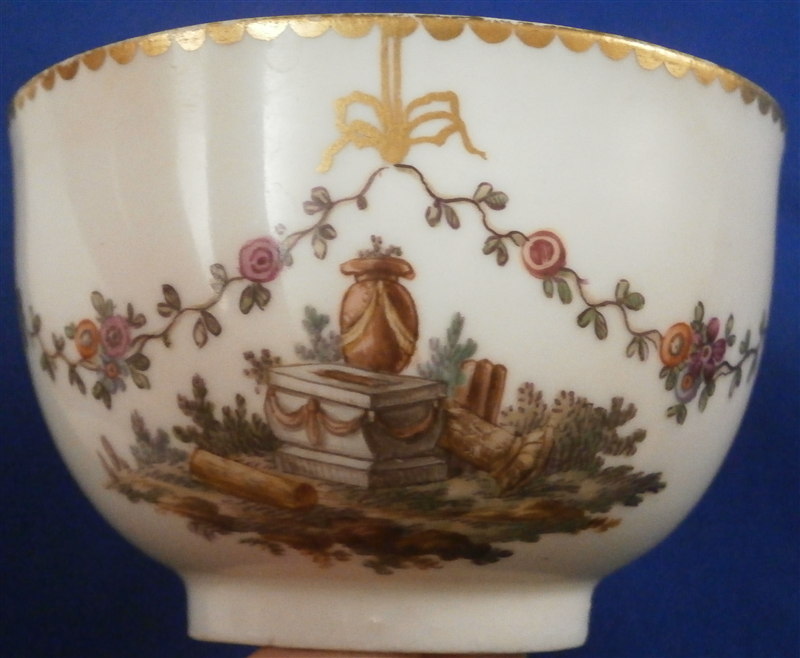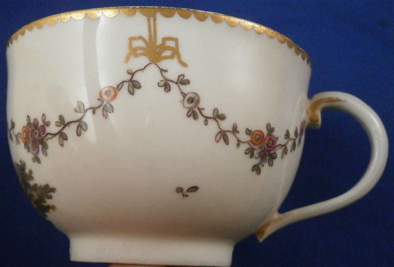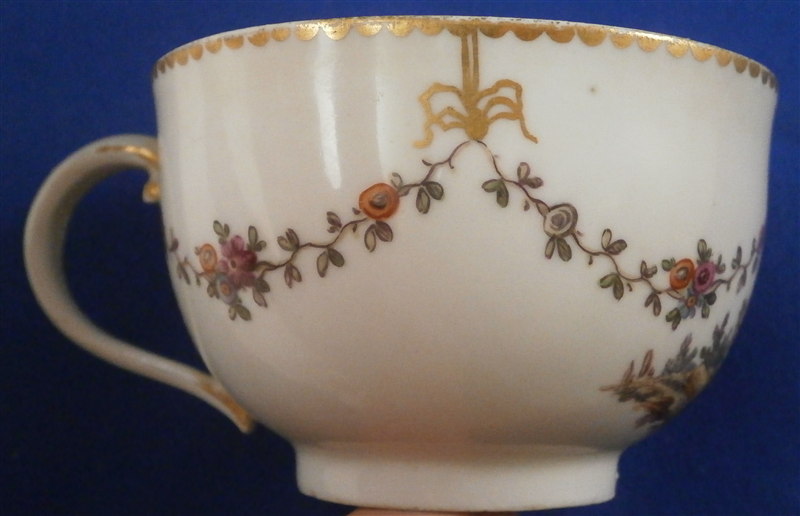 This is a great single cup made by Ludwigsburg around 1790. The cup is really well painted with a ruin type scene in the front including a base, a vase and some fallen over columns in a landscape surrounding. The rest of the cup has a nice floral garland design all around with a single flower to the inside and gold trim to the top edge. The cup is in great condition with a firing flaw to the top edge - looks like it got stuck to something else in the kiln and a chip to the foot ring. It is marked faintly with the interlaced CC mark and some impressed numbers. The cup is 1.875 inches tall and 2.875 inches in diameter. Please email me for more information or photos.