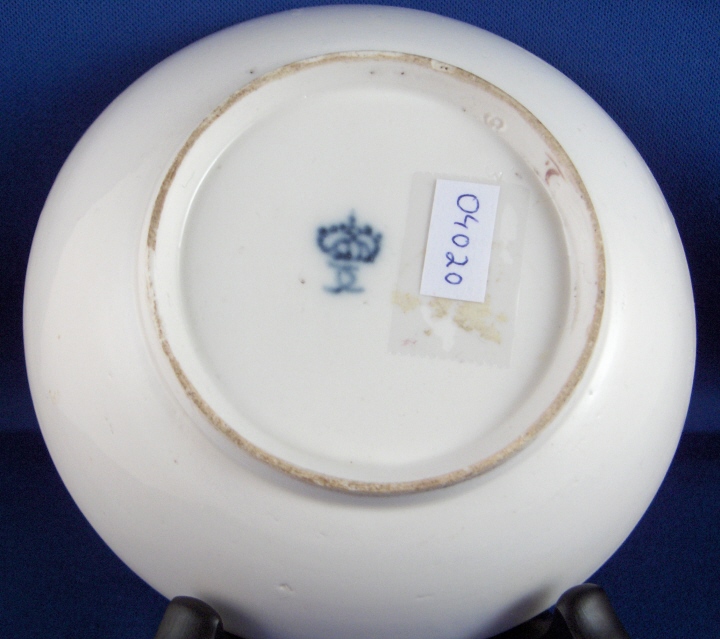 This is a saucer made by Ludwigsburg. It was made between 1759 and 1770 and is marked with the CC mark under the crown in underglaze blue. Impressed number 8 and painters mark of a half moon with a line under it and a dot. Handpainted with a scene of an old man and lady in a landscape background and a gold trim. The saucer is 1.25 inches tall and 4.75 inches in diameter. It is in perfect condition with one spot of wear to the outside so it doesn't really matter. Please email me for more information or photos.