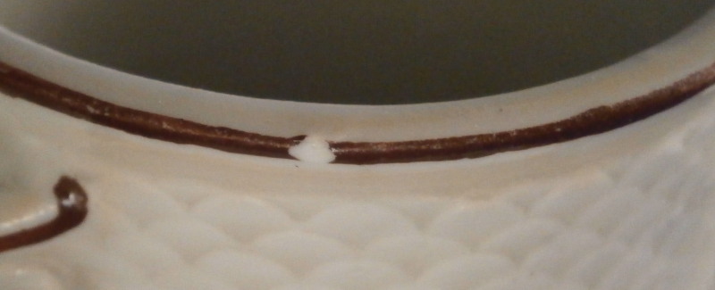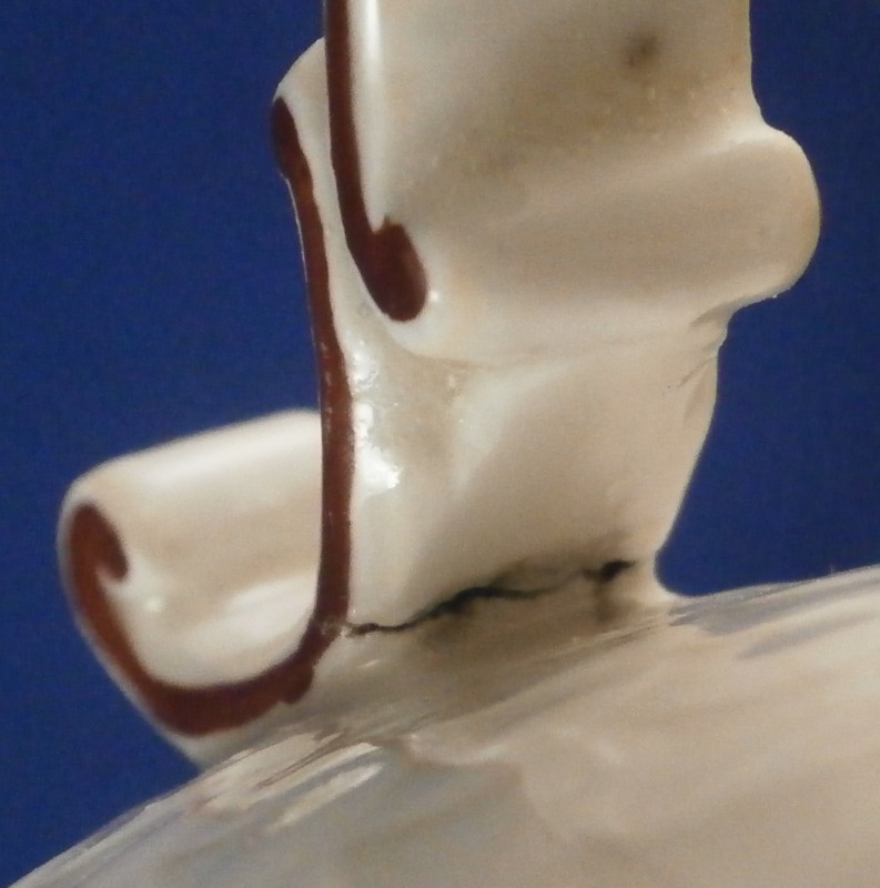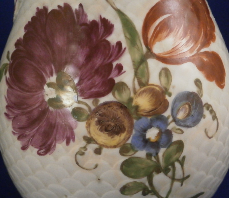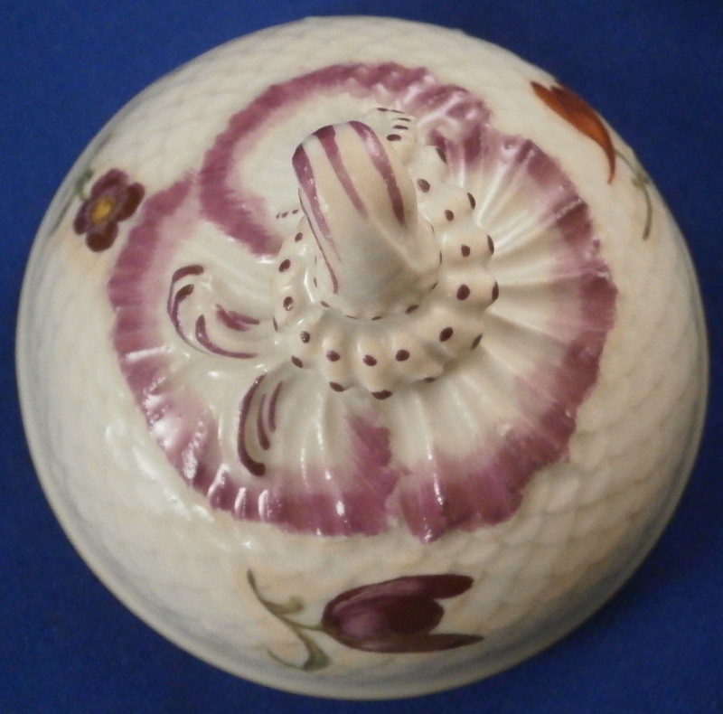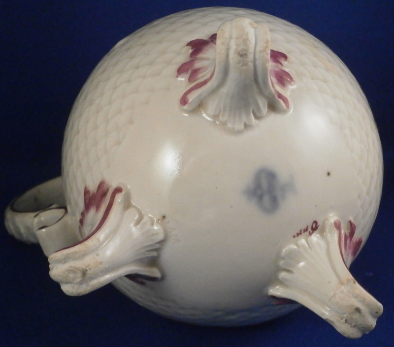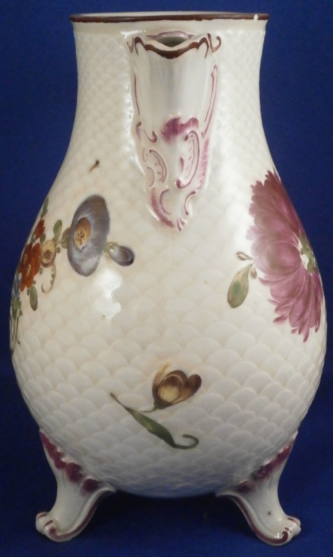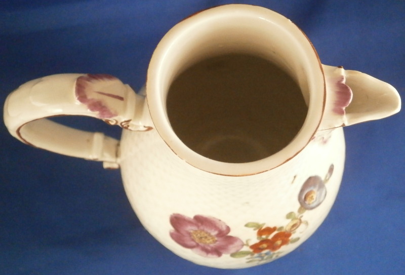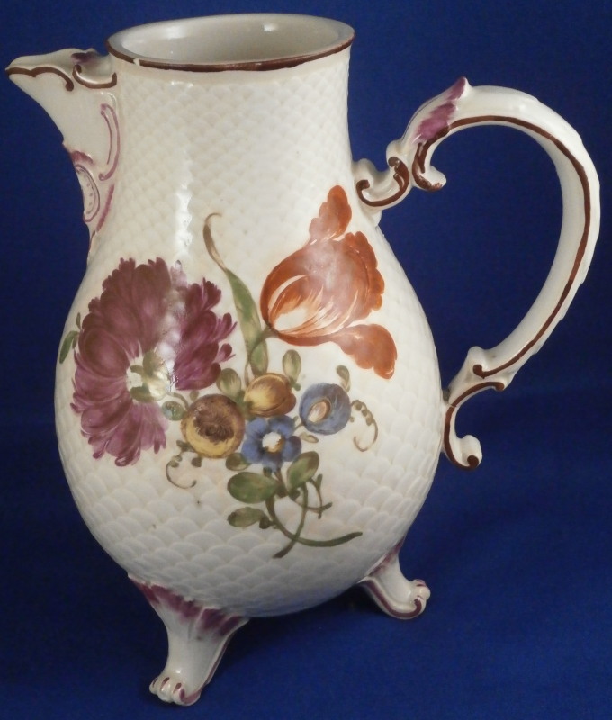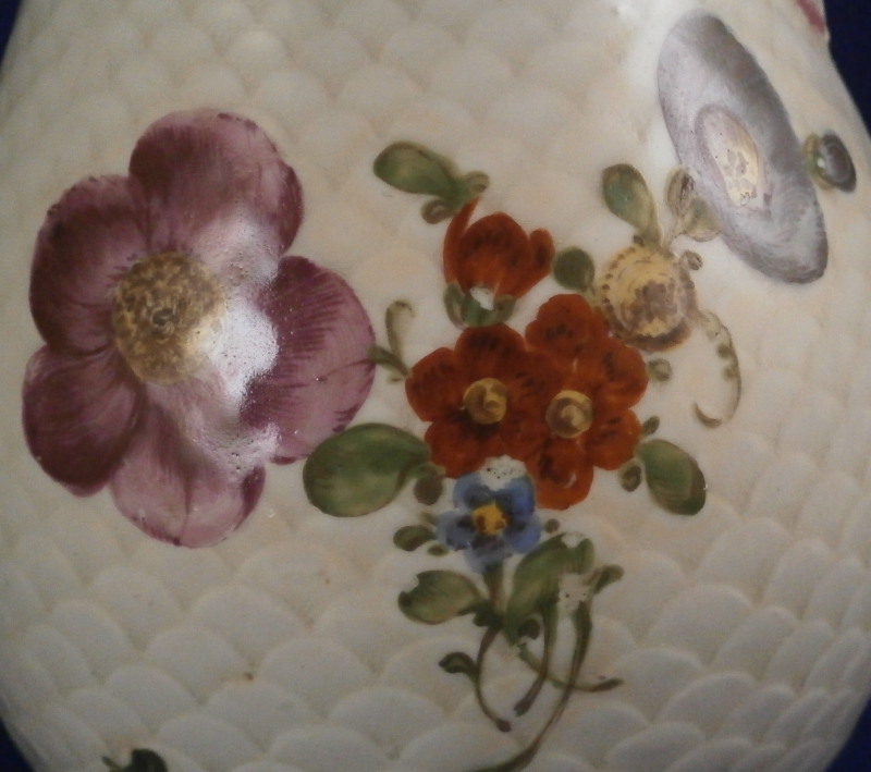This is a coffee pot with lid made by Ludwigsburg around 1760. The pot is marked with the CC mark under the crown in underglaze blue as well as some impressed marks as shown and a painter's mark. The main body of the coffee pot is decorated with the famous scale design to the paste called Schuppenmuster in German and it has a large hand painted floral arrangement on either side as well as a smaller single flower. The nicely shaped feet, spout and handle have puce trim on them. I always love the fact that their pieces sit on feet - gives it a much more fun look! The lid has the some hand painted flowers on it as well and nice finial with some puce trim to it. The pot with lid is 8.5 inches tall and 4 inches in diameter. The piece is in superb condition with a tiny chip to the top edge of the pot, two meaningless chips to the inside rim of the lid and some manufacturing flaws - one firing line to the inside spout and a large one to the bottom of the handle - not sure if the handle is completely cracked through because of it but it is totally stable and does not budge unlike a normal hairline. Three spots where the paint has flaked a normal issue to their early wares! The set displays perfectly and is stunning! Please email me for more information or photos.