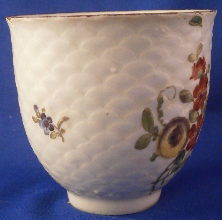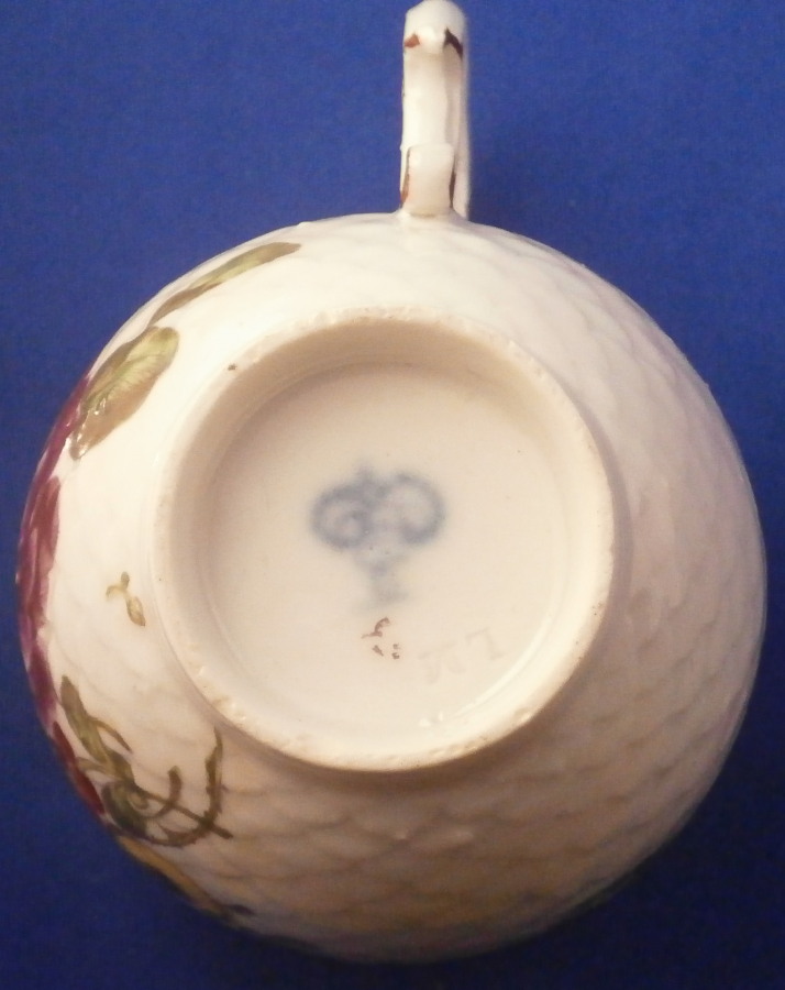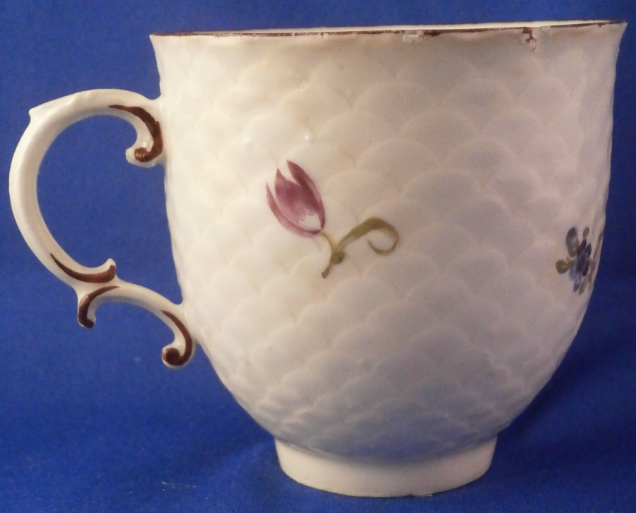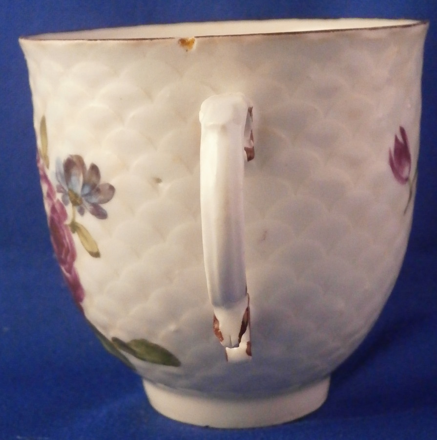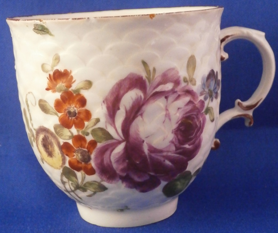 This is a great cup and saucer made by Ludwigsburg in the 18th century around 1760. It is from the very sought after scale relief design ( Schuppenmuster ) series that you don't see very often at all. The set has the scale design to the paste all around with a nice large hand painted floral arrangement as well as some smaller flowers and a brown trim to the egde. The cup has a fancy handle also highlighted with a bit of brown trim. The set displays nicely with the saucer having four small chips to the outside edge and the cup 5 small shallow outside edge chips to the top rim. Still looks great and is not obvious when on display. The cup and the saucer are marked underneath with the under glaze blue CC under the crown as well as various incised / impressed marks as well as some painter's marks as shown. The saucer is 1.375 inches tall and 5.5 inches in diameter and the cup is 2.75 inches tall and has a diameter of just over2.75 inches. Please email me for more information or photos.