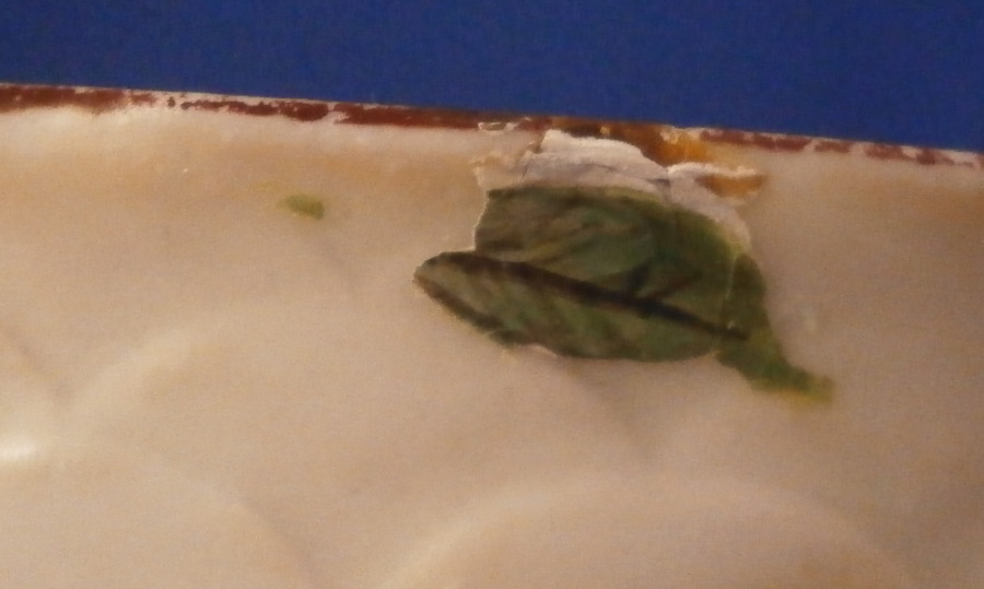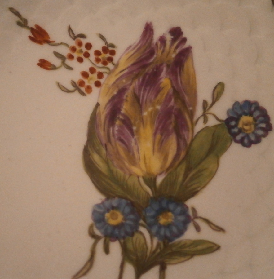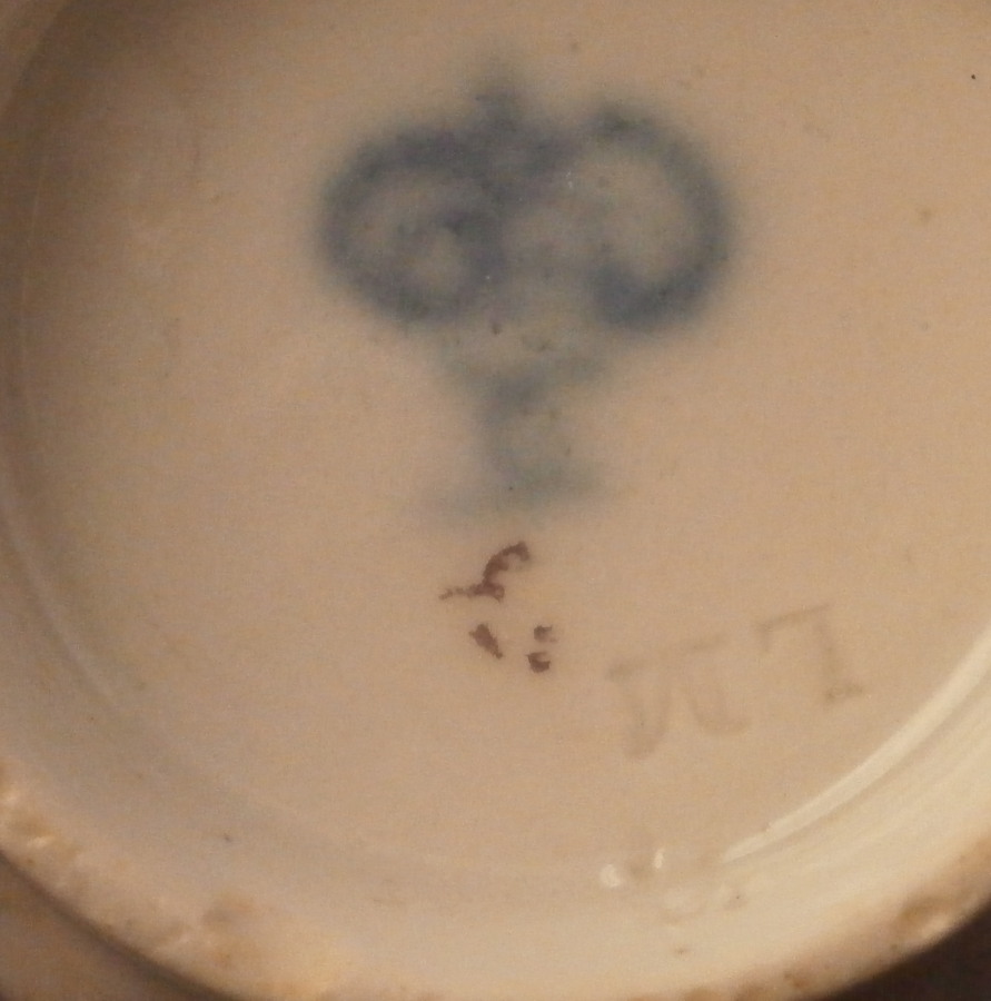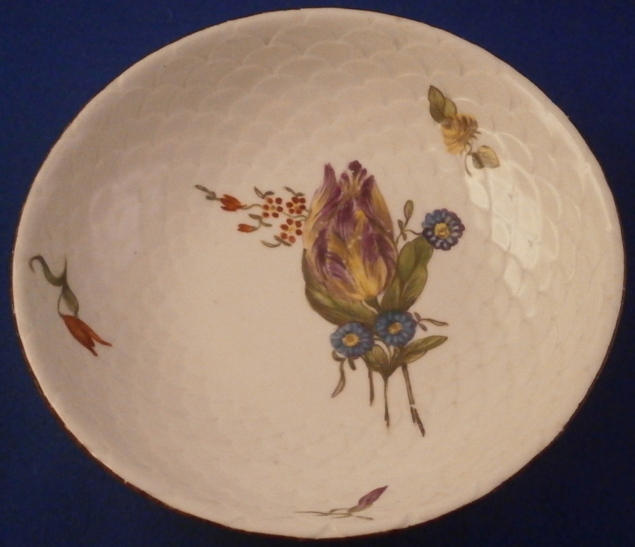 This is a great cup and saucer made by Ludwigsburg in the 18th century around 1760. It is from the very sought after scale relief design ( Schuppenmuster ) series that you don't see very often at all. The set has the scale design to the paste all around with a nice large hand painted floral arrangement as well as some smaller flowers and a brown trim to the egde. The cup has a fancy handle also highlighted with a bit of brown trim. The set displays nicely with the saucer having four small chips to the outside edge and the cup 5 small shallow outside edge chips to the top rim. Still looks great and is not obvious when on display. The cup and the saucer are marked underneath with the under glaze blue CC under the crown as well as various incised / impressed marks as well as some painter's marks as shown. The saucer is 1.375 inches tall and 5.5 inches in diameter and the cup is 2.75 inches tall and has a diameter of just over2.75 inches. Please email me for more information or photos.