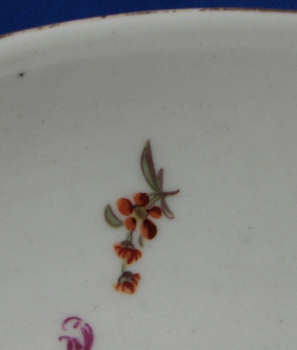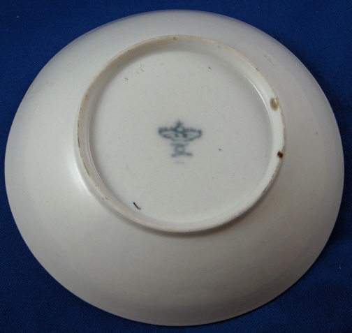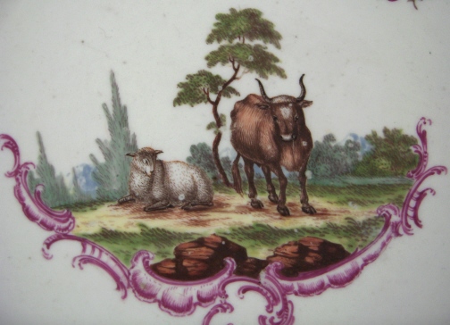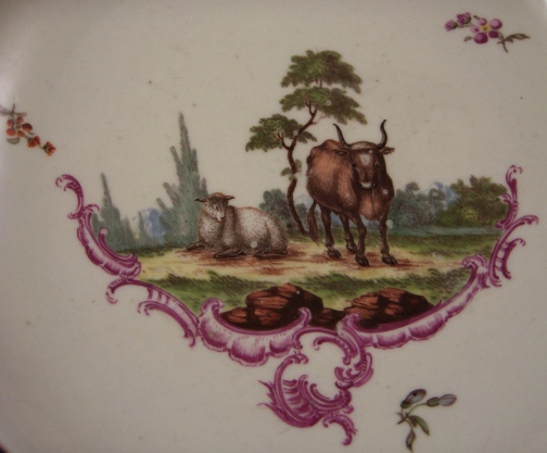 This is a great saucer made by Ludwigsburg in the 18th century. It is handpainted with a top quality scene including a bull and a sheep in a landscape surrounding with some puce scrolling underneath as well as three small flowers and a gold trim. The saucer is marked with the CC mark under the crown in underglaze blue as well as an impressed RSK near the footring. It is 1.25 inches tall and 5.25 inches in diameter and in super condition with just a bit of wear to the circular high point in the scene where the paste had particles that stuck out a bit. Some wear to the gold trim of the edge as well. It displays superbly! Please email me for more information or photos.